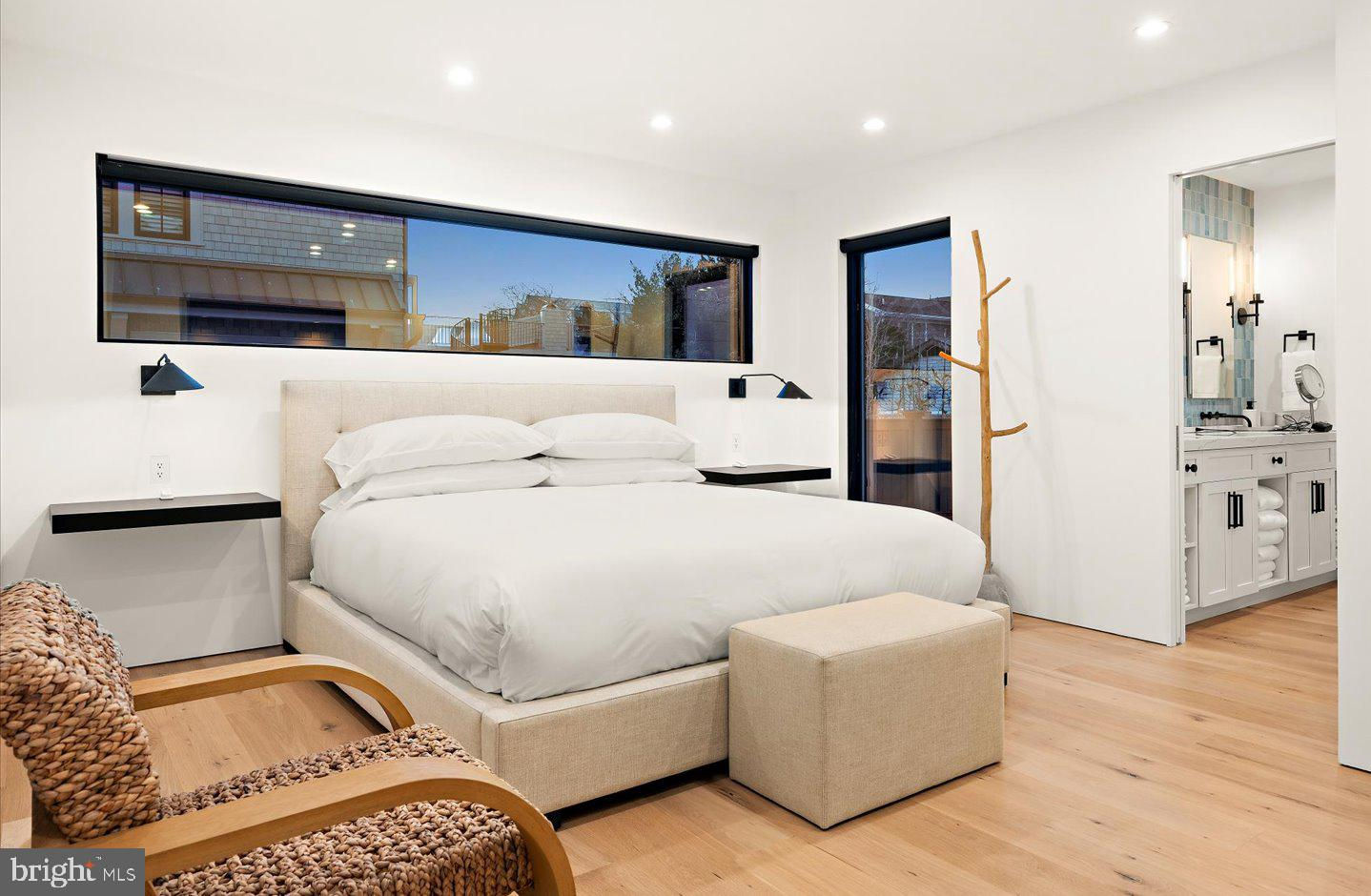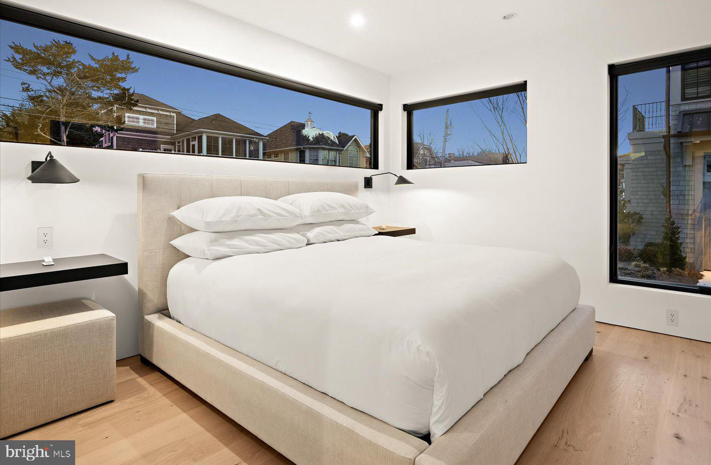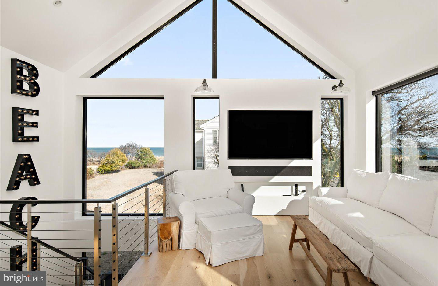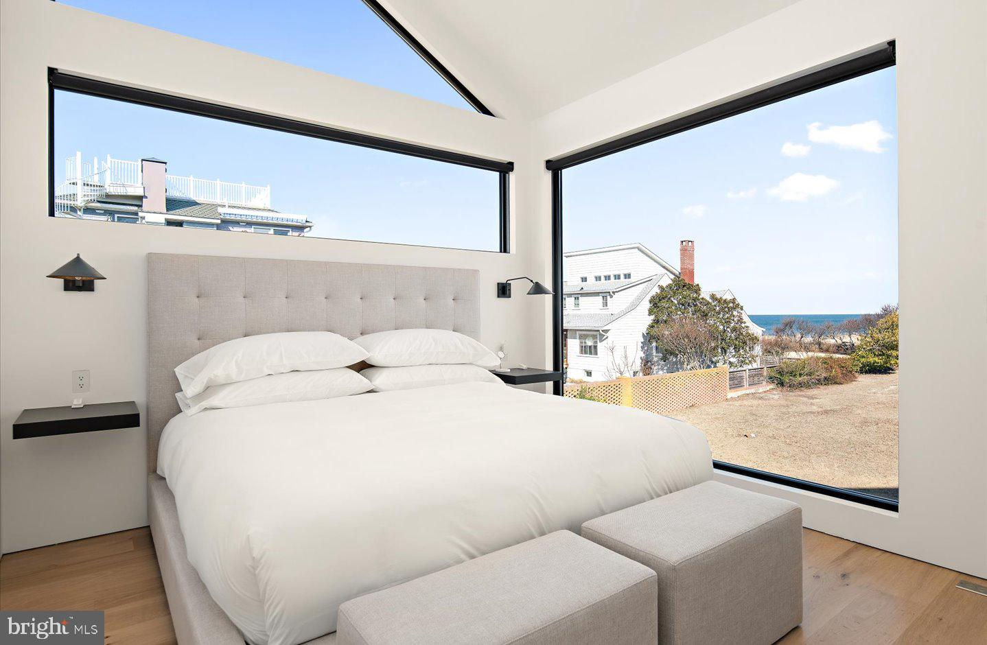 Welcome to 1 New Castle Street, an exquisite beach cottage masterfully transformed to blend timeless charm with modern sophistication. Originally a quaint 1950s seaside retreat, this residence has been meticulously re imagined, showcasing contemporary design elements and luxurious finishes. Upon entering, you're greeted by classic white oak flooring that flows seamlessly through bright, open spaces adorned with floating shelves, innovative Lutron lighting and home electronics system with smart TV's, sound system, security cameras, and more. A striking floating staircase with cable railings serves as a centerpiece, enhancing the home's modern aesthetic. The main level offers a welcoming gathering area featuring a sleek built-in beverage center and a convenient powder room. Three spacious, light-filled bedrooms provide ample built-in storage with laundry chutes, complemented by two spa-inspired bathrooms designed for ultimate relaxation. Ascending to the second level reveals a glamorous living area with soaring vaulted ceilings and expansive floor-to-ceiling custom windows that frame breathtaking ocean views. A modern gas fireplace adds warmth and ambiance to this stunning space. Adjacent lies a chef's dream kitchen, boasting stainless steel countertops, a commercial-grade Wolf range, a Sub-Zero refrigerator with glass doors, dual dishwashers, an ice maker, beverage drawers, dual sinks, and abundant custom cabinetry. This culinary haven opens to an exterior balcony, inviting you to savor the sights and sounds of the ocean waves. The second level also includes a private primary suite, accessible via a separate entrance at the rear of the home. This serene retreat features a luxurious en-suite bath, a custom walk-in closet, and more spectacular ocean vistas, offering complete solitude. Descending below grade, you'll find a tastefully finished basement equipped with multiple washers and dryers, a sink, built-in cabinetry, and a custom walk-in linen closet, ensuring ample storage and functionality. The exterior of the property boasts a spacious yard, perfect for sun-soaked relaxation. Additionally, a climate-controlled flex space currently serves as an executive office, while a separate storage area accommodates scooters, bikes, and beach essentials. This exceptional home caters to discerning buyers seeking a distinctive blend of classic charm and contemporary luxury in a prime coastal setting just one house off the ocean.