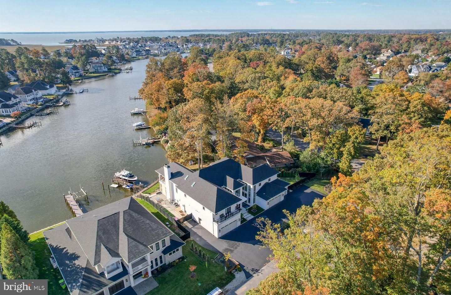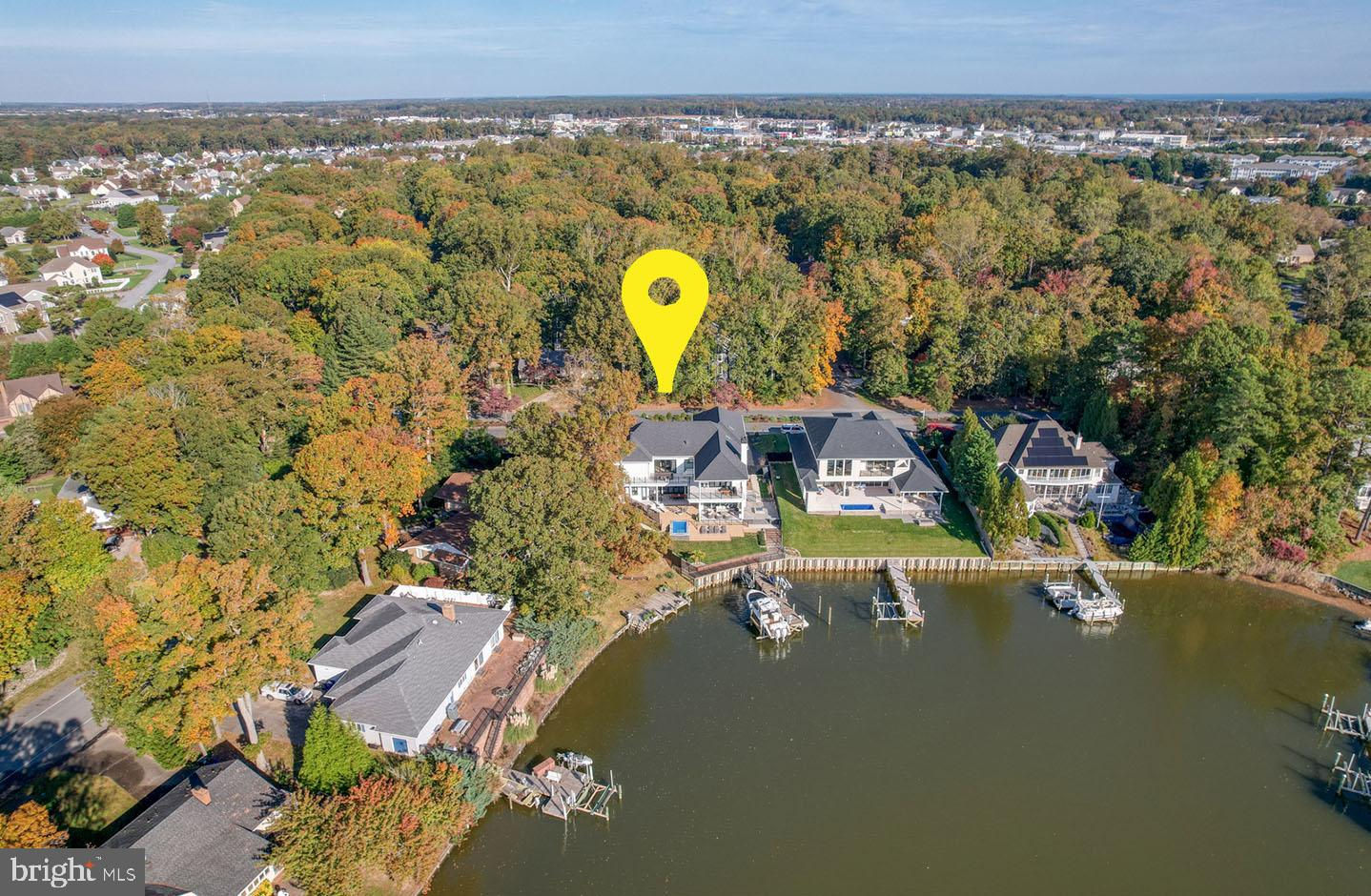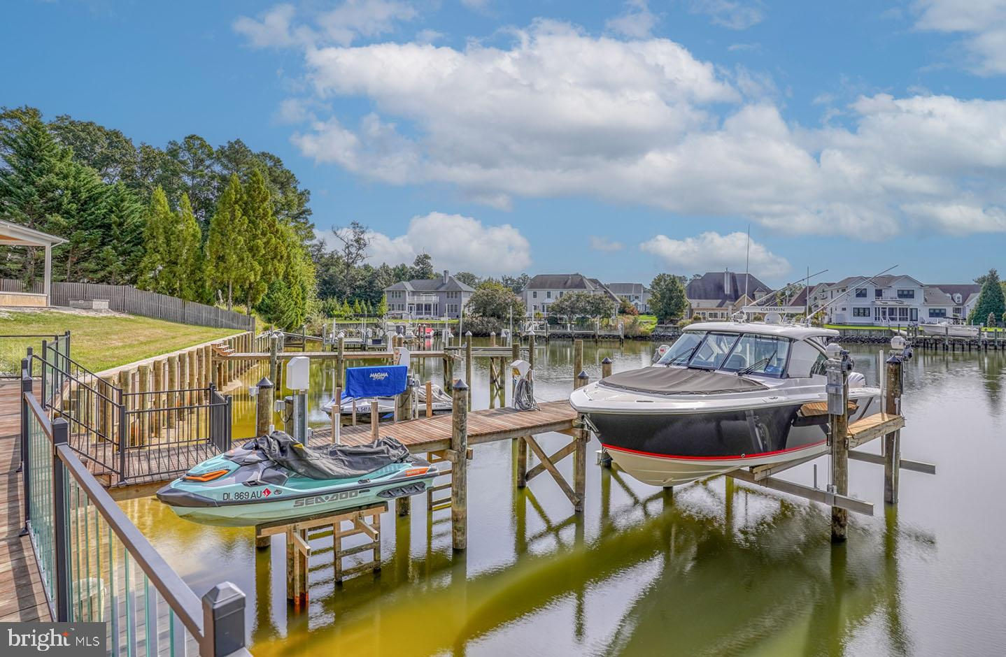No expense has been spared in this exquisite waterfront custom-built home situated on a premium lot in the coveted Rehoboth Beach Yacht & Country Club. This modern masterpiece was designed with the most discerning buyer in mind with multiple indoor and outdoor living spaces, 4 spacious bedrooms, 5 full baths, 2 half baths, stunning water views, private dock with power lifts, and a personal pool/spa. Custom gas lanterns and tranquil water features welcome you upon arrival. The glass entry leads to an expansive great room with floor-to-ceiling windows providing an abundance of natural light and featuring white oak floors, a sleek dual-sided fireplace, marble surround, and unparalleled water views. The gourmet kitchen is complete with an oversized island, quartz and marble waterfall counters, numerous stainless-steel appliances, gas cooktop with pot-filler, custom hood housing a 65” TV, and a large walk-in pantry. The adjacent dining area and additional living space features a cozy, wood burning fireplace creating a warm space with more spectacular views. If you need more space to entertain, you’ll find a casual game room with gas fireplace and wet bar on the opposite side of the sprawling first level. Take the glass elevator or gorgeous floating walnut staircase to the second level lounge flanked by the luxurious primary suite and 3 additional guest suites all complete with custom closets and beautifully designed en-suite baths. The private owner's retreat is a divine sanctuary featuring a gas fireplace, wet bar with beverage center, private balcony overlooking the water, two oversized walk-in closets, spa-like dual baths with marble floors, backlit mirrors, towel warming racks, rainfall shower, and soaking tub. The lounge leads to an exterior balcony overlooking the lagoon which completes the second level of this brilliant home. The backyard is a resort-style retreat complete with privacy fencing, outdoor kitchen, dining space, living area with fireplace and TV, patio with multiple fire pits, open decks for sunbathing, pool, outdoor shower, and dock complete with 1 boat lift and 2 jet ski lifts. This property is amazing and provides everything a homeowner could desire.
