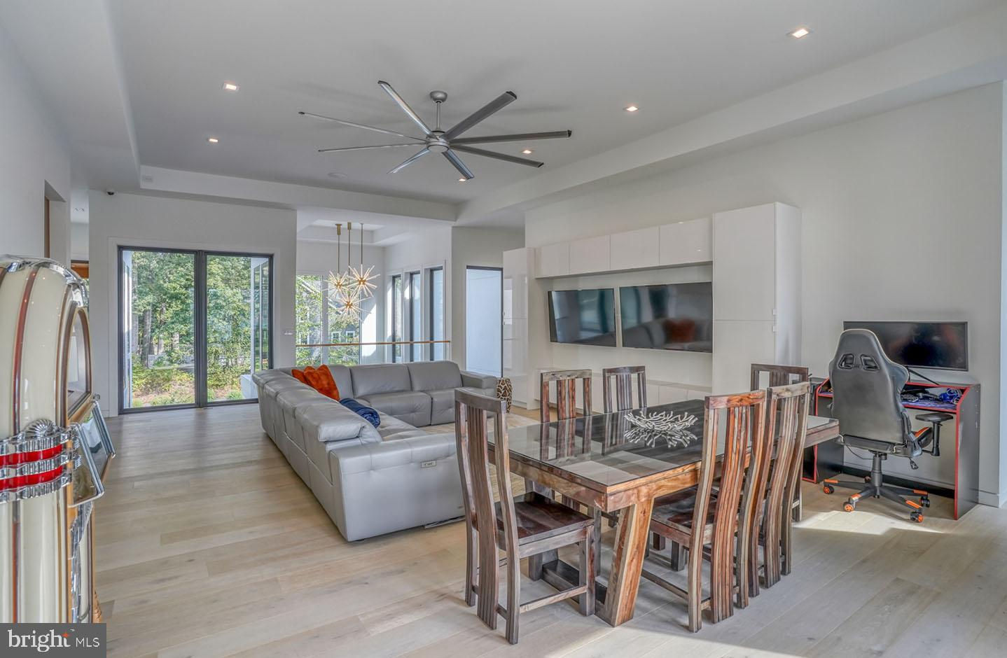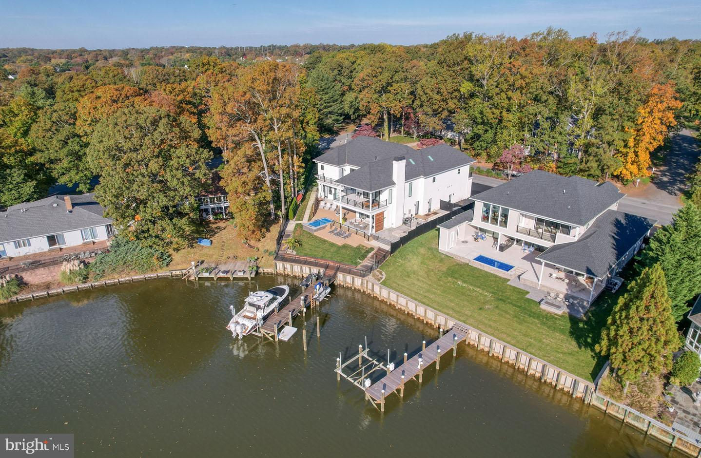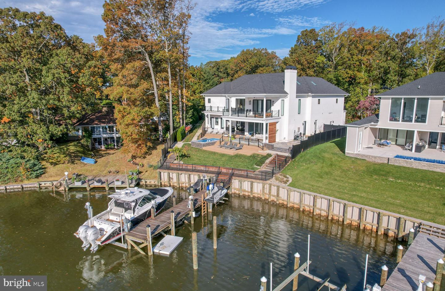 No expense has been spared in this exquisite waterfront custom-built home situated on a premium lot in the coveted Rehoboth Beach Yacht & Country Club. This modern masterpiece was designed with the most discerning buyer in mind with multiple indoor and outdoor living spaces, 4 spacious bedrooms, 5 full baths, 2 half baths, stunning water views, private dock with power lifts, and a personal pool/spa. Custom gas lanterns and tranquil water features welcome you upon arrival. The glass entry leads to an expansive great room with floor-to-ceiling windows providing an abundance of natural light and featuring white oak floors, a sleek dual-sided fireplace, marble surround, and unparalleled water views. The gourmet kitchen is complete with an oversized island, quartz and marble waterfall counters, numerous stainless-steel appliances, gas cooktop with pot-filler, custom hood housing a 65” TV, and a large walk-in pantry. The adjacent dining area and additional living space features a cozy, wood burning fireplace creating a warm space with more spectacular views. If you need more space to entertain, you’ll find a casual game room with gas fireplace and wet bar on the opposite side of the sprawling first level. Take the glass elevator or gorgeous floating walnut staircase to the second level lounge flanked by the luxurious primary suite and 3 additional guest suites all complete with custom closets and beautifully designed en-suite baths. The private owner's retreat is a divine sanctuary featuring a gas fireplace, wet bar with beverage center, private balcony overlooking the water, two oversized walk-in closets, spa-like dual baths with marble floors, backlit mirrors, towel warming racks, rainfall shower, and soaking tub. The lounge leads to an exterior balcony overlooking the lagoon which completes the second level of this brilliant home. The backyard is a resort-style retreat complete with privacy fencing, outdoor kitchen, dining space, living area with fireplace and TV, patio with multiple fire pits, open decks for sunbathing, pool, outdoor shower, and dock complete with 1 boat lift and 2 jet ski lifts. This property is amazing and provides everything a homeowner could desire.