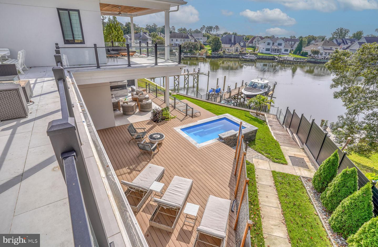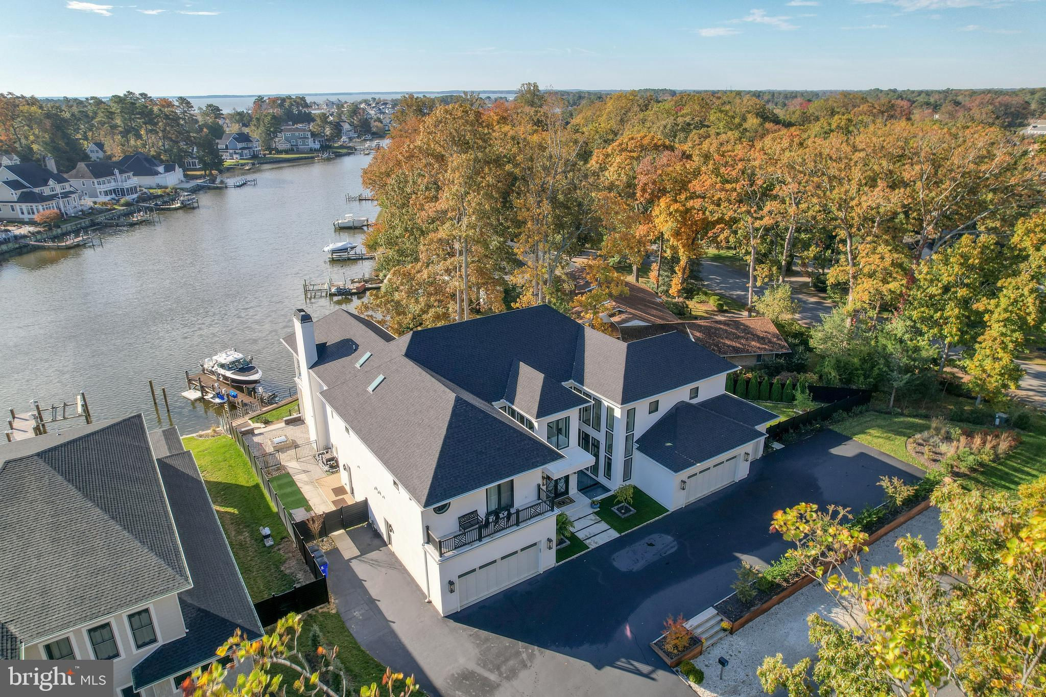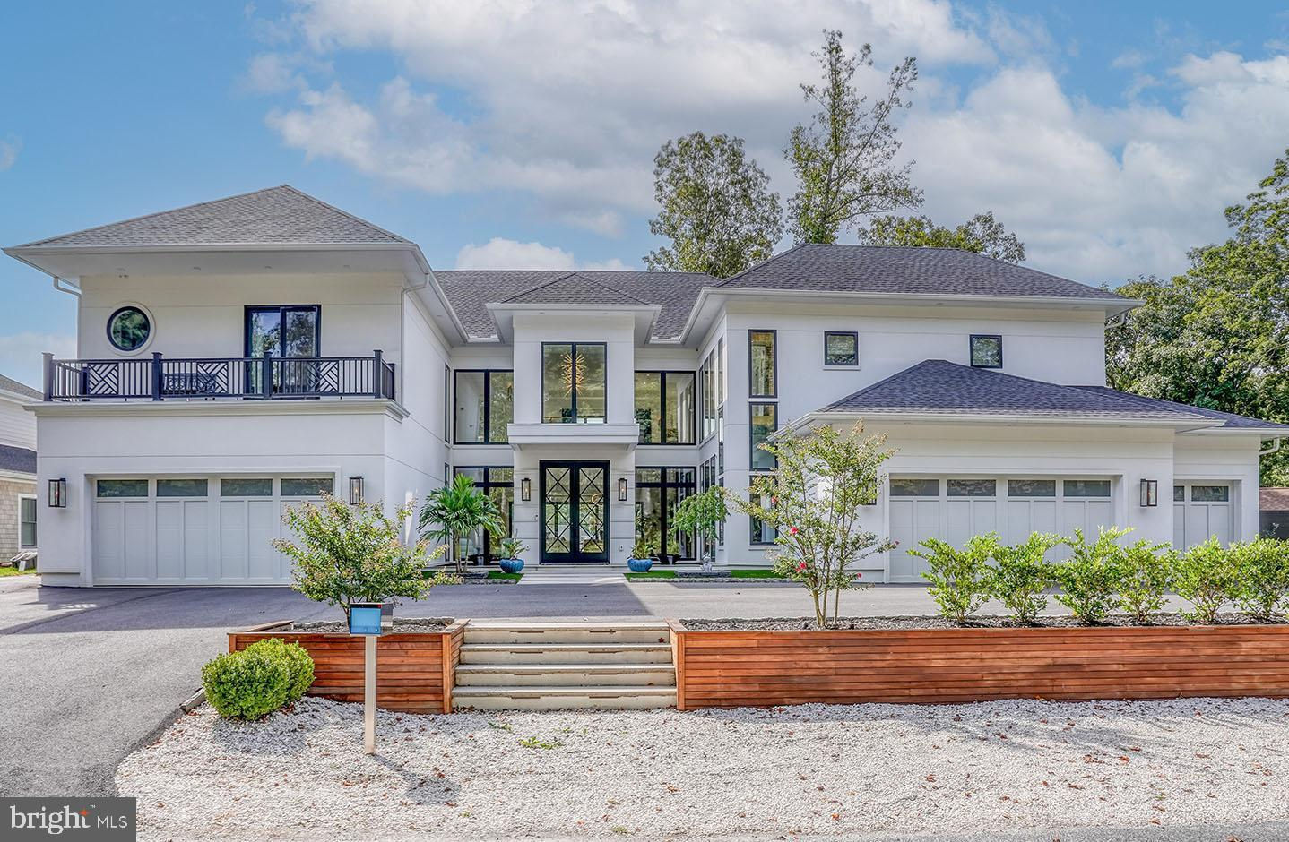 Location, location, location! Welcome to this luxurious 5 car garage waterfront marvel at 104 W. Buckingham Dr., located in the coveted Rehoboth Beach Yacht and County Club. This sought-after Rehoboth Beach location is renowned for its beaches, diverse dining, minutes away from Tanger outlets and downtown shopping, and the entertainment night life that Dewey beach has to offer. This builder's personal home has modern sophistication with just over 7,000 square feet and is designed to take your breath away. Offering the ultimate amount of on and off-street parking, the craftsmanship shines in this vacation destination for people who dream big, love deeply, and live boldly. Set along Bald Eagle Lagoon, the house stands out among the rest boasting 2 deepwater slips for the Rehoboth Bay area. Offering one 20,000 lb boat lift, one wet boat slip, and two jet ski lifts it is truly a boater’s paradise. The extra wide 6'x60' pier is decked with IPE decking for years of longevity. Includes a 50 AMP power post with electric and fresh water on the dock. The landscape lights and dock lights show off the exterior in style and function. The spectacular fiberglass saltwater plunge pool is equipped with a waterfall and fire feature along with 3 outdoor showers, 2 of which are private and one down by the dock for a quick rinse after enjoying your day on the water. The exterior decks on both floors have teak covered porches that allow you to have multiple areas to entertain and relax. An extra-large gas firepit on a paver gathering space delights guests for hours of waterfront conversation under the stars. With an open-air kitchen and a gas and EVO grill, your guests will enjoy fresco dining, laughter and unforgettable gatherings. Dazzling you upon arrival with its 2 exterior fire waterfall features and gas lighting it leads you to a spectacular mahogany front door. Once inside you are greeted with 20'+ tall ceilings with a tiled foyer and exquisite lighting features and hardwood floors throughout the home. Step into the gourmet kitchen, where every detail is crafted for those who love to cook and entertain. Adorned with quartz and Bertazzoni appliances and a walk-in pantry with additional prep space and second full size refrigerator this kitchen is the showpiece of this amazing house. Views of the canal can be seen through the massive, fixed windows and double opening sliding doors in the back of the home. A wood-burning limestone fireplace in one of the family rooms that overlook the bay makes for an extra cozy space on those cold nights. With a total of 4 living room areas, each equipped with large screen TVs allows owners and guests to each have a room to come home and unwind. For the dog lover in mind, this house also incorporates a laundry room downstairs with dog grooming bathtub station. Enjoy the lighted open glass railing staircase or take solace in the bright double window shafted elevator to the top floor where the upstairs boasts 4 large bedrooms with their own private bath. Add the functionality of a kitchenette and 2 laundry rooms upstairs, along with a living area that has the view of the lagoon from the wrap around rear porch with glass railings, the views are unparalleled. It’s a place which transcends the typical home and caters to your utmost comfort and desire.