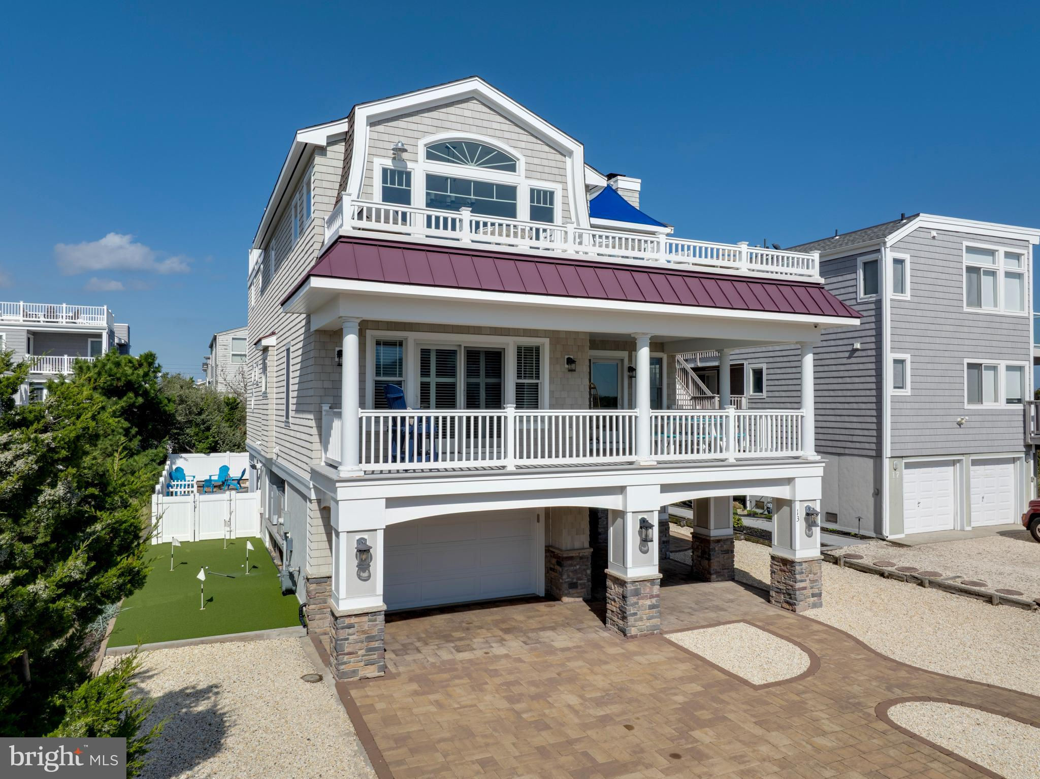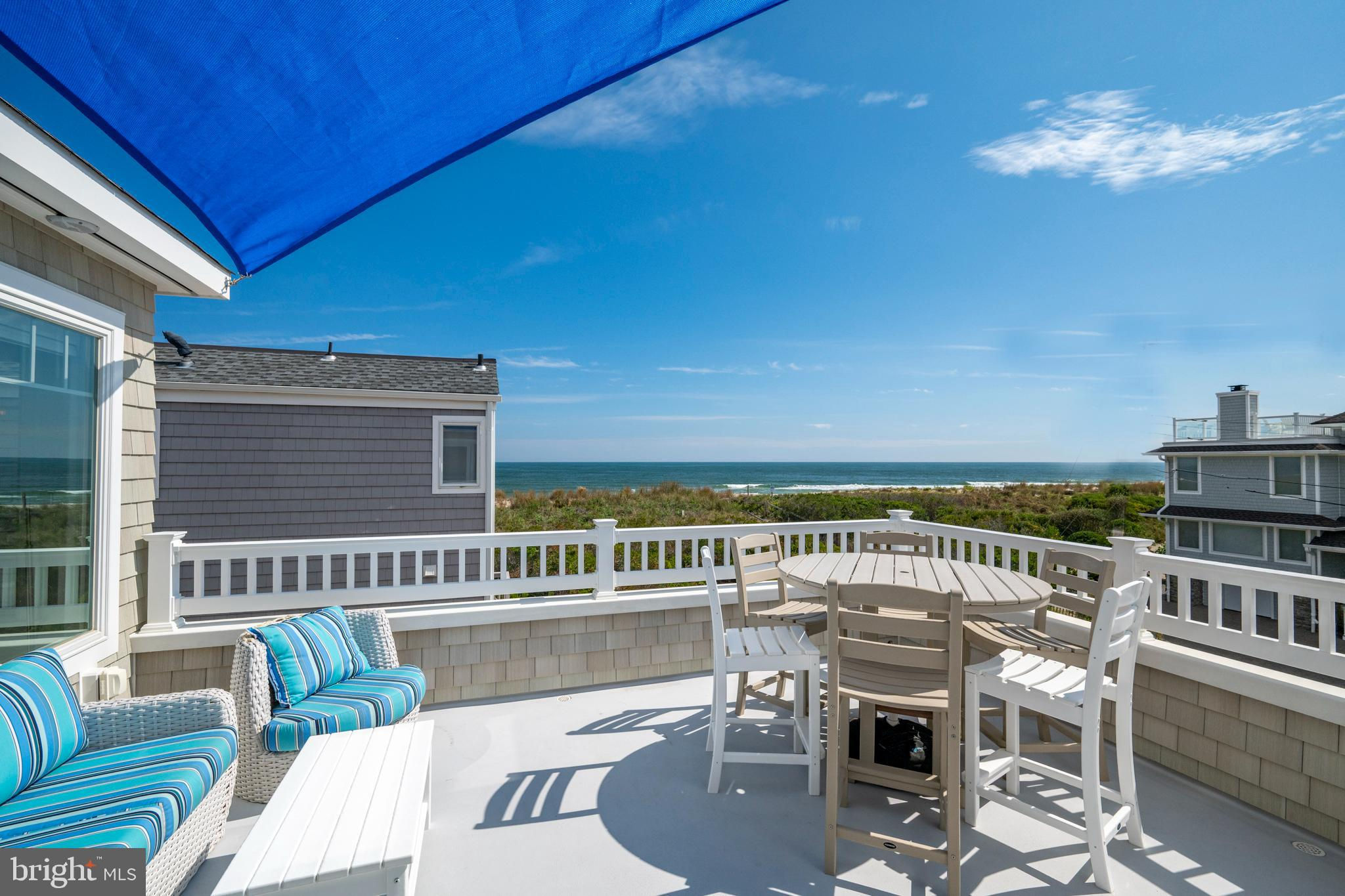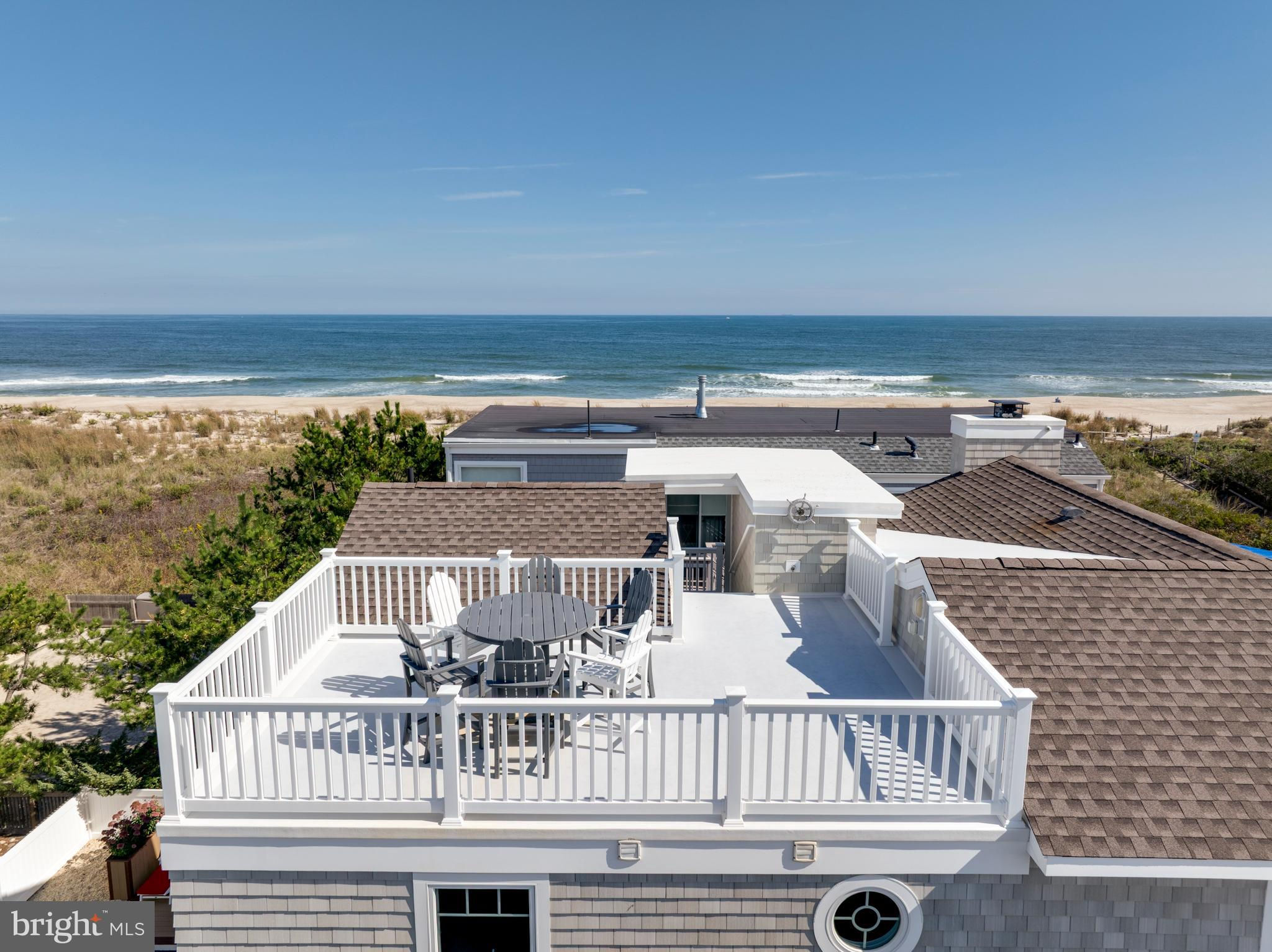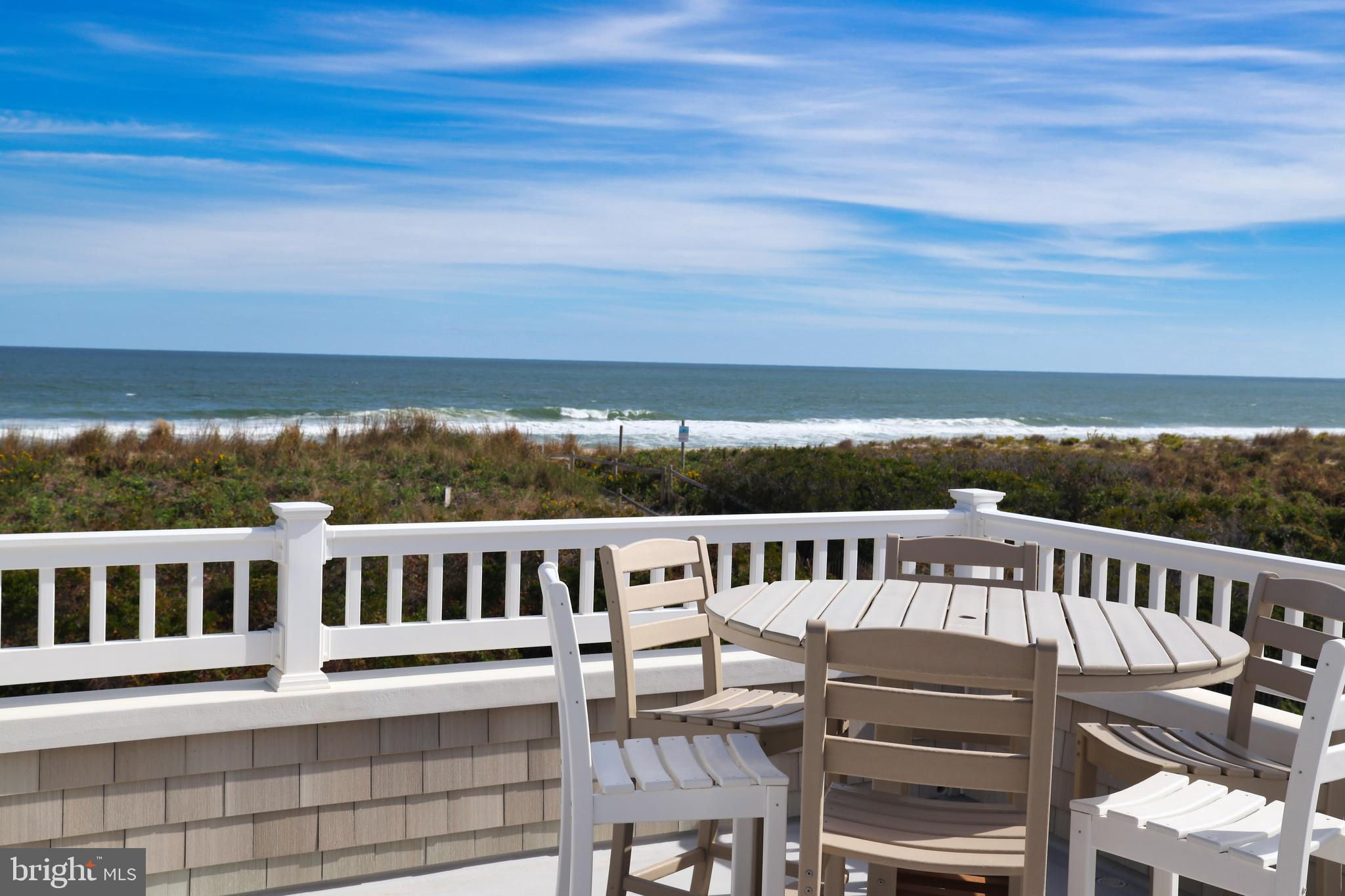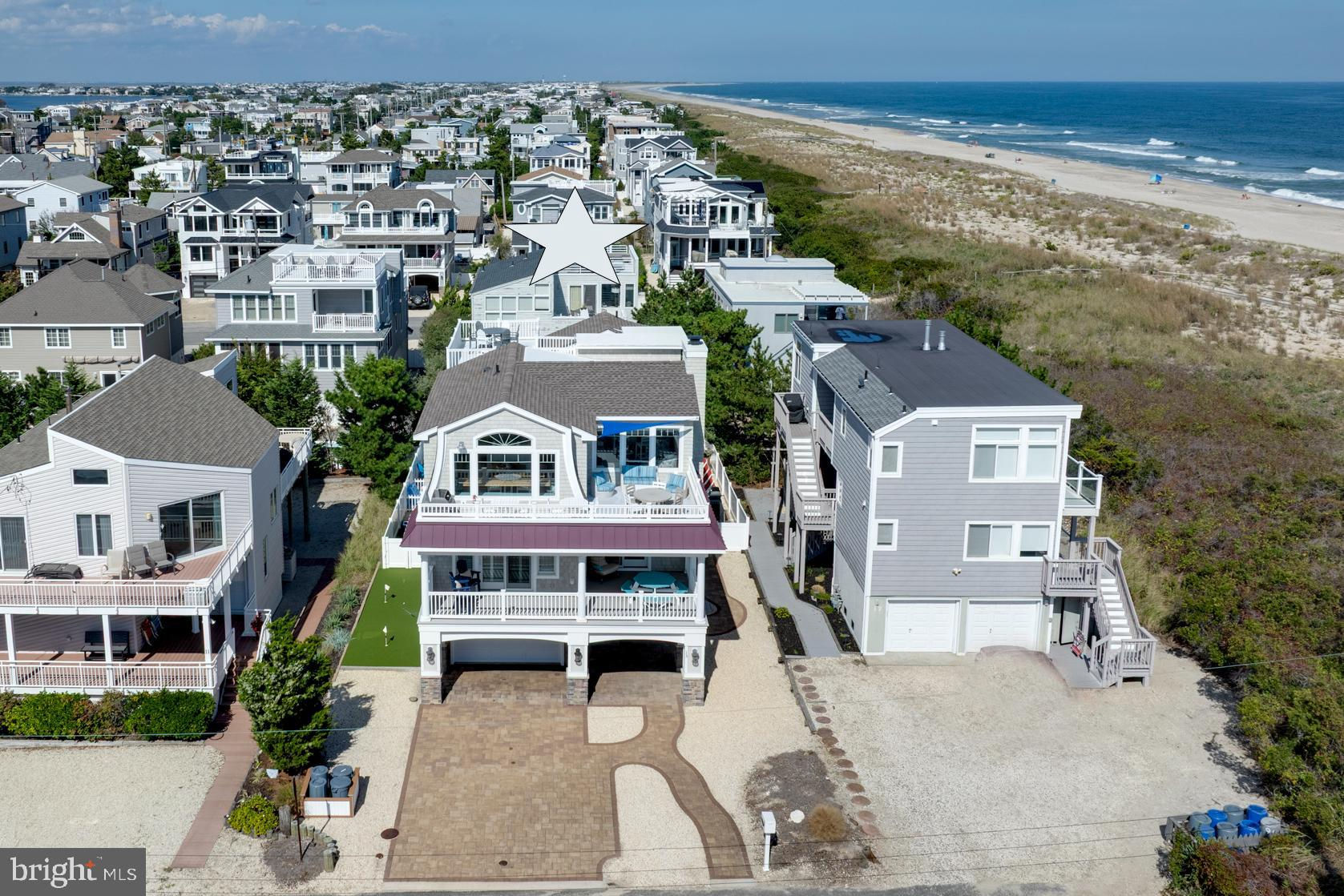 Absolutely superior ocean views come easy from this second from the ocean coastal shingle style home that is a viable alternative to purchasing oceanfront! Desirably located “in town” with an easy stroll on the newly created sidewalks to restaurants, shops and markets - you literally don't need to use a car once you arrive. In addition to being on a lifeguarded ocean beach, the yacht club and bay bathing beach are within one block. 4 bedrooms; 3 full baths with heated floors and double vanities; 2 half baths; den; elevator shaft; two master suites, one with walk in shower and walk in closet the other with walk in shower, soaking tub, and toilet closet; one guest bedroom with its own outdoor shower, private balcony, and in-room sink; one guest bunk room with custom made built-ins. The Chef's kitchen is highlighted by a huge center island with seating for nine, two Subzero refrigerators, two Miele dishwashers, two sinks with disposals, Wolf gas cooktop, microwave, and wall oven. The large brick driveway can accommodate five cars and is located east of the no parking line preventing parking in front of your house and oversized one car garage with Level 2 EV charger. Other prominent features include great room with linear gas fireplace, bar with wine refrigeration, ice maker, vaulted ceiling, large wrap around deck and fantastic ocean views; large covered deck on lower level; easy access roof top deck with sweeping ocean views; Castle Combe oiled wood flooring throughout; dining area with banquette seating; two laundries; exercise nook; ceiling fans in all rooms; Sonos sound system; Nu Cedar siding; and so much more! The fun filled outdoor program includes and in-ground heated salt-water pool with huge patio, 3 outdoor showers including the surfboard beach rinse off, putting green, ping pong, room for privacy plantings, and firepit. This one checks all the boxes!