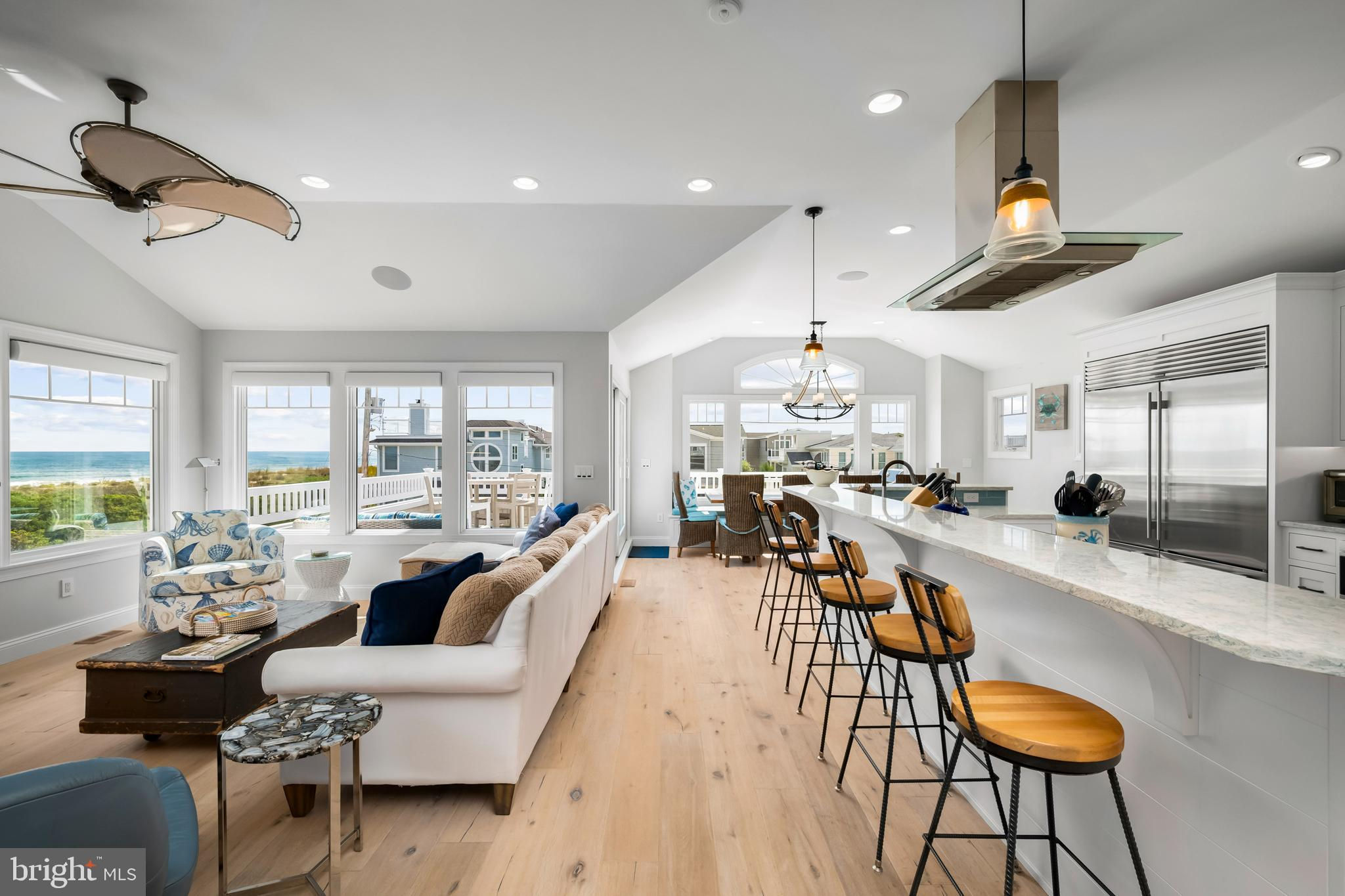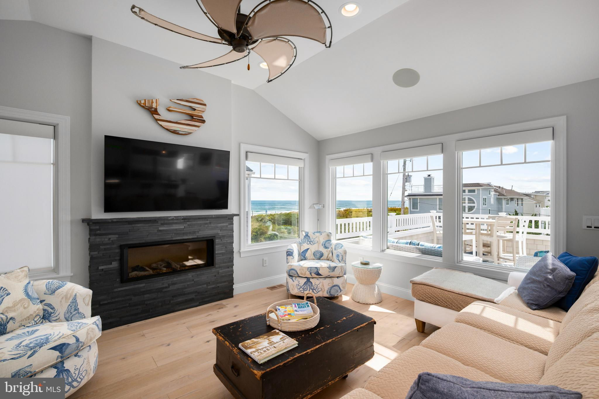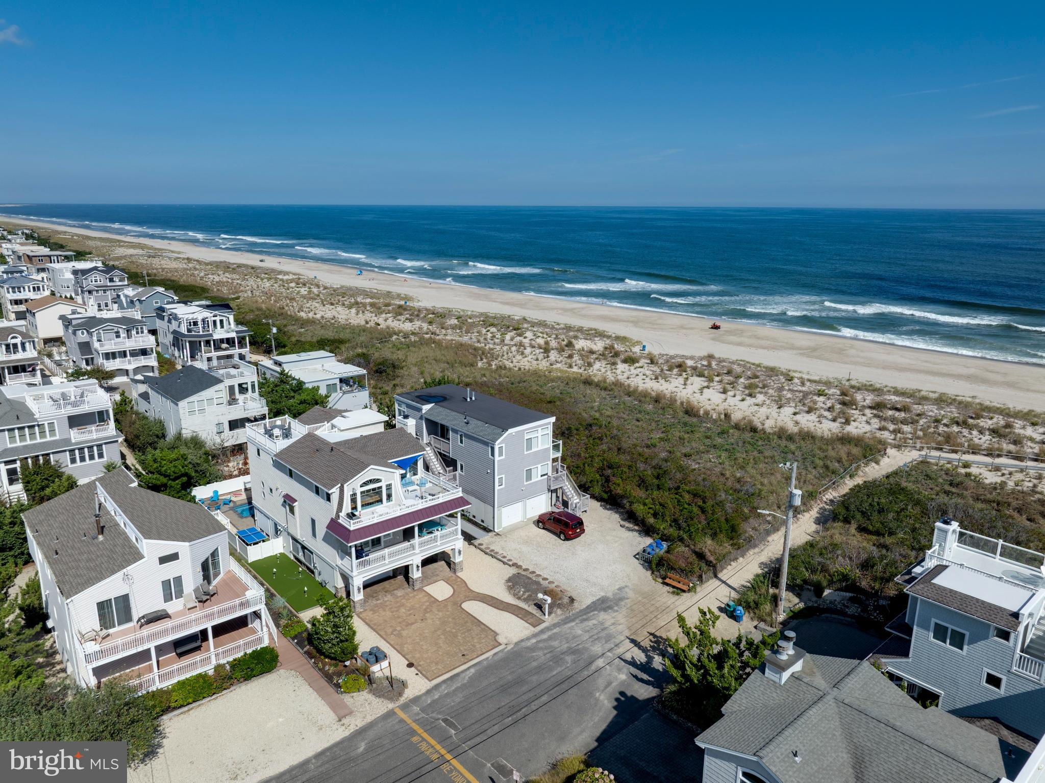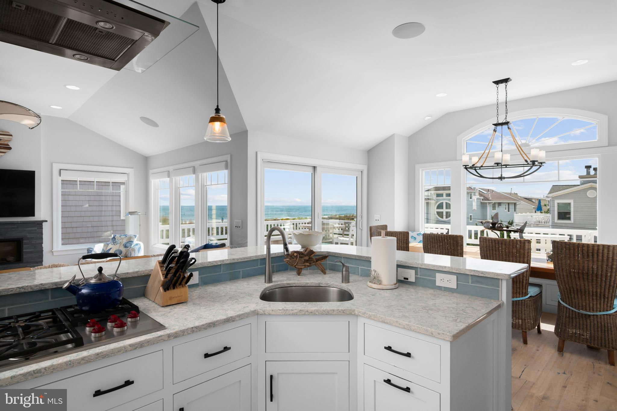 Absolutely superior ocean views come easy from this second from the ocean coastal shingle style home that is a viable alternative to purchasing oceanfront! Desirably located “in town” with an easy stroll on the newly created sidewalks to restaurants, shops and markets - you literally don't need to use a car once you arrive. In addition to being on a lifeguarded ocean beach, the yacht club and bay bathing beach are within one block. 4 bedrooms; 3 full baths with heated floors and double vanities; 2 half baths; den; elevator shaft; two master suites, one with walk in shower and walk in closet the other with walk in shower, soaking tub, and toilet closet; one guest bedroom with its own outdoor shower, private balcony, and in-room sink; one guest bunk room with custom made built-ins. The Chef's kitchen is highlighted by a huge center island with seating for nine, two Subzero refrigerators, two Miele dishwashers, two sinks with disposals, Wolf gas cooktop, microwave, and wall oven. The large brick driveway can accommodate five cars and is located east of the no parking line preventing parking in front of your house and oversized one car garage with Level 2 EV charger. Other prominent features include great room with linear gas fireplace, bar with wine refrigeration, ice maker, vaulted ceiling, large wrap around deck and fantastic ocean views; large covered deck on lower level; easy access roof top deck with sweeping ocean views; Castle Combe oiled wood flooring throughout; dining area with banquette seating; two laundries; exercise nook; ceiling fans in all rooms; Sonos sound system; Nu Cedar siding; and so much more! The fun filled outdoor program includes and in-ground heated salt-water pool with huge patio, 3 outdoor showers including the surfboard beach rinse off, putting green, ping pong, room for privacy plantings, and firepit. This one checks all the boxes!