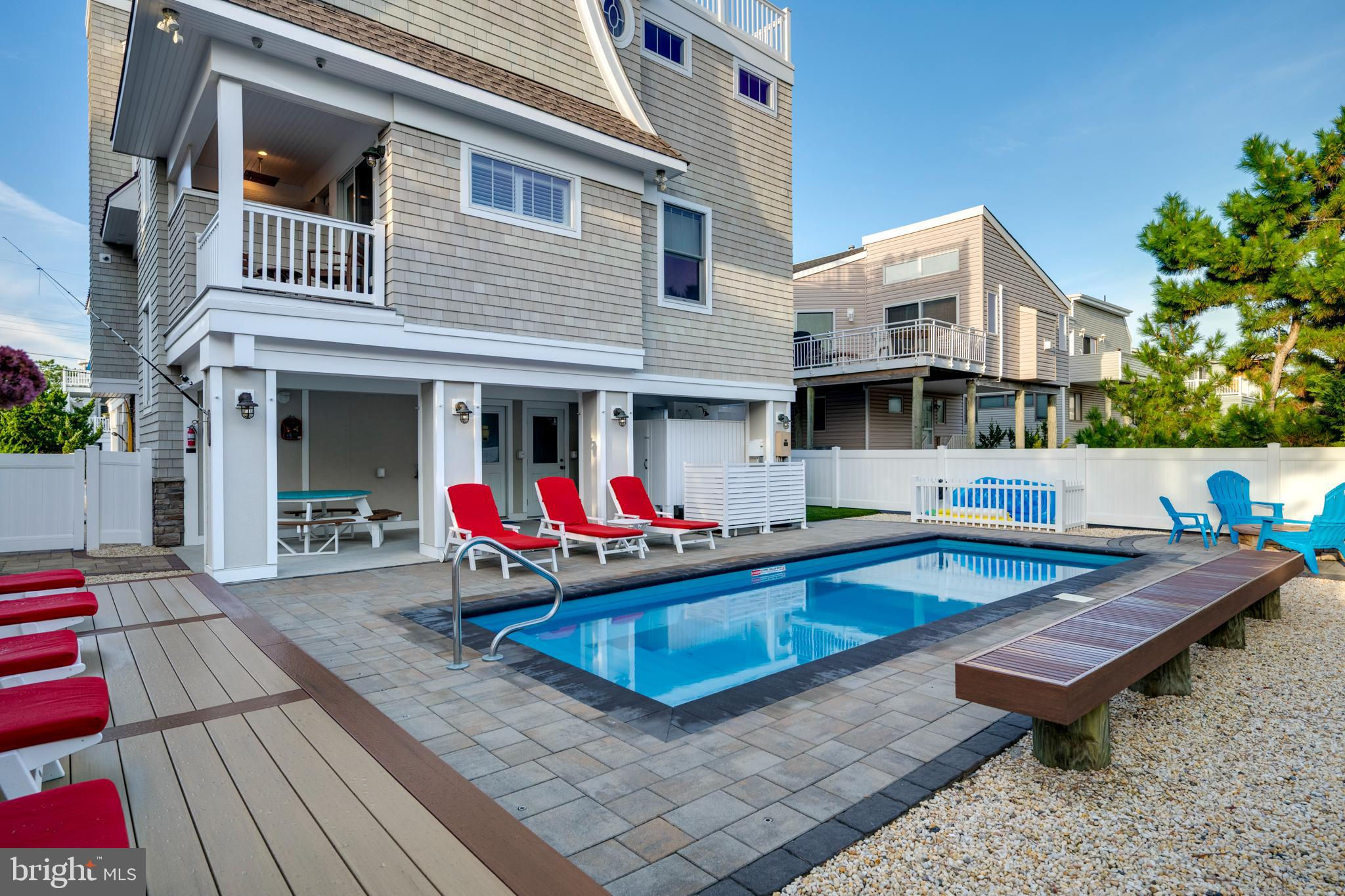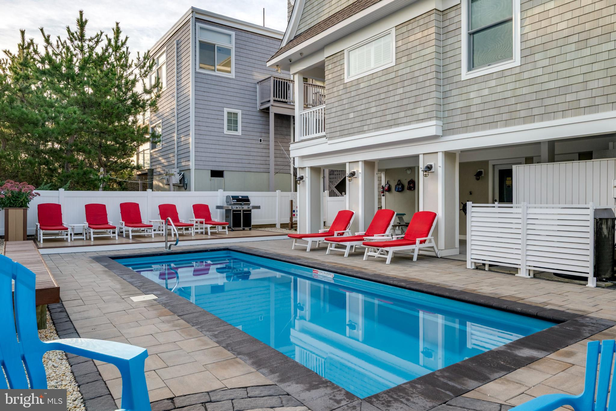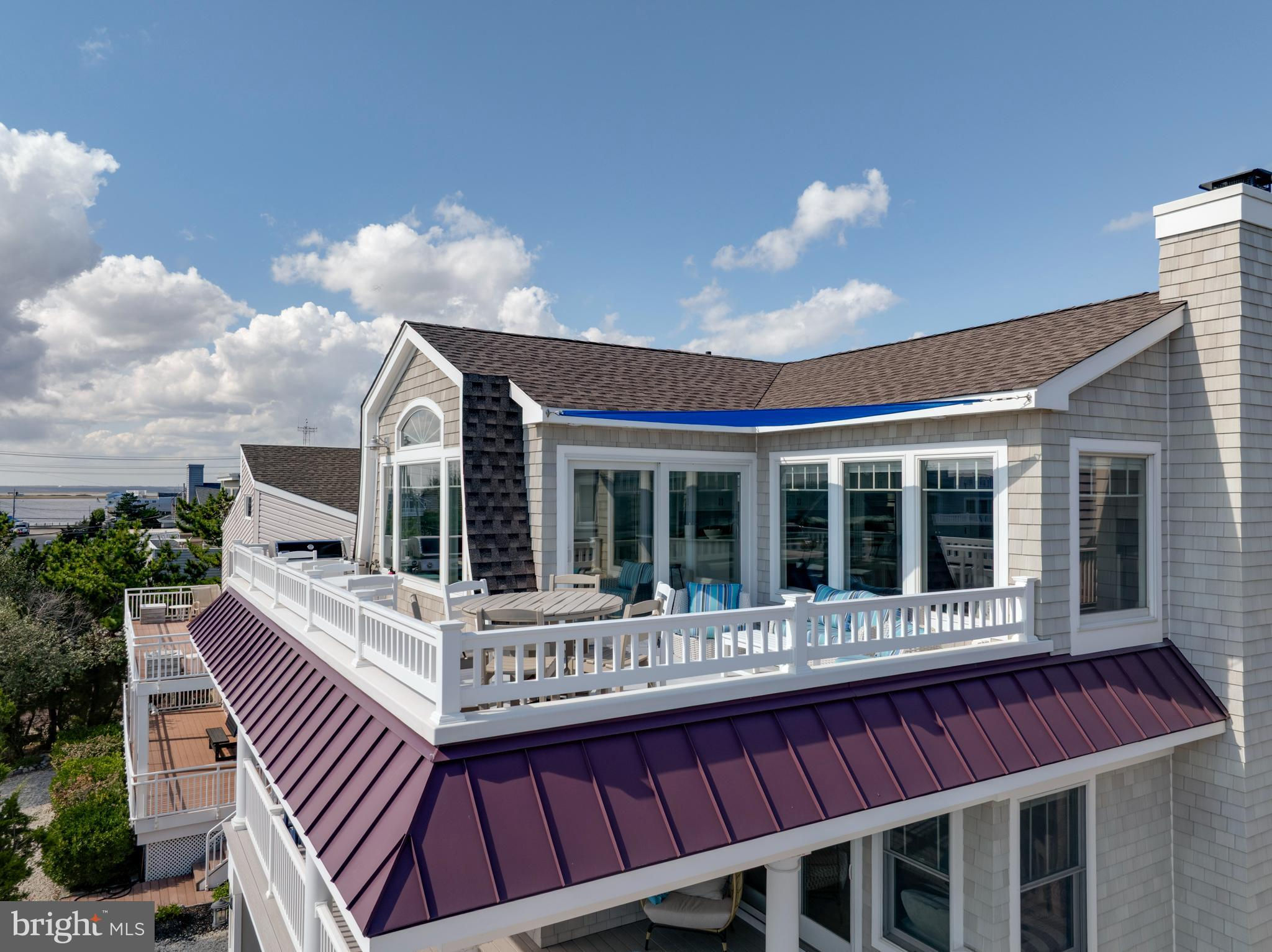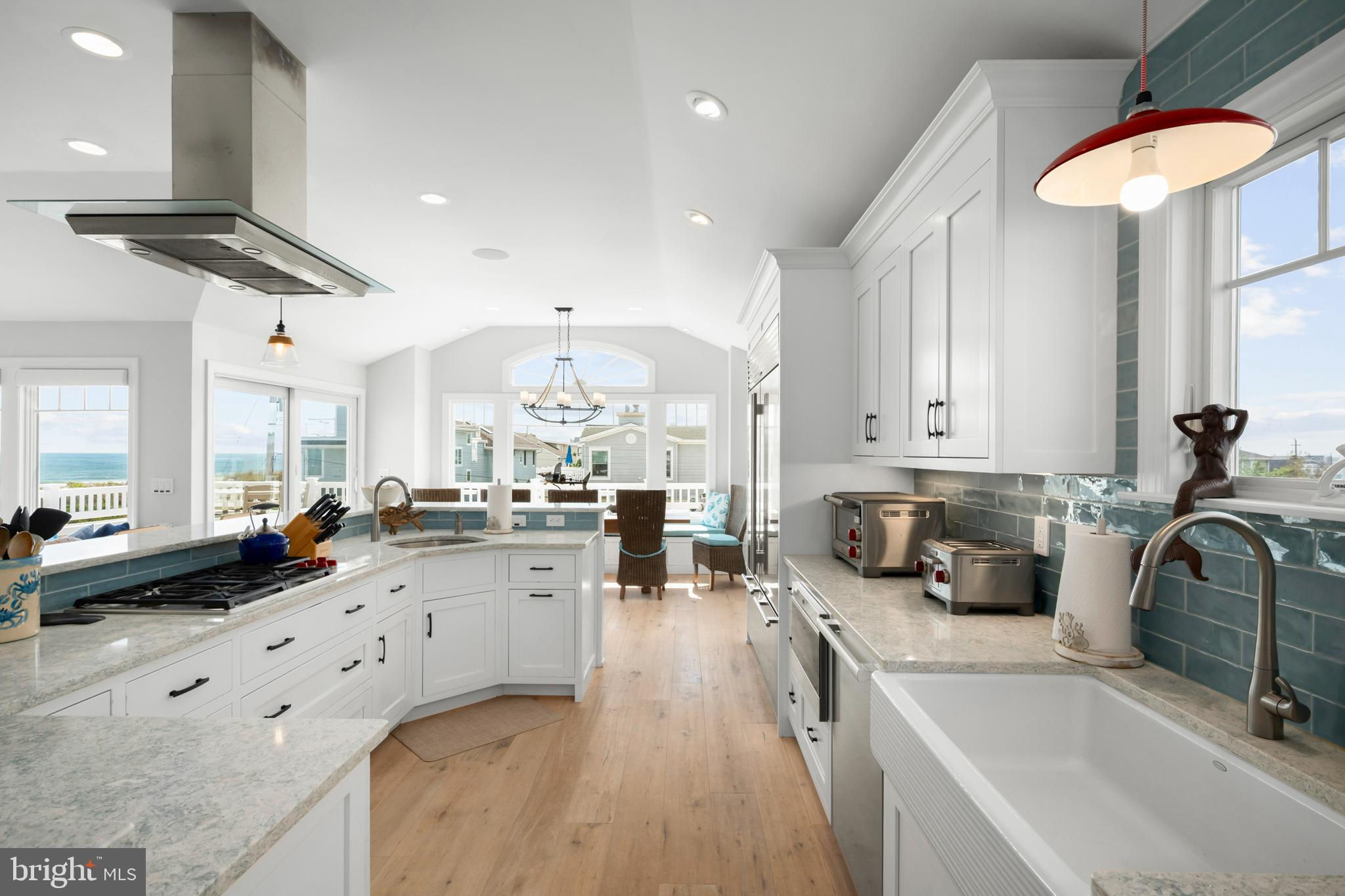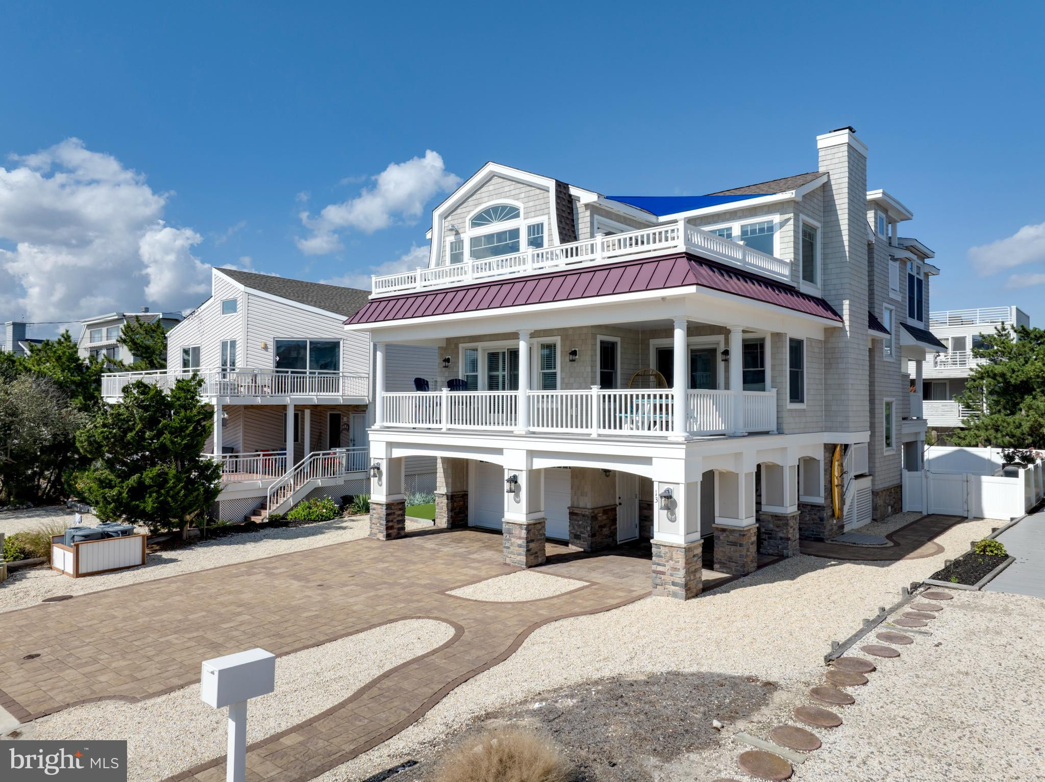 Absolutely superior ocean views come easy from this second from the ocean coastal shingle style home that is a viable alternative to purchasing oceanfront! Desirably located “in town” with an easy stroll on the newly created sidewalks to restaurants, shops and markets - you literally don't need to use a car once you arrive. In addition to being on a lifeguarded ocean beach, the yacht club and bay bathing beach are within one block. 4 bedrooms; 3 full baths with heated floors and double vanities; 2 half baths; den; elevator shaft; two master suites, one with walk in shower and walk in closet the other with walk in shower, soaking tub, and toilet closet; one guest bedroom with its own outdoor shower, private balcony, and in-room sink; one guest bunk room with custom made built-ins. The Chef's kitchen is highlighted by a huge center island with seating for nine, two Subzero refrigerators, two Miele dishwashers, two sinks with disposals, Wolf gas cooktop, microwave, and wall oven. The large brick driveway can accommodate five cars and is located east of the no parking line preventing parking in front of your house and oversized one car garage with Level 2 EV charger. Other prominent features include great room with linear gas fireplace, bar with wine refrigeration, ice maker, vaulted ceiling, large wrap around deck and fantastic ocean views; large covered deck on lower level; easy access roof top deck with sweeping ocean views; Castle Combe oiled wood flooring throughout; dining area with banquette seating; two laundries; exercise nook; ceiling fans in all rooms; Sonos sound system; Nu Cedar siding; and so much more! The fun filled outdoor program includes and in-ground heated salt-water pool with huge patio, 3 outdoor showers including the surfboard beach rinse off, putting green, ping pong, room for privacy plantings, and firepit. This one checks all the boxes!