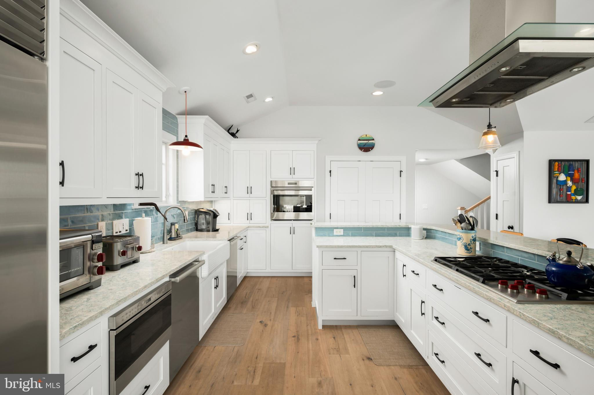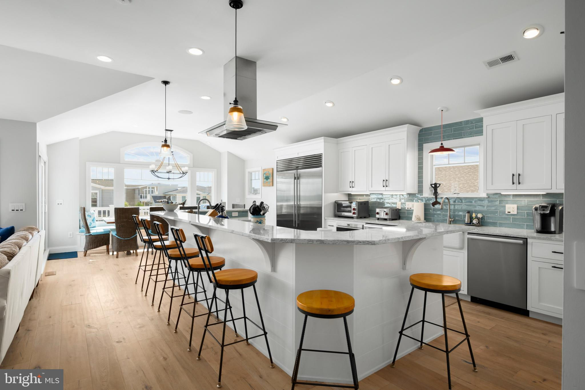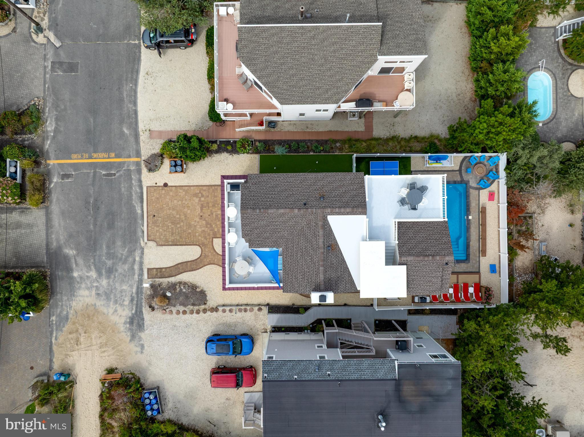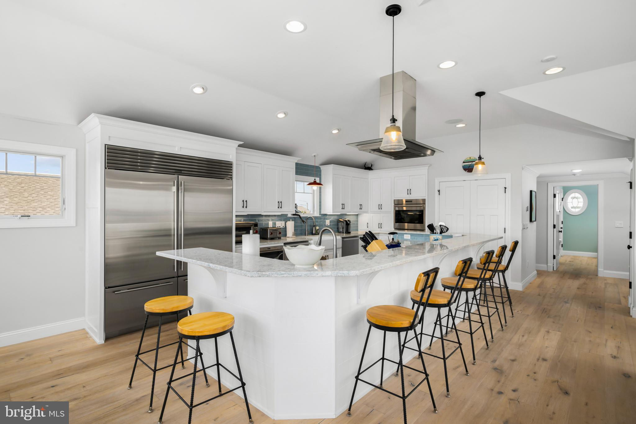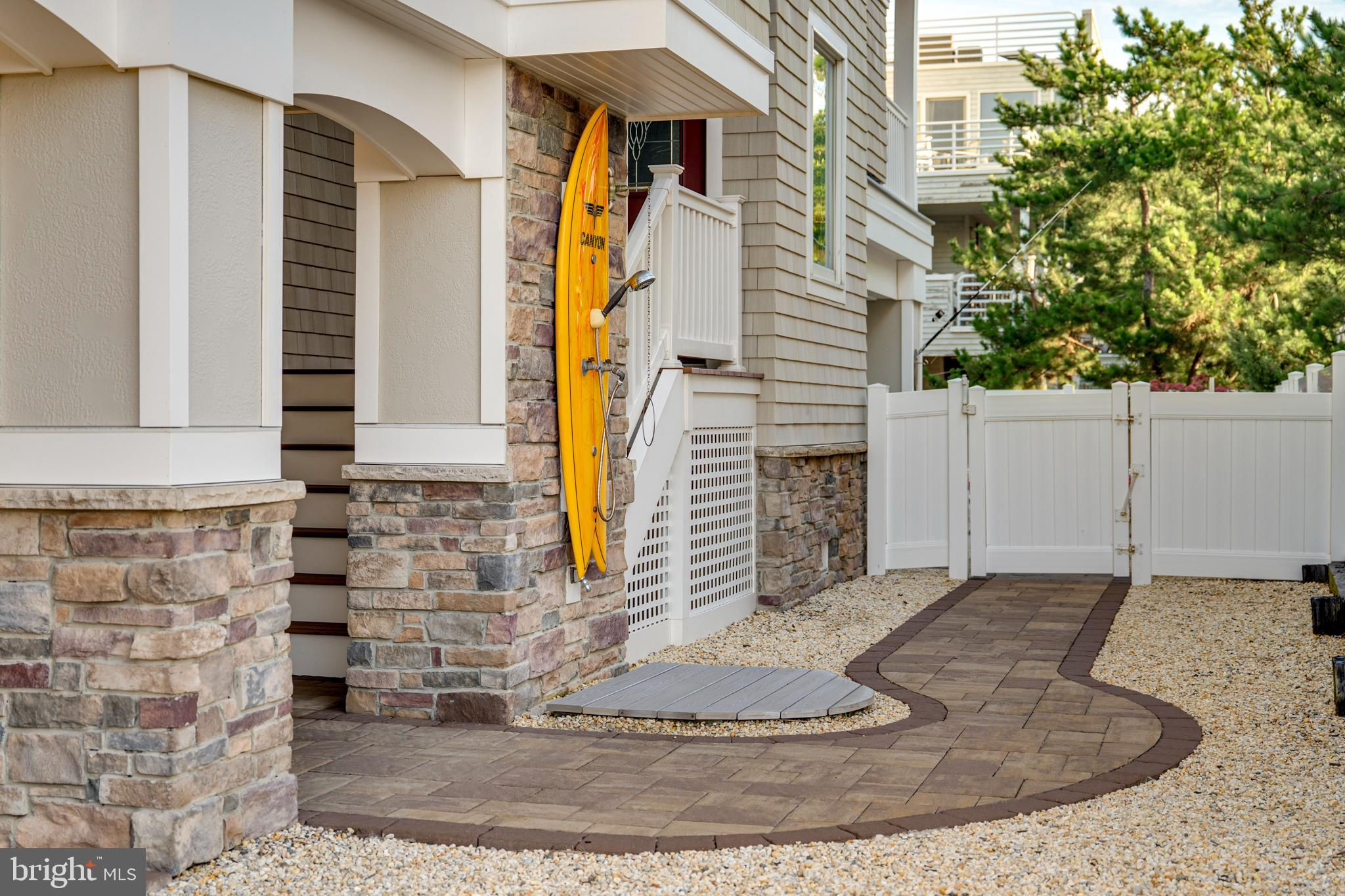 Absolutely superior ocean views come easy from this second from the ocean coastal shingle style home that is a viable alternative to purchasing oceanfront! Desirably located “in town” with an easy stroll on the newly created sidewalks to restaurants, shops and markets - you literally don't need to use a car once you arrive. In addition to being on a lifeguarded ocean beach, the yacht club and bay bathing beach are within one block. 4 bedrooms; 3 full baths with heated floors and double vanities; 2 half baths; den; elevator shaft; two master suites, one with walk in shower and walk in closet the other with walk in shower, soaking tub, and toilet closet; one guest bedroom with its own outdoor shower, private balcony, and in-room sink; one guest bunk room with custom made built-ins. The Chef's kitchen is highlighted by a huge center island with seating for nine, two Subzero refrigerators, two Miele dishwashers, two sinks with disposals, Wolf gas cooktop, microwave, and wall oven. The large brick driveway can accommodate five cars and is located east of the no parking line preventing parking in front of your house and oversized one car garage with Level 2 EV charger. Other prominent features include great room with linear gas fireplace, bar with wine refrigeration, ice maker, vaulted ceiling, large wrap around deck and fantastic ocean views; large covered deck on lower level; easy access roof top deck with sweeping ocean views; Castle Combe oiled wood flooring throughout; dining area with banquette seating; two laundries; exercise nook; ceiling fans in all rooms; Sonos sound system; Nu Cedar siding; and so much more! The fun filled outdoor program includes and in-ground heated salt-water pool with huge patio, 3 outdoor showers including the surfboard beach rinse off, putting green, ping pong, room for privacy plantings, and firepit. This one checks all the boxes!
