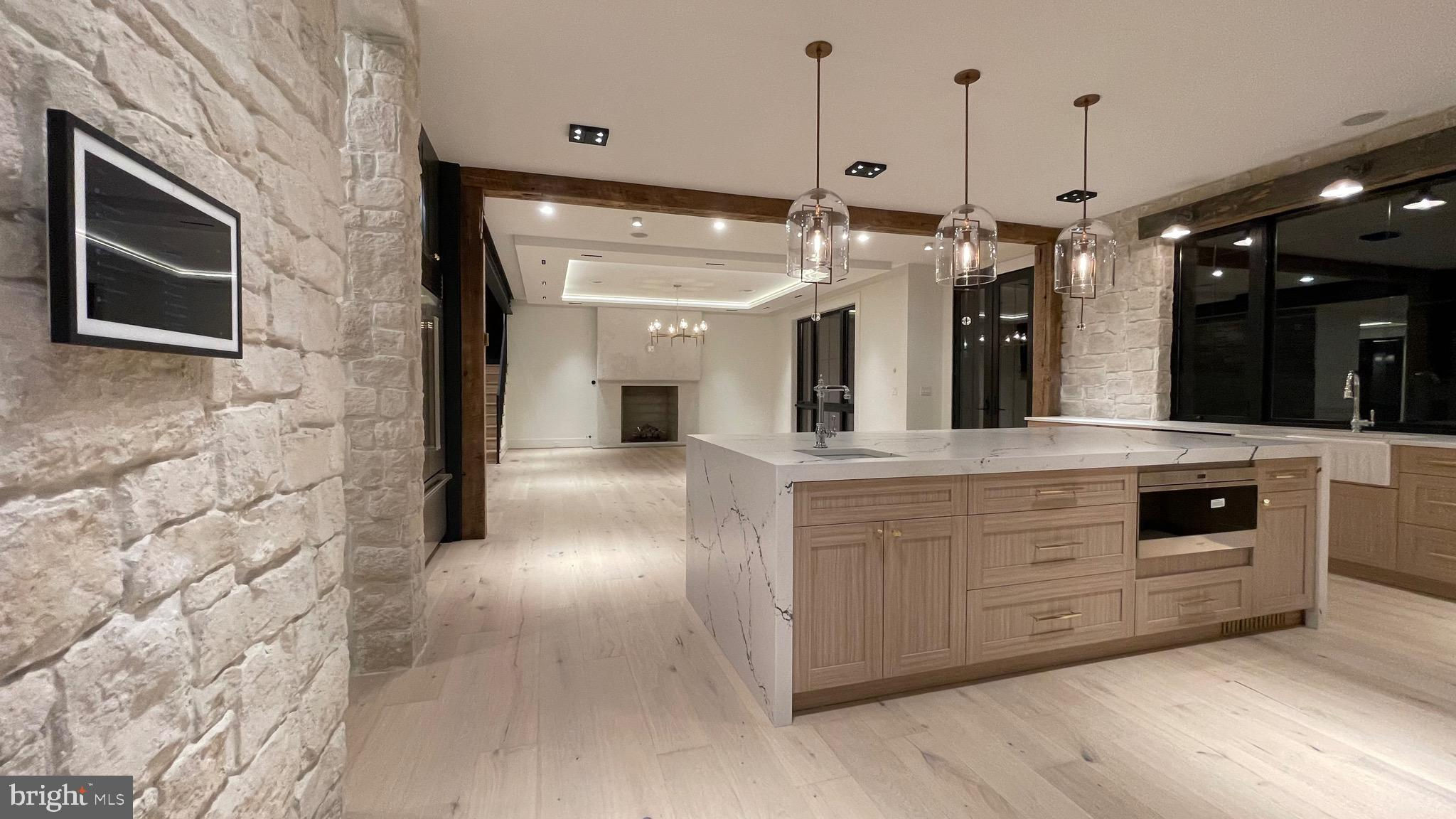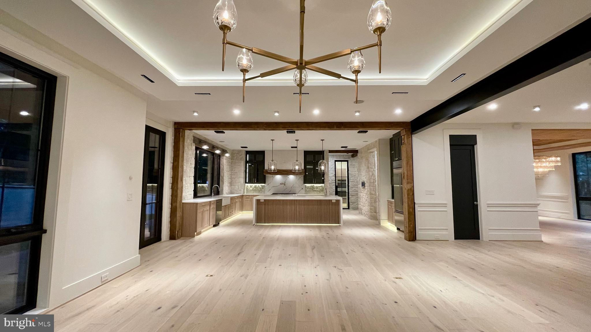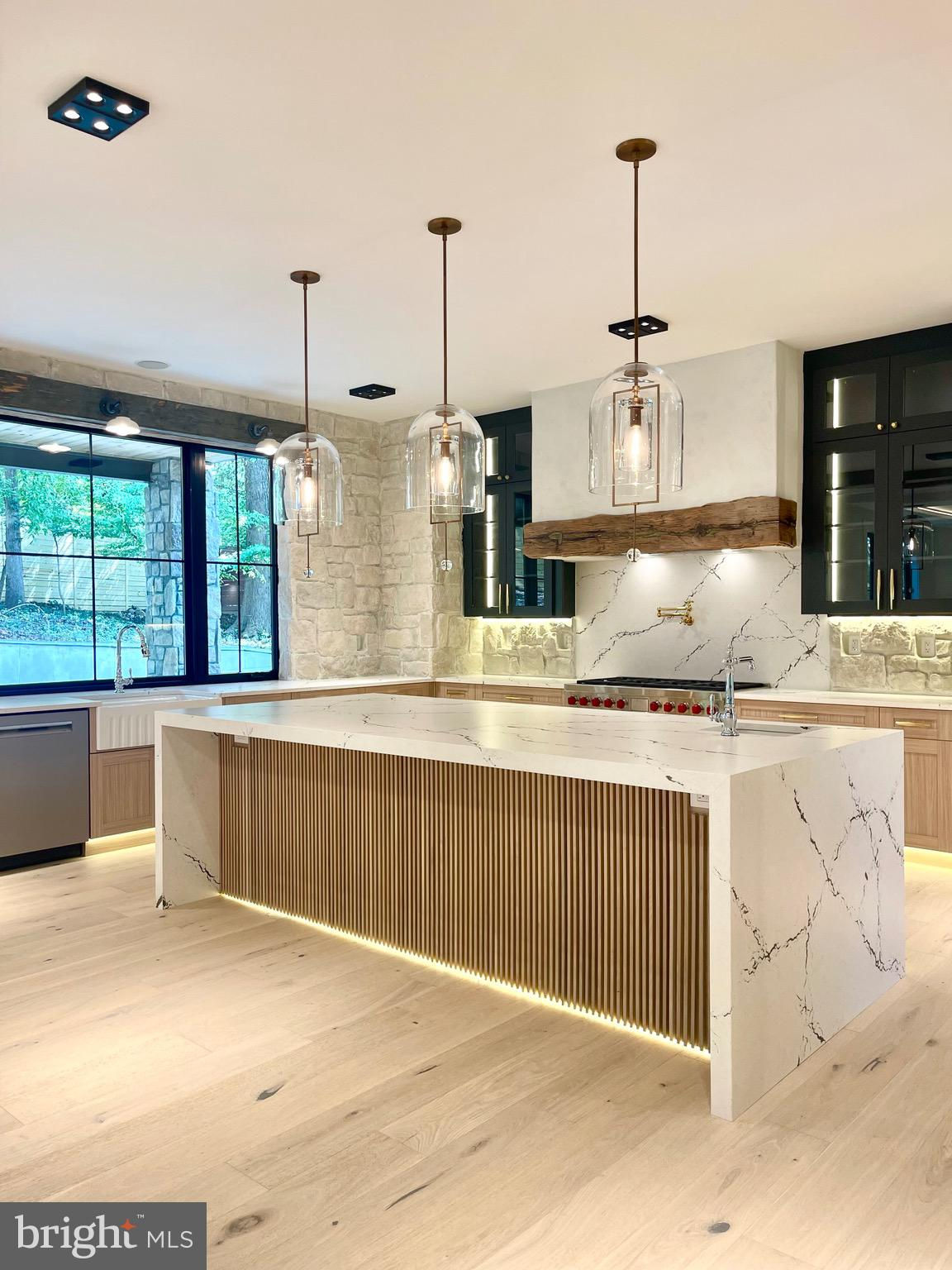 Introducing The Barn, a relaxed luxury by Artsy Homes, where timeless elegance blends effortlessly with refined comfort. A true expression of modern sophistication. From serene retreats in Washington, D.C. to countryside escapes reimagined in an urban setting, every detail of this home tells a story in the heart of Chesterbrook Woods, one of McLean’s premier neighborhoods. The exterior captivates with meticulous craftsmanship. Twelve-foot beams at the front entrance complement intricate stonework, while a grand Canadian maple Andersen door exudes striking presence. French gas lanterns paired with RH light fixtures add refined charm. A metal roof blends seamlessly with premium architectural shingles, and the façade combines stone with Shou Sugi Ban siding, accented by thoughtful landscaping that completes this cohesive architectural statement. At the heart of the home is a breathtaking thirty-foot-high lounge crowned with sixteen-foot windows, featuring a reclaimed roof rafter from 1847, salvaged from the last cotton mill of Virginia, that invites cascades of natural light throughout the day. The room, wrapped in century-old rugged heart pine and dark textured brick, carries a stillness that resonates deeply. Exposed roof rafters meticulously wrapped in birch wood add organic warmth to the soaring volume and create a space where serene grandeur meets quiet storytelling. Suspended above, the Arcachon Round brass chandelier anchors the room with rhythmic grace. Below, a custom-built fireplace framed by built-in bookshelves offers both intimacy and presence. The kitchen is an artful composition of form, light, and texture. A ten-foot brass-textured waterfall countertop exudes understated charm, while sun-filled windows invite the day’s shifting moods. The Fulcrum Pendant, with its hand-blown glass and brass, hovers sculpturally, casting a gentle glow. Limestone walls evoke the Tuscan countryside’s earthy timelessness. Chevron white oak floors, soft-toned cabinetry, and polished brass hardware from the Camden Collection, inspired by mid-century French and Italian design, blend quiet confidence with craftsmanship. Reclaimed beams paired with structural I-beams create a dialogue between history and modernity, making the kitchen a celebration of refined restraint and comfort. A slatted ceiling designed and constructed onsite guides you toward the dining area with a rhythm that feels intentional and fluid. There, a Tiered Rectangular Chandelier from the Marignan Collection, composed of more than one thousand crystal elements, takes center stage. Its interlocking formations float effortlessly, casting a shimmering cascade of light that fills the space with quiet drama. The Thaddeus Powder Room collection, inspired by the surreal artistry of Salvador Dalí and Diego Giacometti, features hand-forged metals, a bespoke custom sink, and refined fixtures that intertwine with effortless sophistication, resonating with the home’s cohesive aesthetic. (This offers just a glimpse of the main level, with even more to explore throughout the home.) At its core, Artsy Homes believes every house should tell a story, with each space unfolding as a meaningful chapter that endures over time, crafting environments that awaken reflection and wonder, where elegance and beauty invite you to slow down, breathe deeply, and embrace the true essence of feeling at home.
