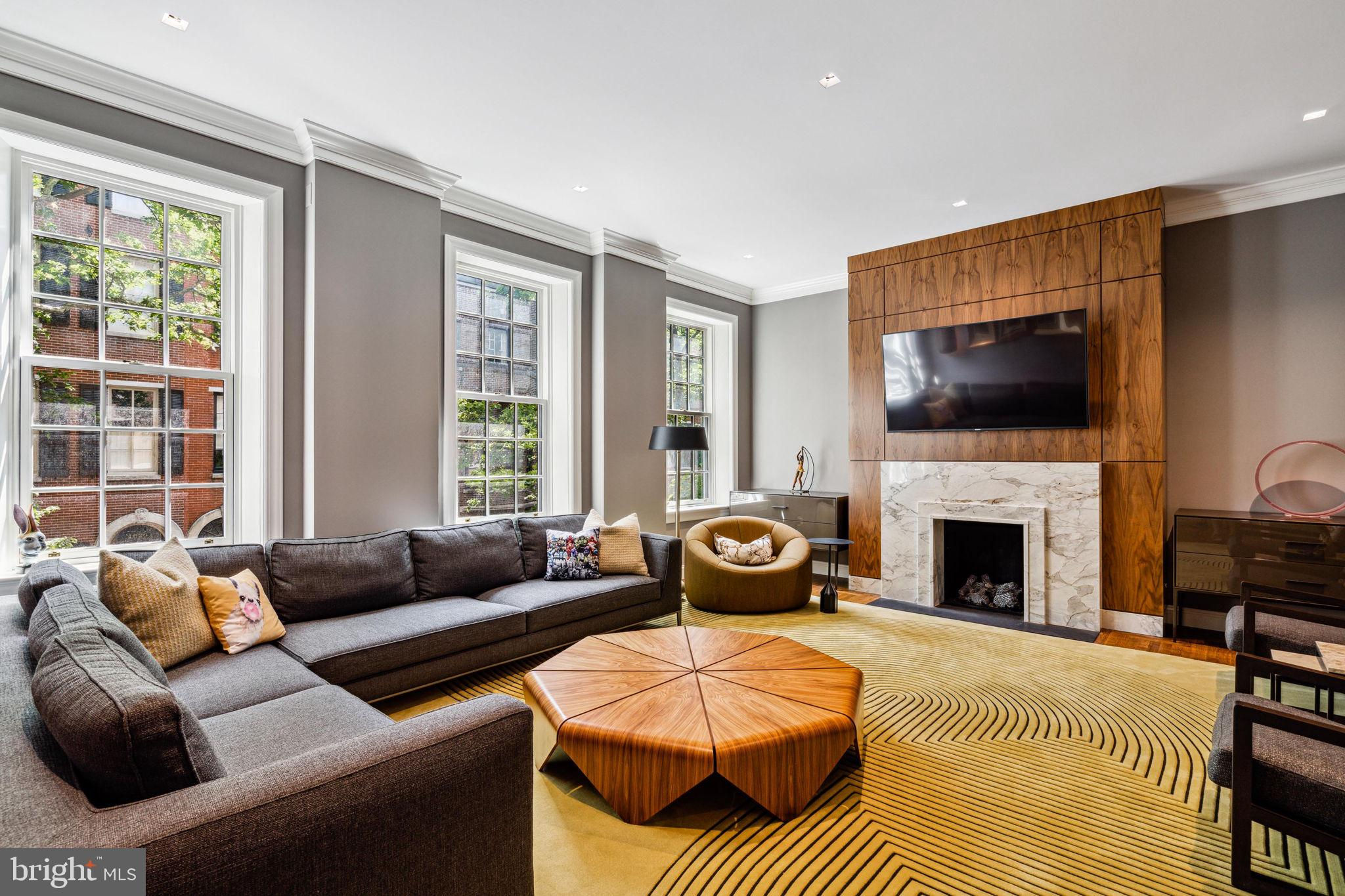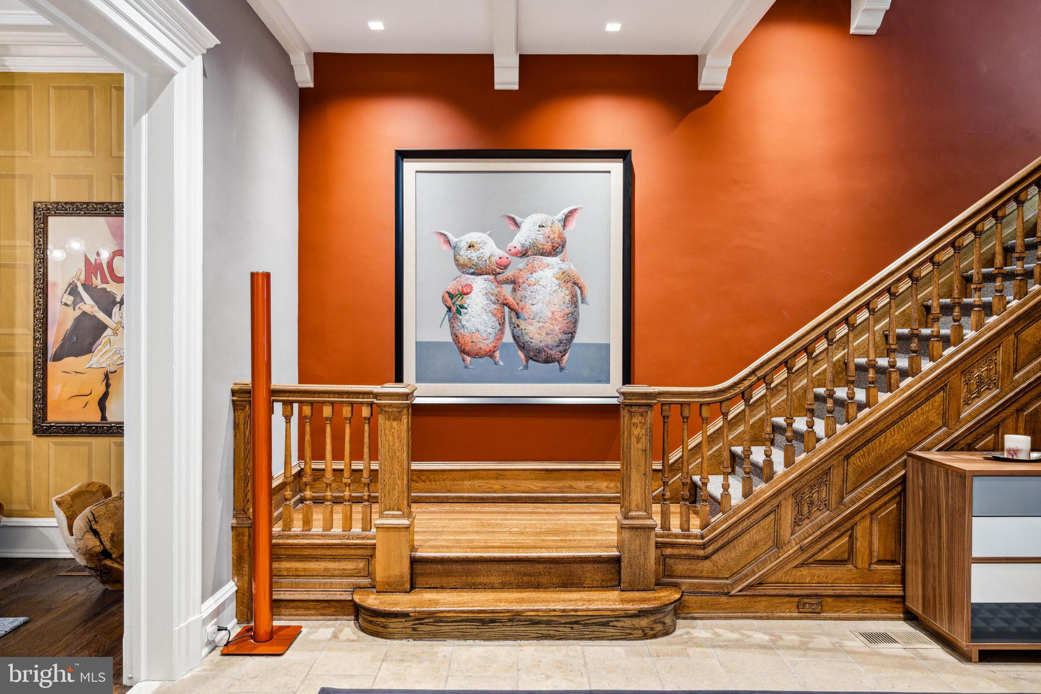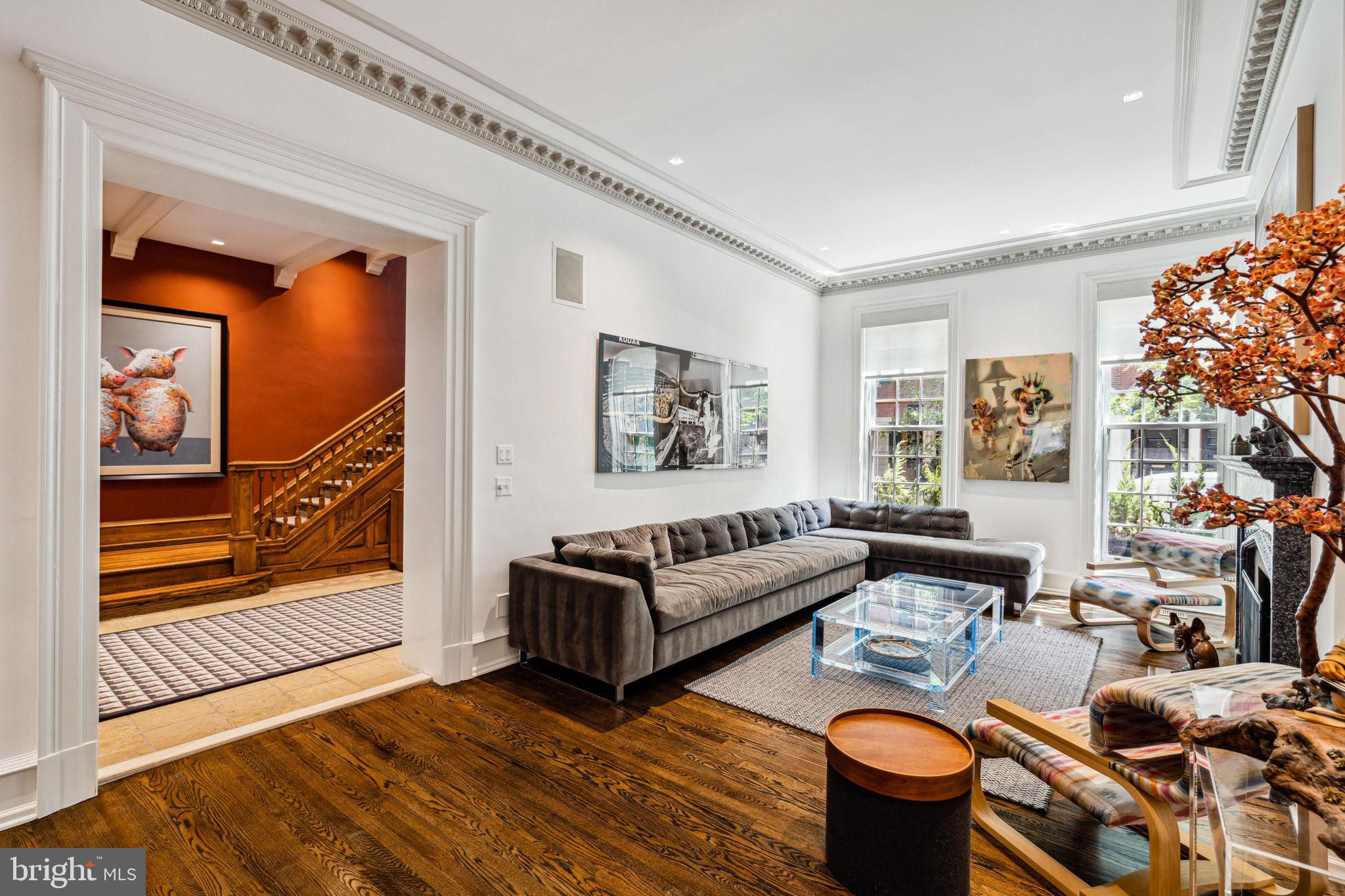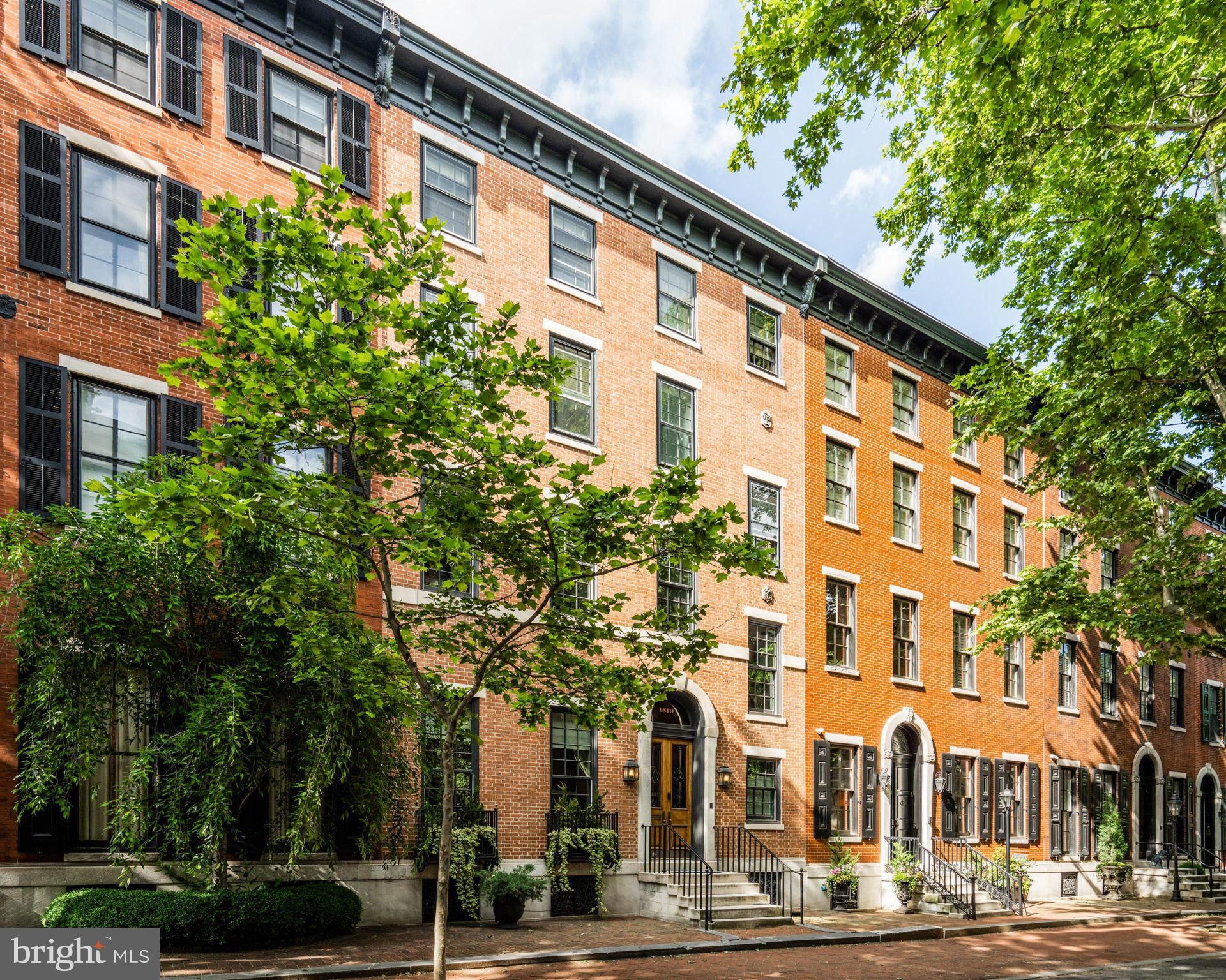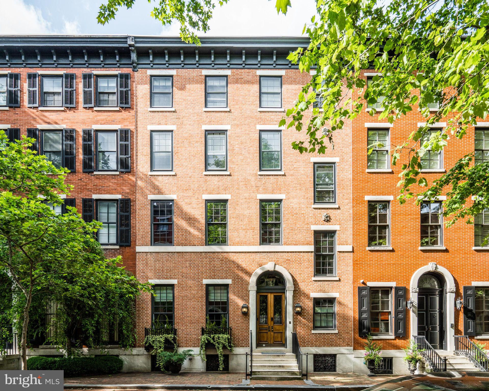 The epitome of elegance and grace, 1819 Delancey Place is a tribute to the past with its classic brick exterior and historic details within, which blend seamlessly with its modern appointments and finishes. This stately Civil War-era build is 29 ft wide on a 75 ft lot -- allowing for grand rooms and light filled spaces which span over 6000 SF on 5 levels of living. Enter through the vestibule into a handsome foyer with the home's hallmark staircase. Off of the foyer are entrances to both the formal dining room and the living room. The living room features 14 ft ceilings, ornate crown molding and is flanked with 2 marble fireplaces. The eat-in kitchen is just as stunning as the rest with 2 vaulted skylights allowing for incredible natural light, plus gourmet appointments such as the center soapstone island, Wolf 6 Burner Range with custom hood vent, 60'' Sub-Zero Refrigerator, built-in microwave, dual sinks and ample custom cabinetry. Just off of the kitchen is a lovely patio - perfect for morning coffee, grilling and al fresco dining. The first level is complete with a powder room and coat closet. The second level of this home underwent a complete renovation on 2020 with the highest level of finish and craftsmanship. The stairway landing opens to an exquisite family room with a gas-burning fireplace with a marble mantle and custom tiger wood paneling. Adjacent to the family room is the Primary Suite which features a bedroom with custom built-ins, an en-suite bathroom with dual vanities, frosted glass shower and water closet. Additionally, the primary suite includes a 200 SF walk-in closet with custom walnut millwork, plus a conveniently located bonus laundry room. The 3rd floor includes 2 bedrooms with 2 renovated hall bathrooms, plus a home office. The top level of this home features 2 additional bedrooms (one is currently being used as a home gym) with a marble bathroom, plus a cedar closet and large custom outfitted storage room. The lower level is an additional 1000 sf of living space which includes a media room with a wet bar with refrigerator & built-in 132 bottle wine cooler plus a very special "Mummers" powder room. Also on this level is a large mud room with full size washer & dryer, storage room, coat closet and access to the 2-car side-by-side garage. Additional features include an elevator which services all 5 levels, a home automation system, recently upgraded multi-zoned HVAC, new historic certified custom windows and a new roof.
