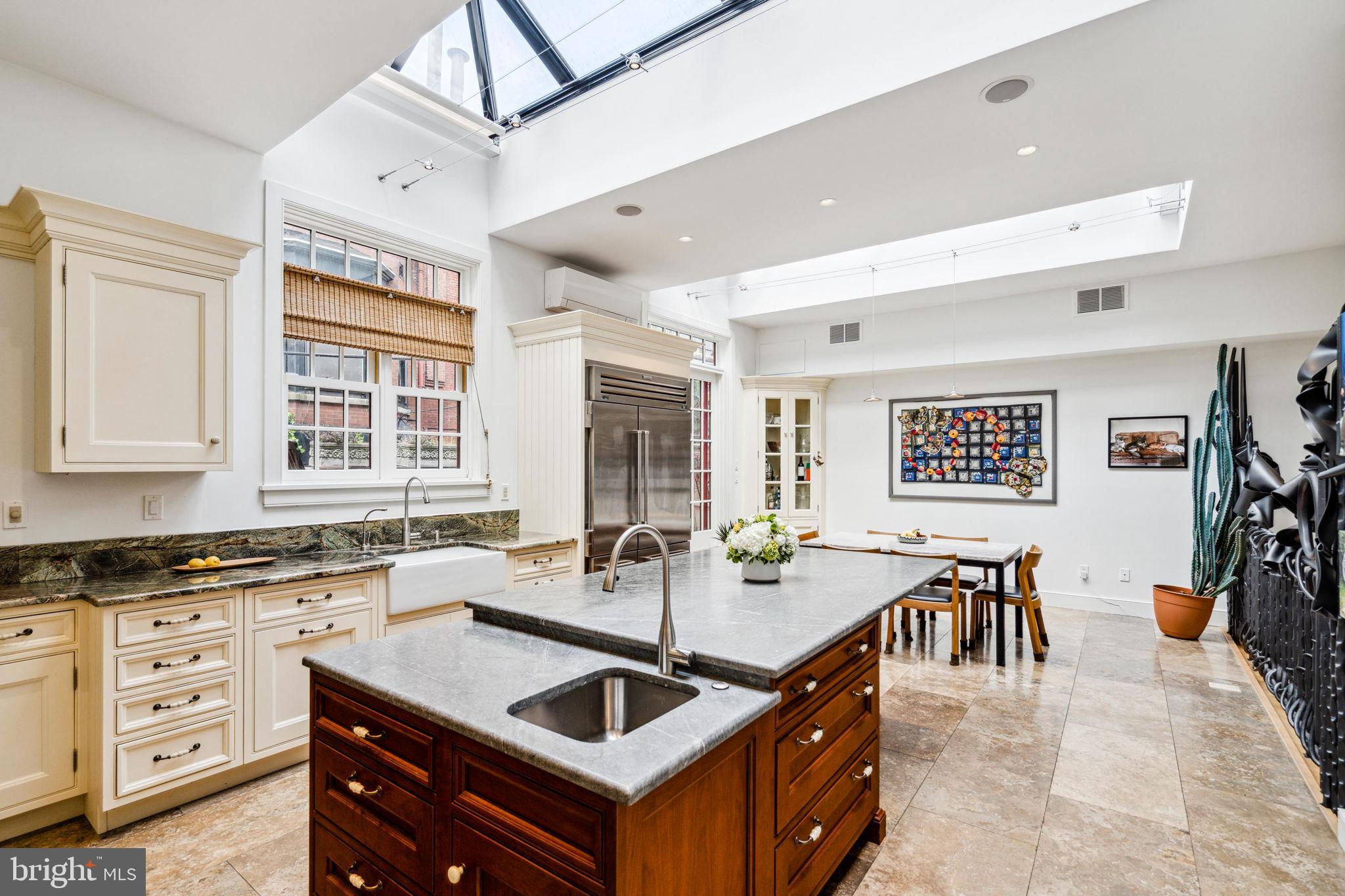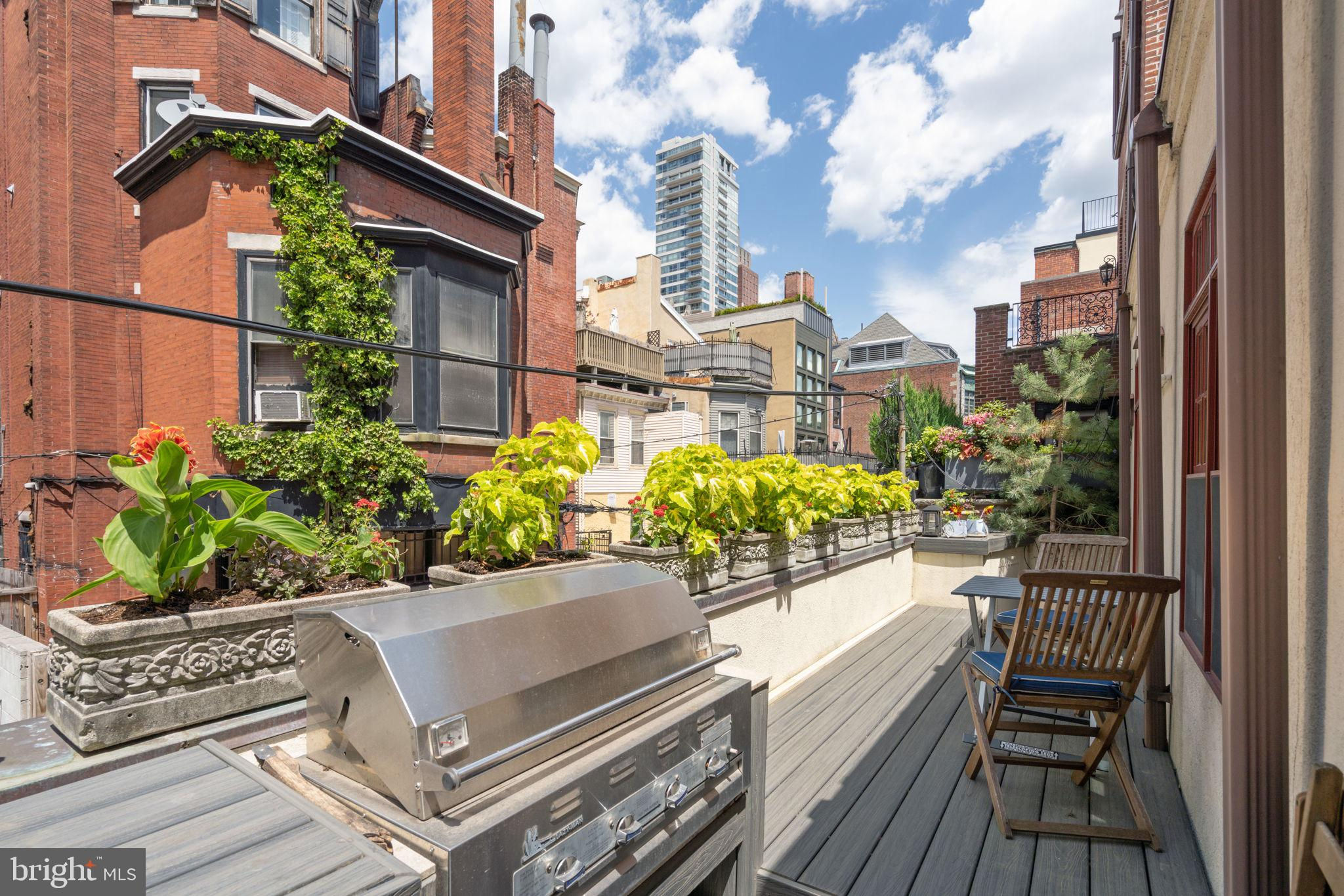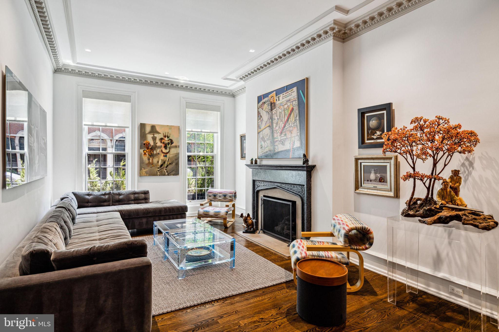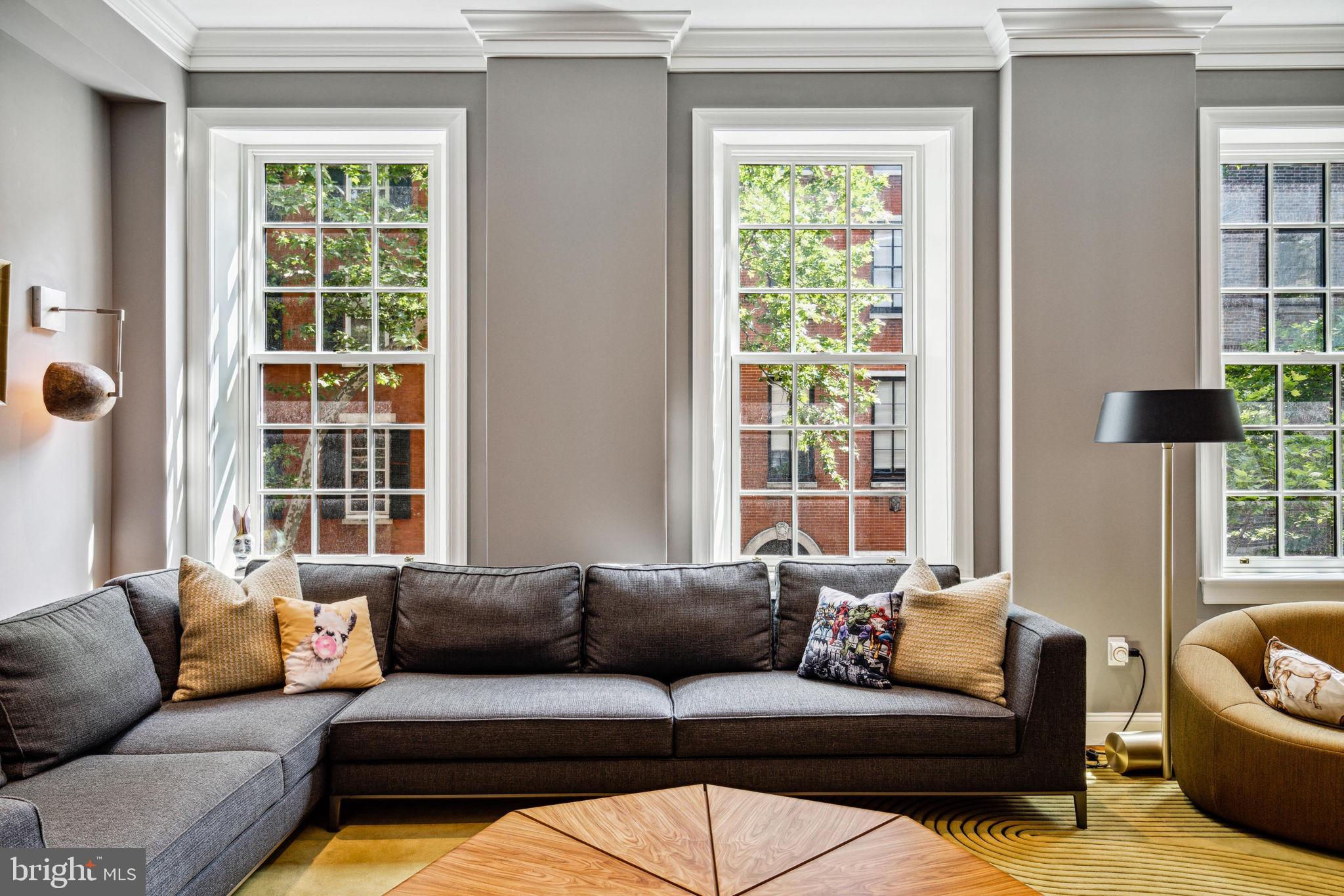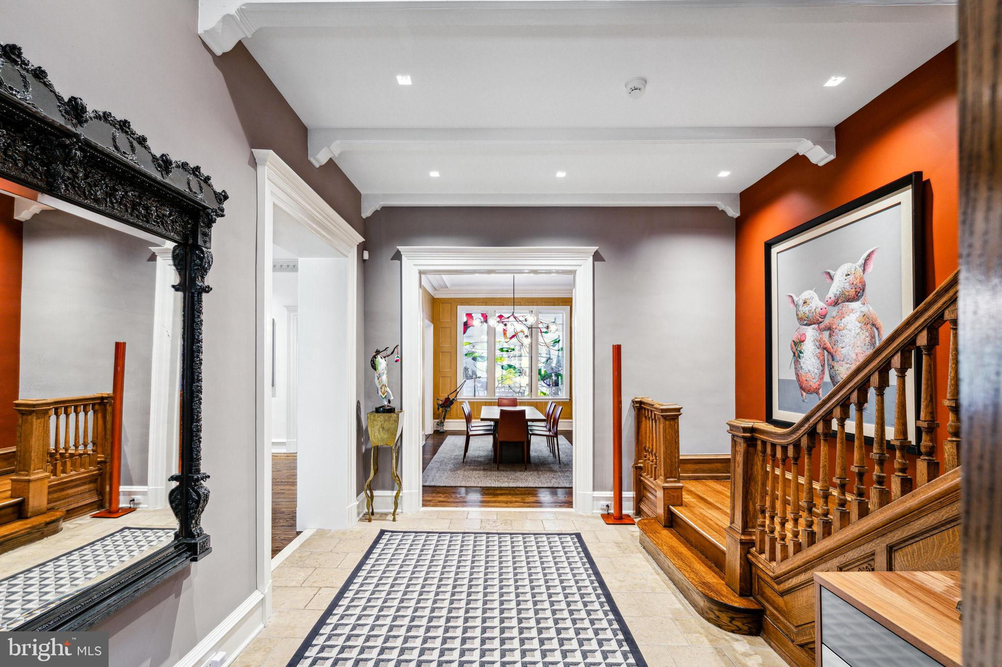 The epitome of elegance and grace, 1819 Delancey Place is a tribute to the past with its classic brick exterior and historic details within, which blend seamlessly with its modern appointments and finishes. This stately Civil War-era build is 29 ft wide on a 75 ft lot -- allowing for grand rooms and light filled spaces which span over 6000 SF on 5 levels of living. Enter through the vestibule into a handsome foyer with the home's hallmark staircase. Off of the foyer are entrances to both the formal dining room and the living room. The living room features 14 ft ceilings, ornate crown molding and is flanked with 2 marble fireplaces. The eat-in kitchen is just as stunning as the rest with 2 vaulted skylights allowing for incredible natural light, plus gourmet appointments such as the center soapstone island, Wolf 6 Burner Range with custom hood vent, 60'' Sub-Zero Refrigerator, built-in microwave, dual sinks and ample custom cabinetry. Just off of the kitchen is a lovely patio - perfect for morning coffee, grilling and al fresco dining. The first level is complete with a powder room and coat closet. The second level of this home underwent a complete renovation on 2020 with the highest level of finish and craftsmanship. The stairway landing opens to an exquisite family room with a gas-burning fireplace with a marble mantle and custom tiger wood paneling. Adjacent to the family room is the Primary Suite which features a bedroom with custom built-ins, an en-suite bathroom with dual vanities, frosted glass shower and water closet. Additionally, the primary suite includes a 200 SF walk-in closet with custom walnut millwork, plus a conveniently located bonus laundry room. The 3rd floor includes 2 bedrooms with 2 renovated hall bathrooms, plus a home office. The top level of this home features 2 additional bedrooms (one is currently being used as a home gym) with a marble bathroom, plus a cedar closet and large custom outfitted storage room. The lower level is an additional 1000 sf of living space which includes a media room with a wet bar with refrigerator & built-in 132 bottle wine cooler plus a very special "Mummers" powder room. Also on this level is a large mud room with full size washer & dryer, storage room, coat closet and access to the 2-car side-by-side garage. Additional features include an elevator which services all 5 levels, a home automation system, recently upgraded multi-zoned HVAC, new historic certified custom windows and a new roof.