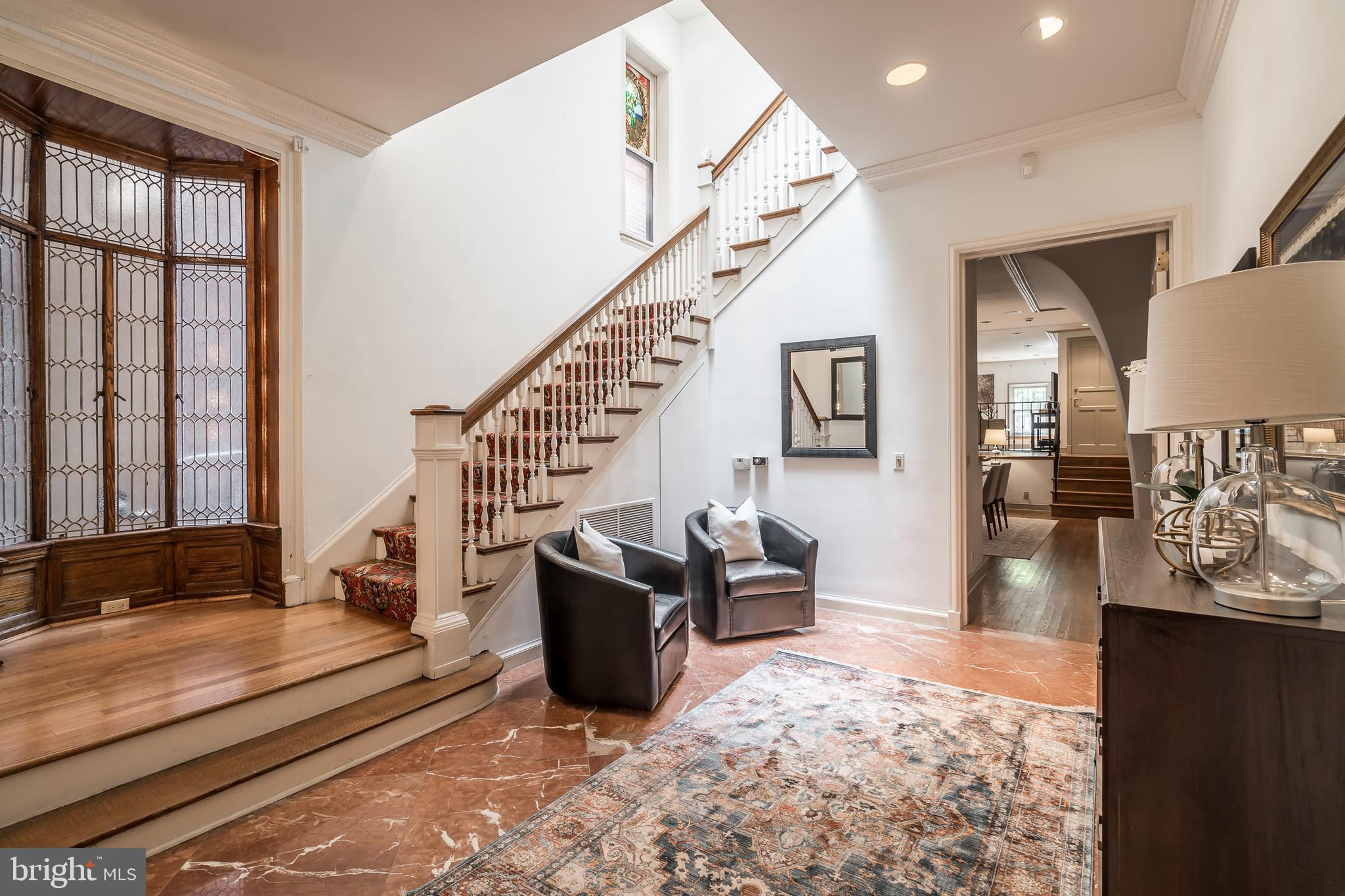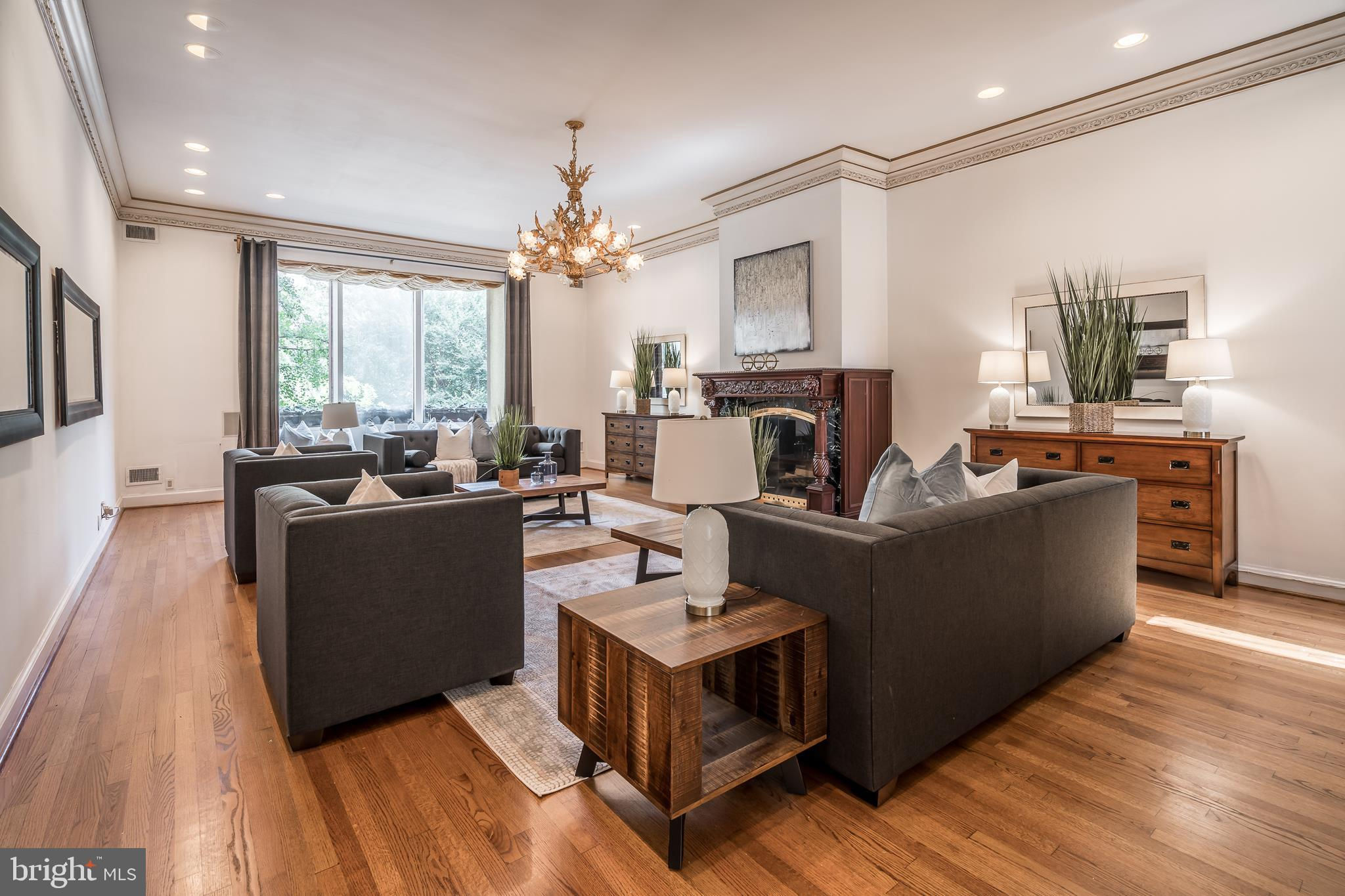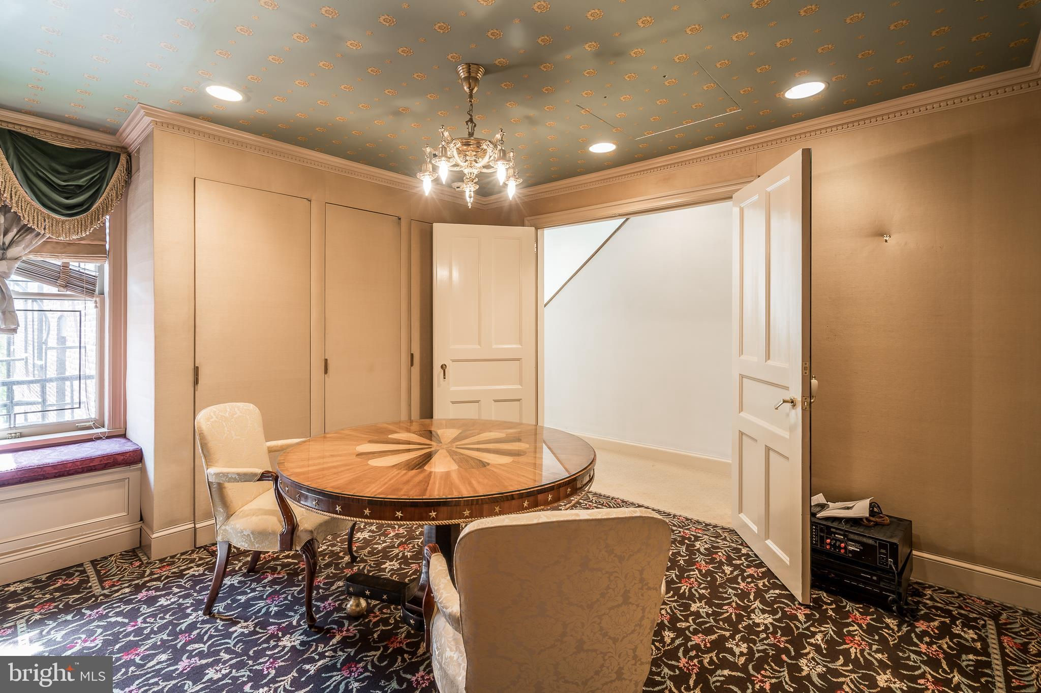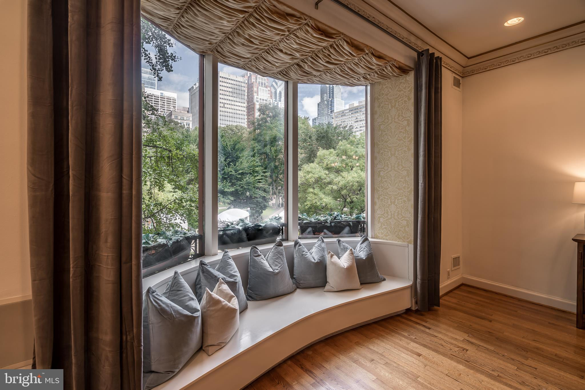 Location, location, location! One of only two townhomes on Rittenhouse Square; 1910 Rittenhouse boasts magnificent, unobstructed views of The Square. The residence has 20 of frontage along Rittenhouse Square and extends all the way back to Manning Street where there is access to a private, underground 2-car tandem garage. The first floor of the townhome features a foyer, study, entertainment room with wet bar, a second study or den and a powder room. The second floor of the townhome has a living room with working fireplace; dining room with working fireplace and ceiling mural done by a well-known European church painter; kitchen with granite countertops, custom stainless cabinets, a Sub-Zero refrigerator and an island; and a powder room. The third floor offers three bedrooms (currently being used as one bedroom, a dressing room and an exercise room), a media room with built-in bookcases, a full bathroom and a powder room. The fourth floor is a large master suite with curved wall architectural detail and three porthole windows. The lower level of the house is home to a two car tandem garage, laundry room, full bathroom and storage room. There is an atrium over the central staircase that runs the height of the home; the top of the atrium has a custom Charles Ross sculpture. All finishes, details and appointments were custom designed and installed for this house and are of the highest quality.