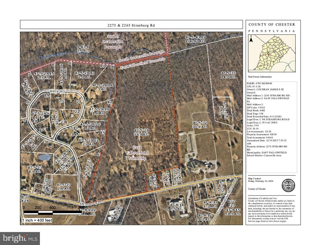 This offering is comprised of two parcels. One is a 39.9 acre parcel with a fully restored and beautiful stone bank barn with ample stalls and an on-grade loft affording ample hay and equipment storage. There are several turn-out sheds as well as multiple paddocks. A handsome stone spring house and a meandering stream enhance the property. A historic c.1790 home in need of restoration is included. Abutting this parcel is a separately deeded one acre parcel with a three bedroom, three bath home. The offering is adjacent to the sought-after Unionville equestrian mecca and offers a buyer a multitude of options. There are no restrictive easements against subdivision. This is an opportunity for a builder or someone looking to preserve land!