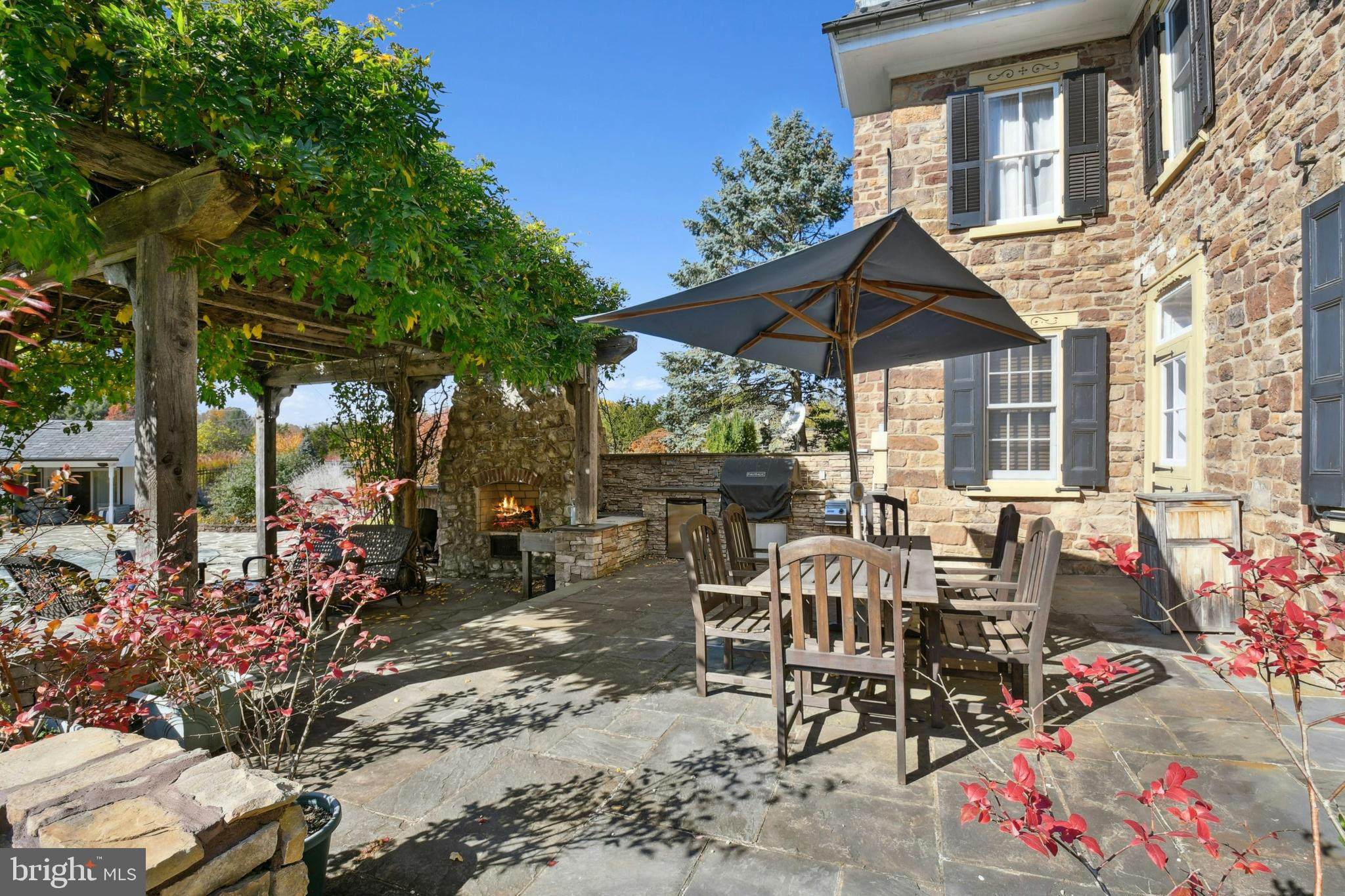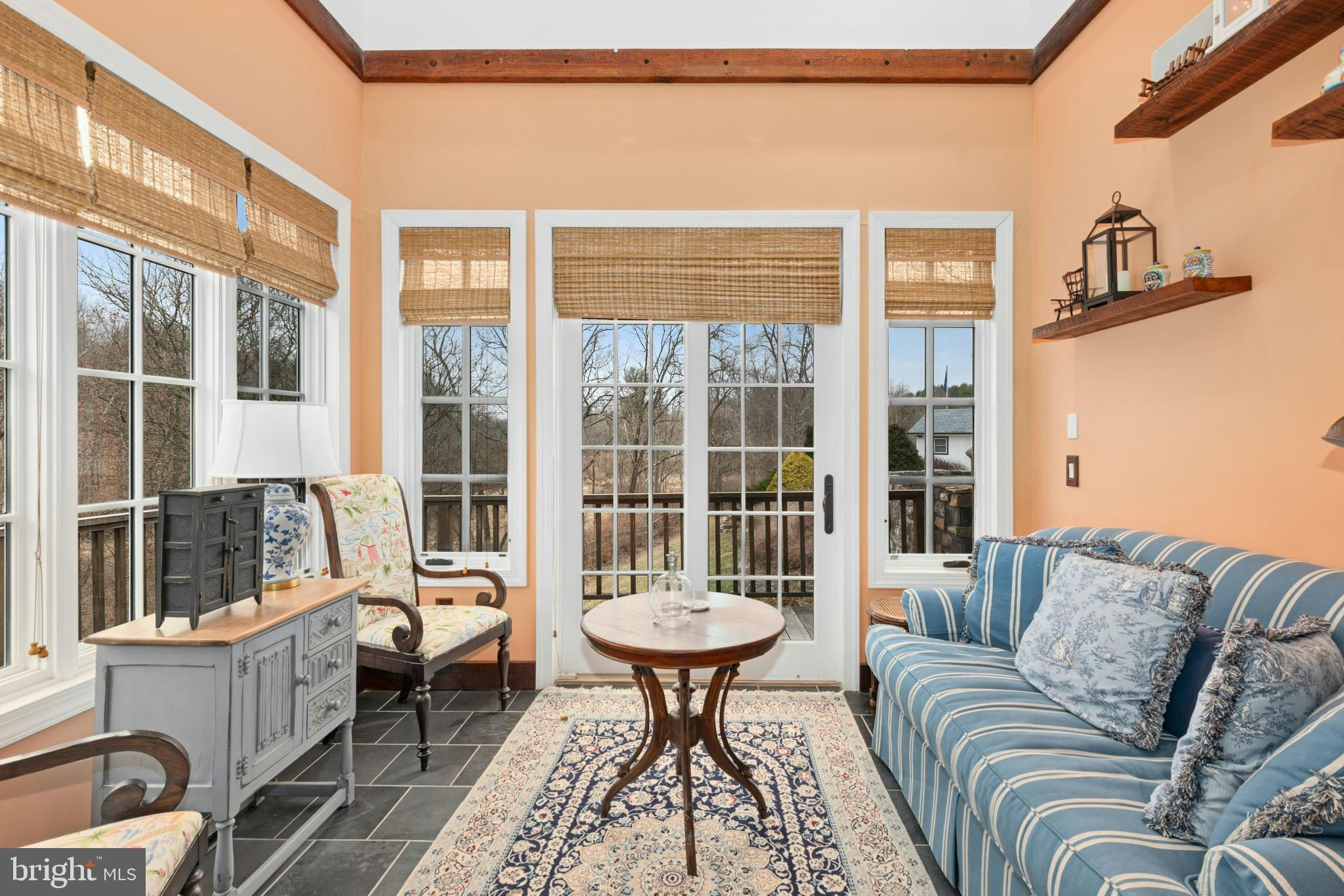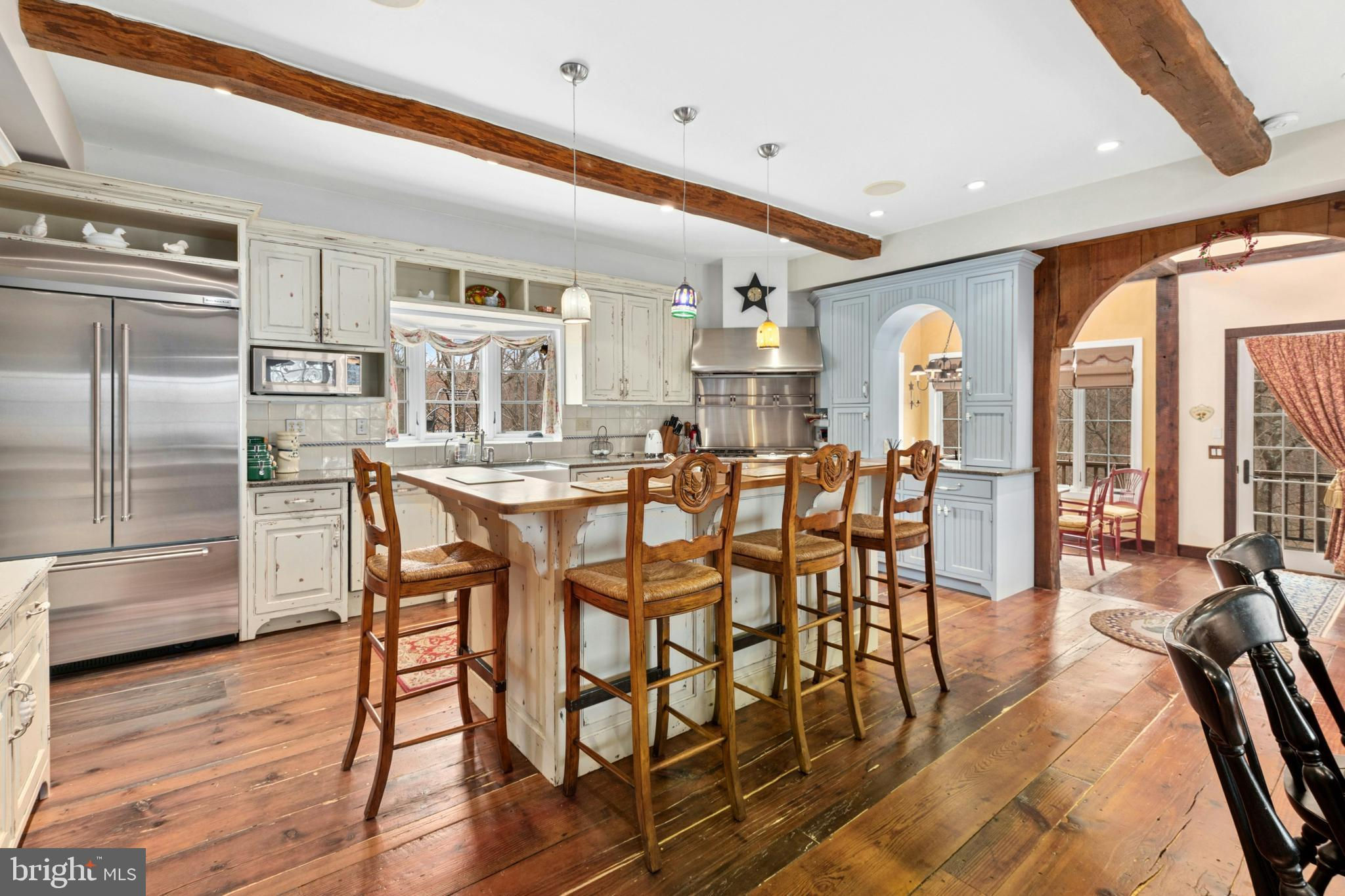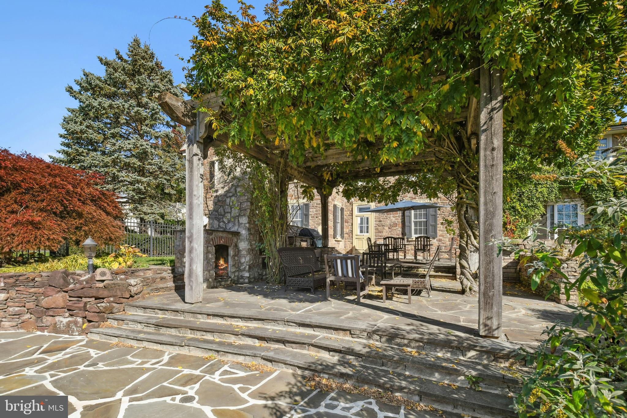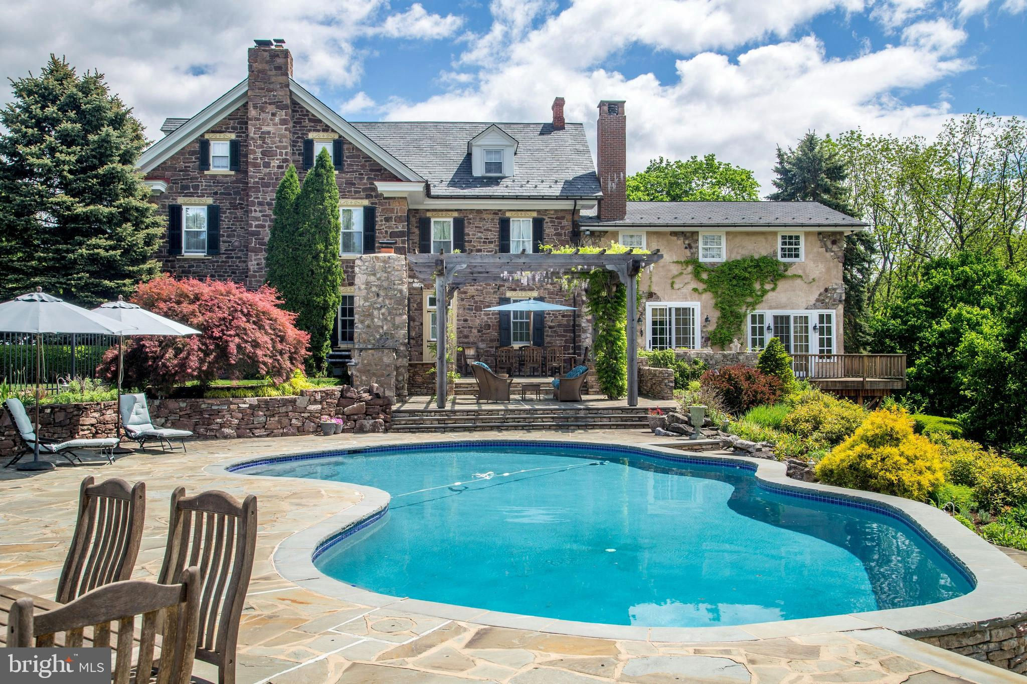 Situated amidst pastures, meadows, and hundreds of acres of preserved land, Molasses Creek Farm blends the renowned beauty of the Bucks County countryside with stunning modern enhancements. The expansive 58 acre property, set along a quiet rural road, is marked by the convergence of two pristine creeks. Built by a Revolutionary War colonel in 1795, the stone farmhouse boasts original wood floors, deep window sills, period moldings and impressive ceiling heights. The formal entry hall opens to a spacious living room, with a marble fireplace and built-ins, as well as a family room with a wood stove and surround sound entertainment. Designed with entertaining in mind, the large dining room offers built-in storage and access to the butler’s pantry. The kitchen is a chef’s dream, with antiqued cabinetry, stainless appliances, granite and butcher block countertops, and a brick wood-burning fireplace as the focal point. The perfectly poised breakfast and sitting rooms extend this remarkable gathering space, offering superb views of the sparkling pool, wisteria covered pergola, outdoor entertaining kitchen, and terraced garden. Modern luxuries are found in bright and inviting bedrooms including a soothing primary bedroom suite with dual custom walk-in closets, laundry, full sauna and sun porch bathed in warm natural light. The en suite bath includes dual vanities, a claw foot tub, and spa shower. A second suite is on this floor, as well as two additional large bedrooms that share a hall bath. The finished third floor is an unexpected delight, with a wide sitting room, two large bedrooms, and a hall bath.The lower level includes a wine cellar along with a tasting room. State of the art equine facilities include the restored original bank barn from 1803. The tiled silo has been meticulously renovated to form the feed room. Five large stalls are fitted with metal kick plates and rubber mats, and the aisle and wash area is floored in stylish brick pavers.The heated tack room has ample space above with endless possibilities. There are five fenced pastures and a round pen. The 80’ x 200’ indoor riding arena built in 2010 has been designed to match the elegant style of the house and barn, with state of the art footing and screened windows on all sides to bring in the light and breezes. Lovely gardens encircle the house, pool and outside kitchen with perennial beds featuring roses, echinacea, rudbeckia, hostas, lavender, clematis, geraniums and lilies which intermingle with hollies, yews and hydrangeas. In the rose garden stands a sundial that was custom made in England. The farmer’s milk house and carriage house with antique cobblestone courtyard stand proudly as reminders of days gone by. A synthetic turf tennis court is tucked into the hillside and a variety of plum, pear, apple and crabapple trees invite one to stroll through the orchard. The entire property is solarized with the panels discreetly hidden from view, another illustration of the harmonious blend of old and new at Molasses Creek Farm. For more than 200 years passersby have admired this graceful residence and picturesque farm located just 90 minutes from Manhattan and an hour from Philadelphia. The charming shops, innovative restaurants and cultural events of the Delaware River villages are a short drive from Molasses Creek Farm.