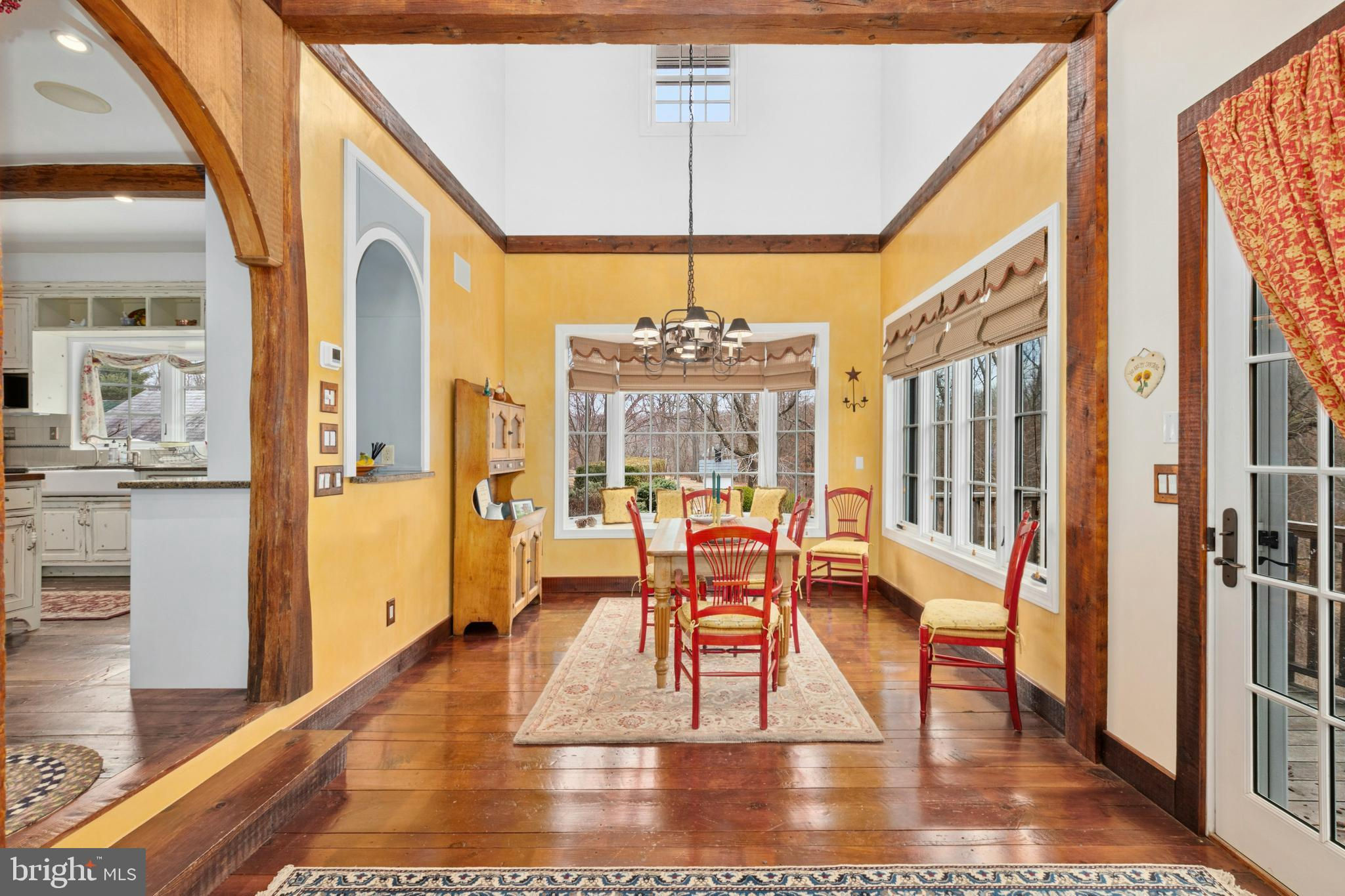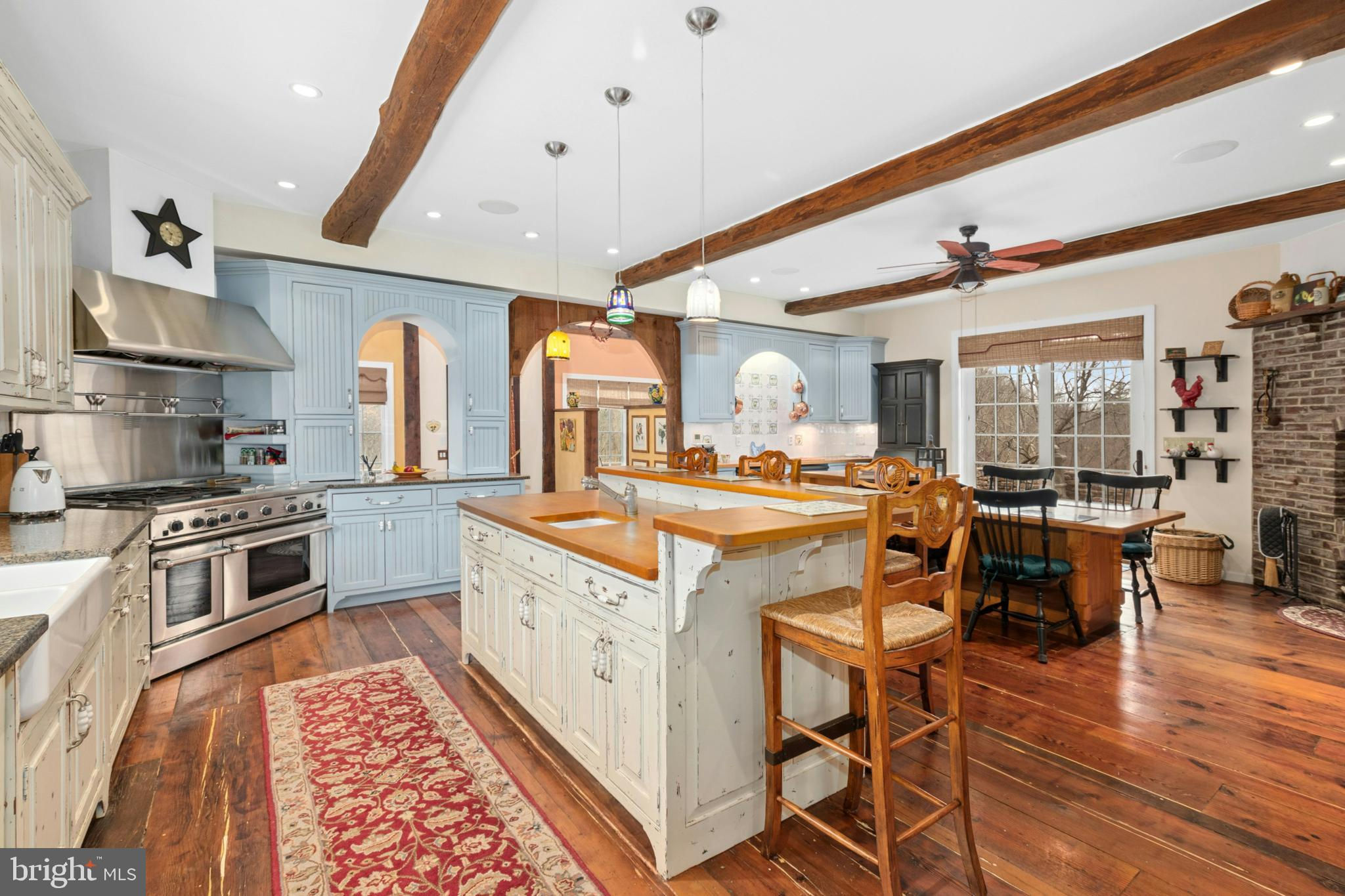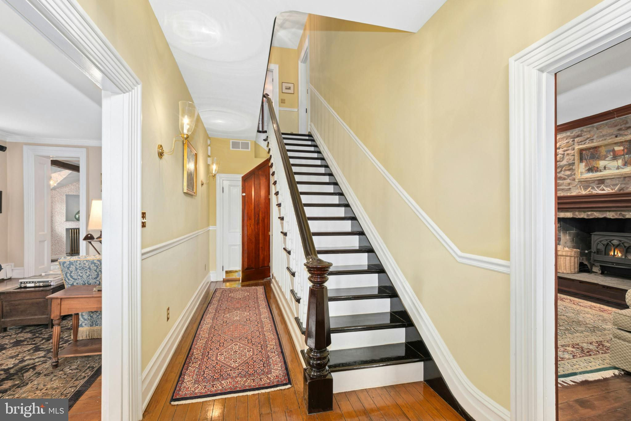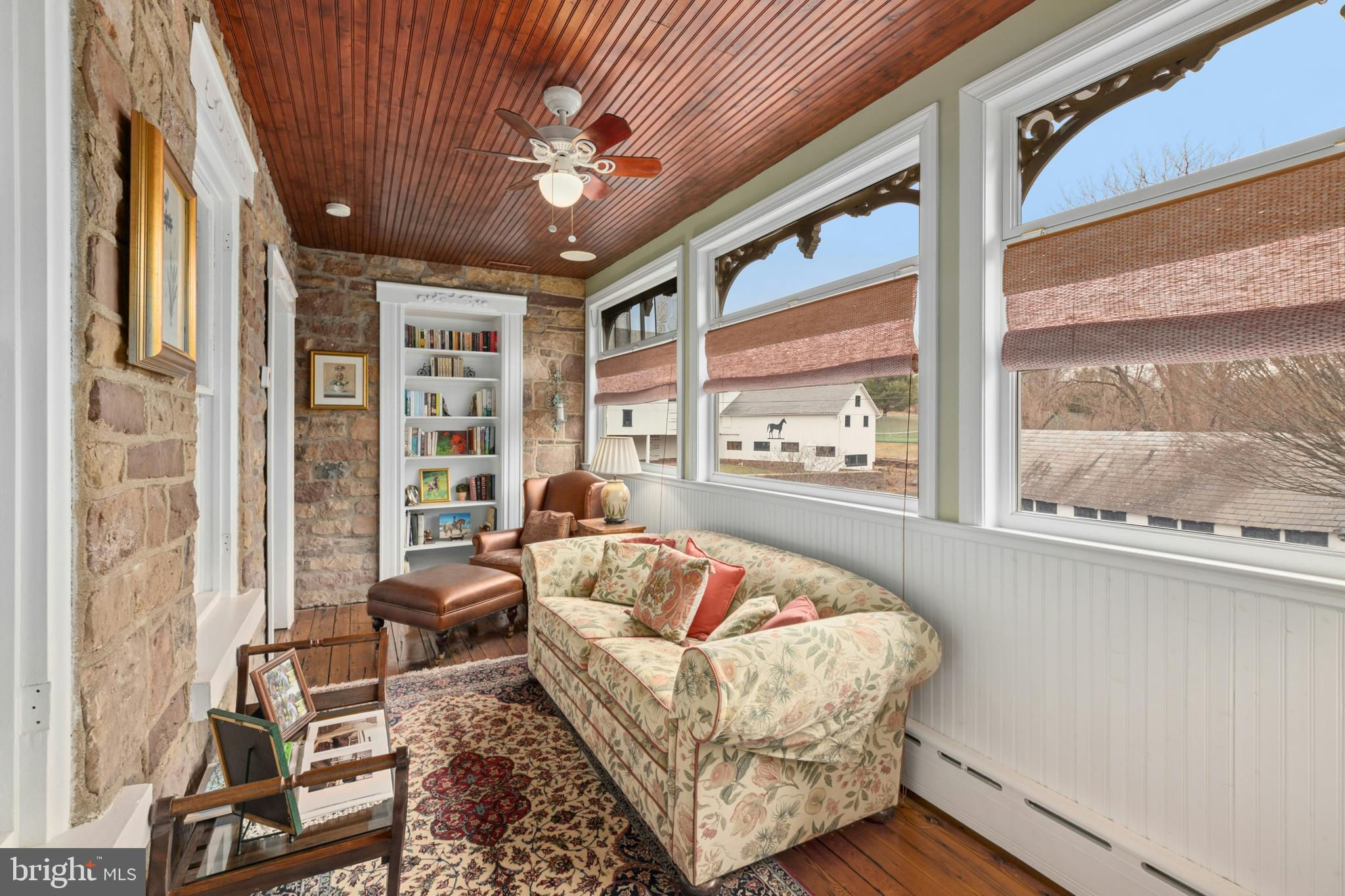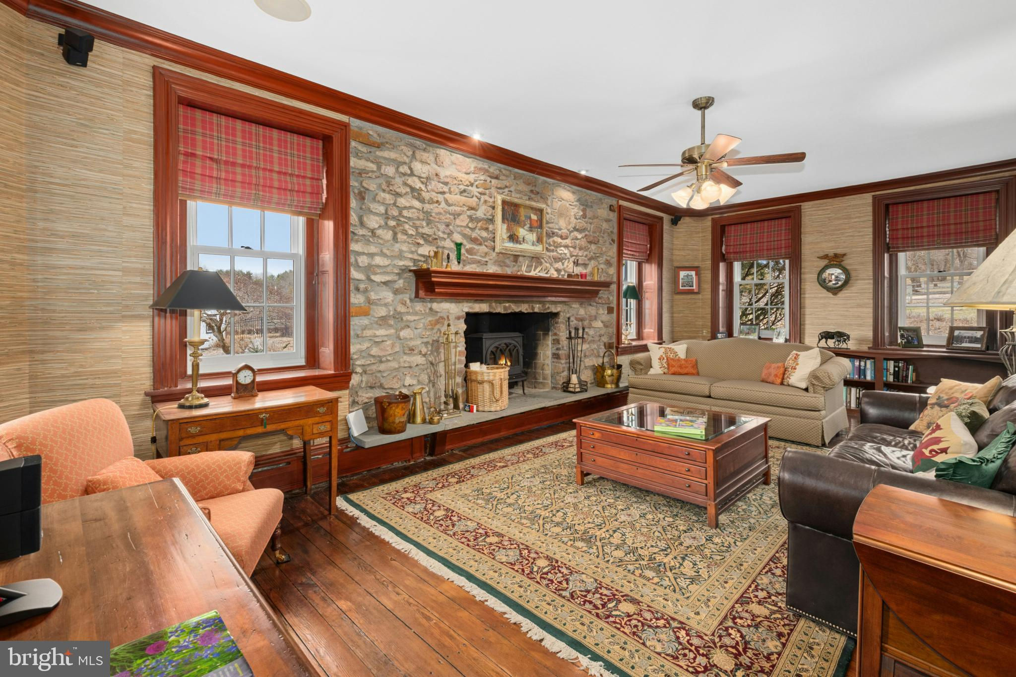 Situated amidst pastures, meadows, and hundreds of acres of preserved land, Molasses Creek Farm blends the renowned beauty of the Bucks County countryside with stunning modern enhancements. The expansive 58 acre property, set along a quiet rural road, is marked by the convergence of two pristine creeks. Built by a Revolutionary War colonel in 1795, the stone farmhouse boasts original wood floors, deep window sills, period moldings and impressive ceiling heights. The formal entry hall opens to a spacious living room, with a marble fireplace and built-ins, as well as a family room with a wood stove and surround sound entertainment. Designed with entertaining in mind, the large dining room offers built-in storage and access to the butler’s pantry. The kitchen is a chef’s dream, with antiqued cabinetry, stainless appliances, granite and butcher block countertops, and a brick wood-burning fireplace as the focal point. The perfectly poised breakfast and sitting rooms extend this remarkable gathering space, offering superb views of the sparkling pool, wisteria covered pergola, outdoor entertaining kitchen, and terraced garden. Modern luxuries are found in bright and inviting bedrooms including a soothing primary bedroom suite with dual custom walk-in closets, laundry, full sauna and sun porch bathed in warm natural light. The en suite bath includes dual vanities, a claw foot tub, and spa shower. A second suite is on this floor, as well as two additional large bedrooms that share a hall bath. The finished third floor is an unexpected delight, with a wide sitting room, two large bedrooms, and a hall bath.The lower level includes a wine cellar along with a tasting room. State of the art equine facilities include the restored original bank barn from 1803. The tiled silo has been meticulously renovated to form the feed room. Five large stalls are fitted with metal kick plates and rubber mats, and the aisle and wash area is floored in stylish brick pavers.The heated tack room has ample space above with endless possibilities. There are five fenced pastures and a round pen. The 80’ x 200’ indoor riding arena built in 2010 has been designed to match the elegant style of the house and barn, with state of the art footing and screened windows on all sides to bring in the light and breezes. Lovely gardens encircle the house, pool and outside kitchen with perennial beds featuring roses, echinacea, rudbeckia, hostas, lavender, clematis, geraniums and lilies which intermingle with hollies, yews and hydrangeas. In the rose garden stands a sundial that was custom made in England. The farmer’s milk house and carriage house with antique cobblestone courtyard stand proudly as reminders of days gone by. A synthetic turf tennis court is tucked into the hillside and a variety of plum, pear, apple and crabapple trees invite one to stroll through the orchard. The entire property is solarized with the panels discreetly hidden from view, another illustration of the harmonious blend of old and new at Molasses Creek Farm. For more than 200 years passersby have admired this graceful residence and picturesque farm located just 90 minutes from Manhattan and an hour from Philadelphia. The charming shops, innovative restaurants and cultural events of the Delaware River villages are a short drive from Molasses Creek Farm.