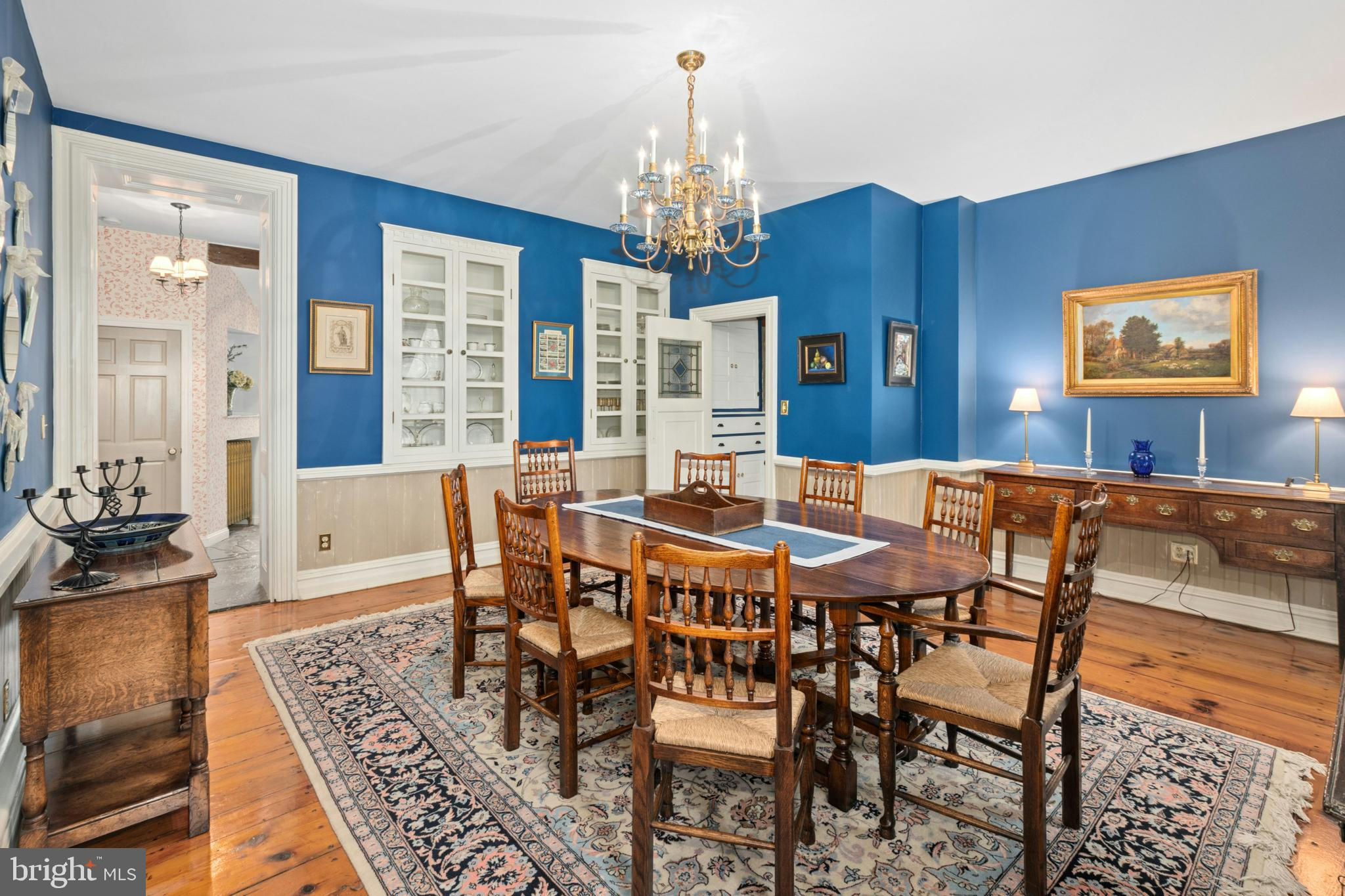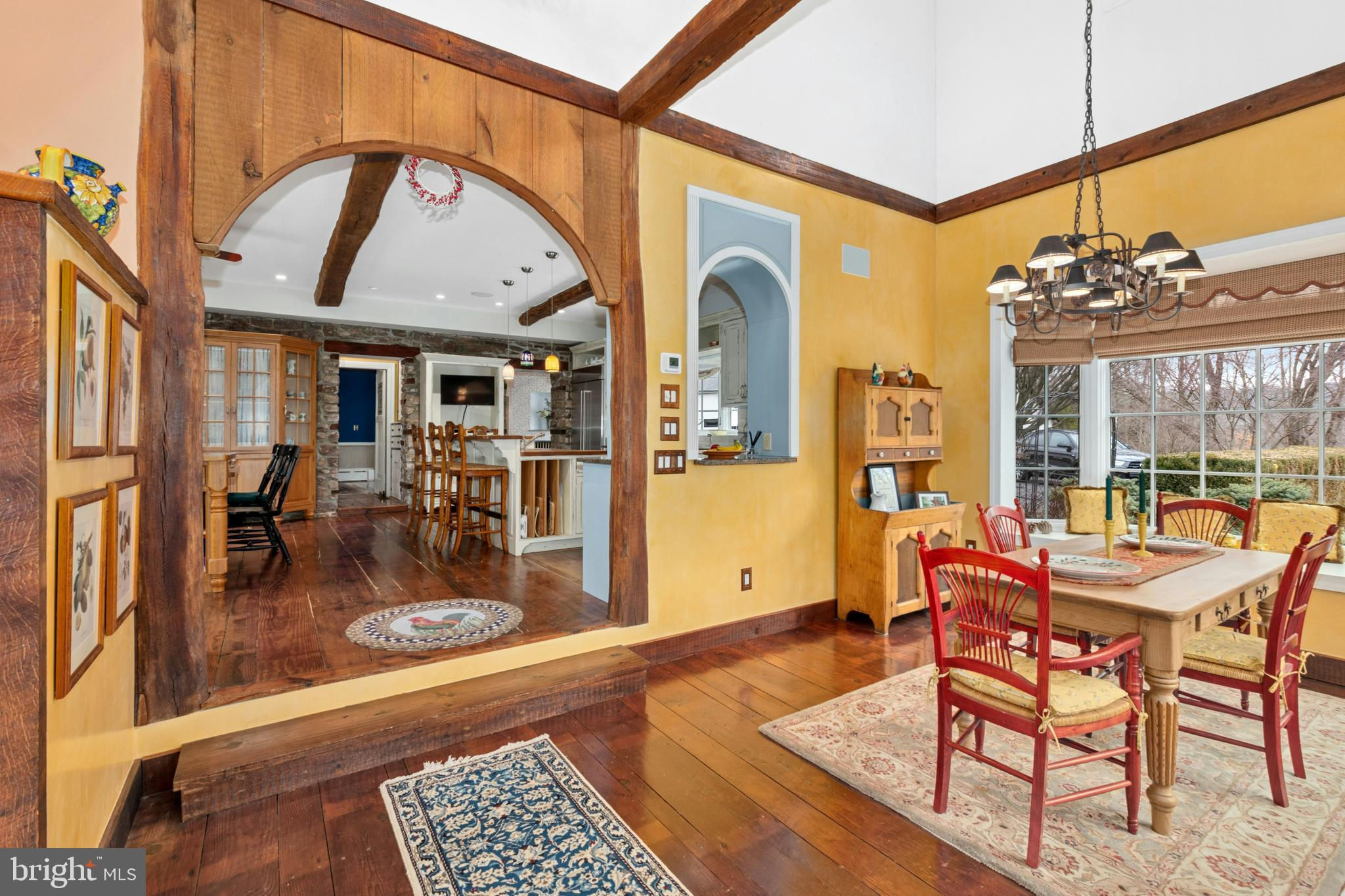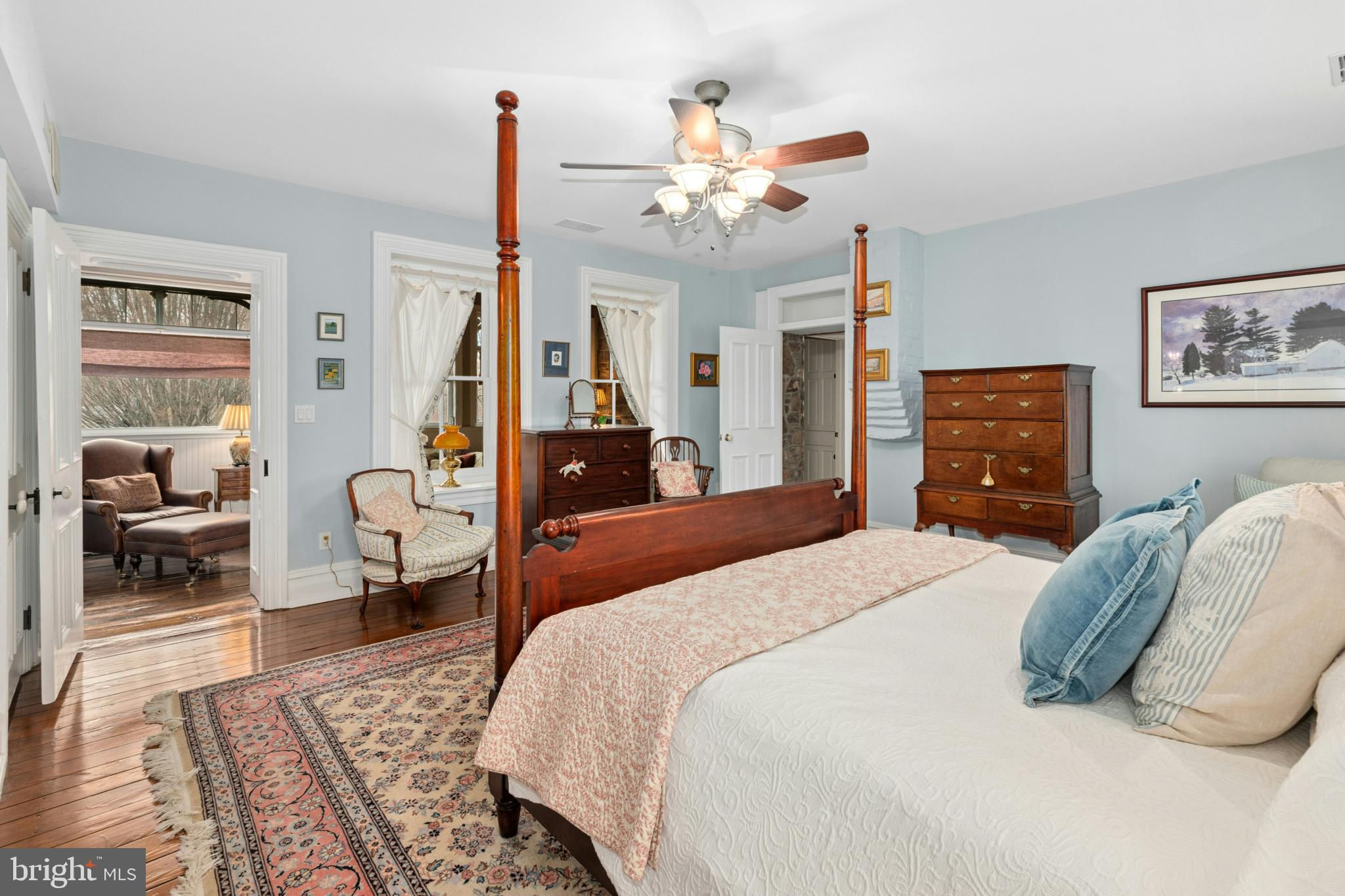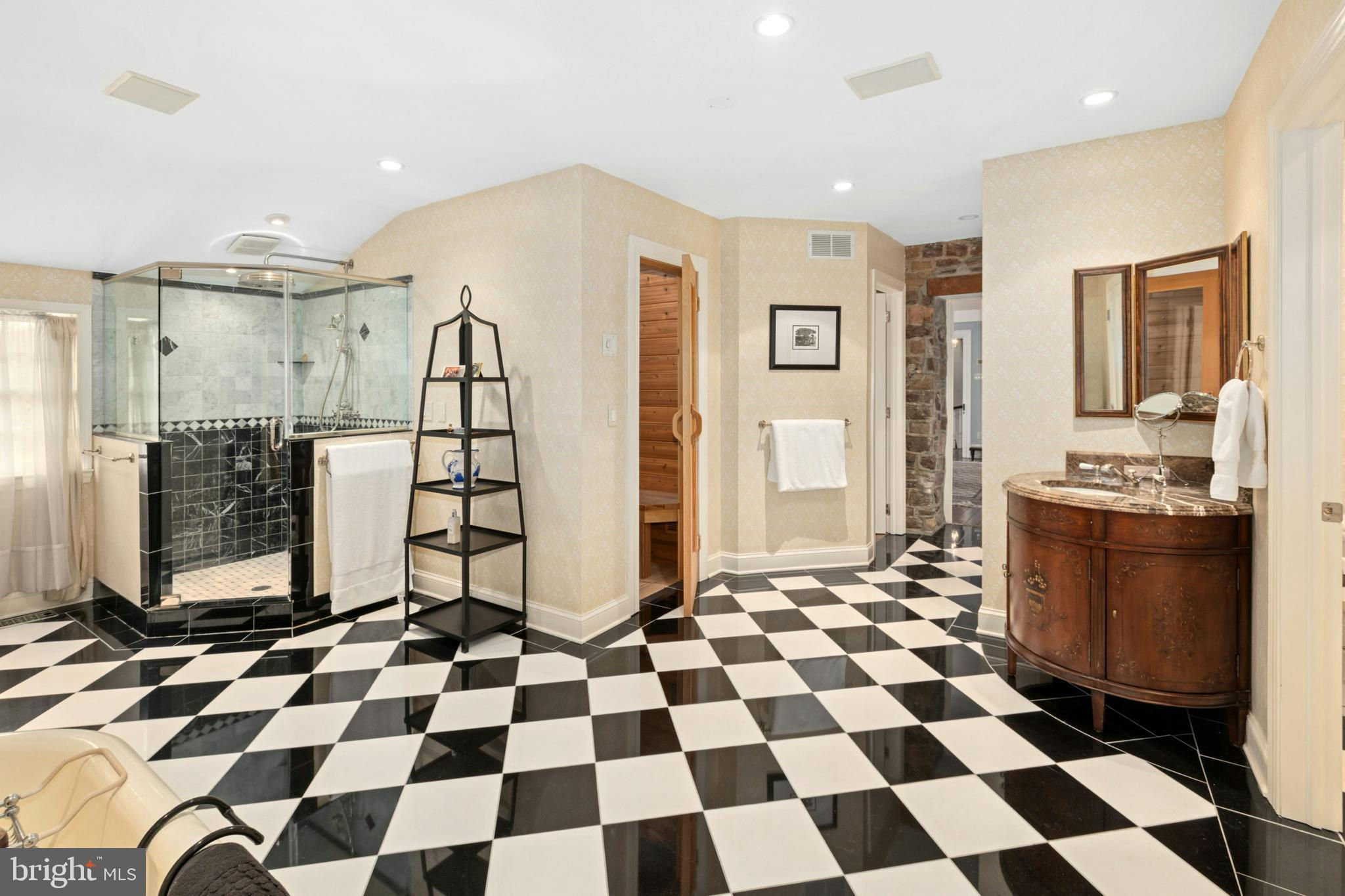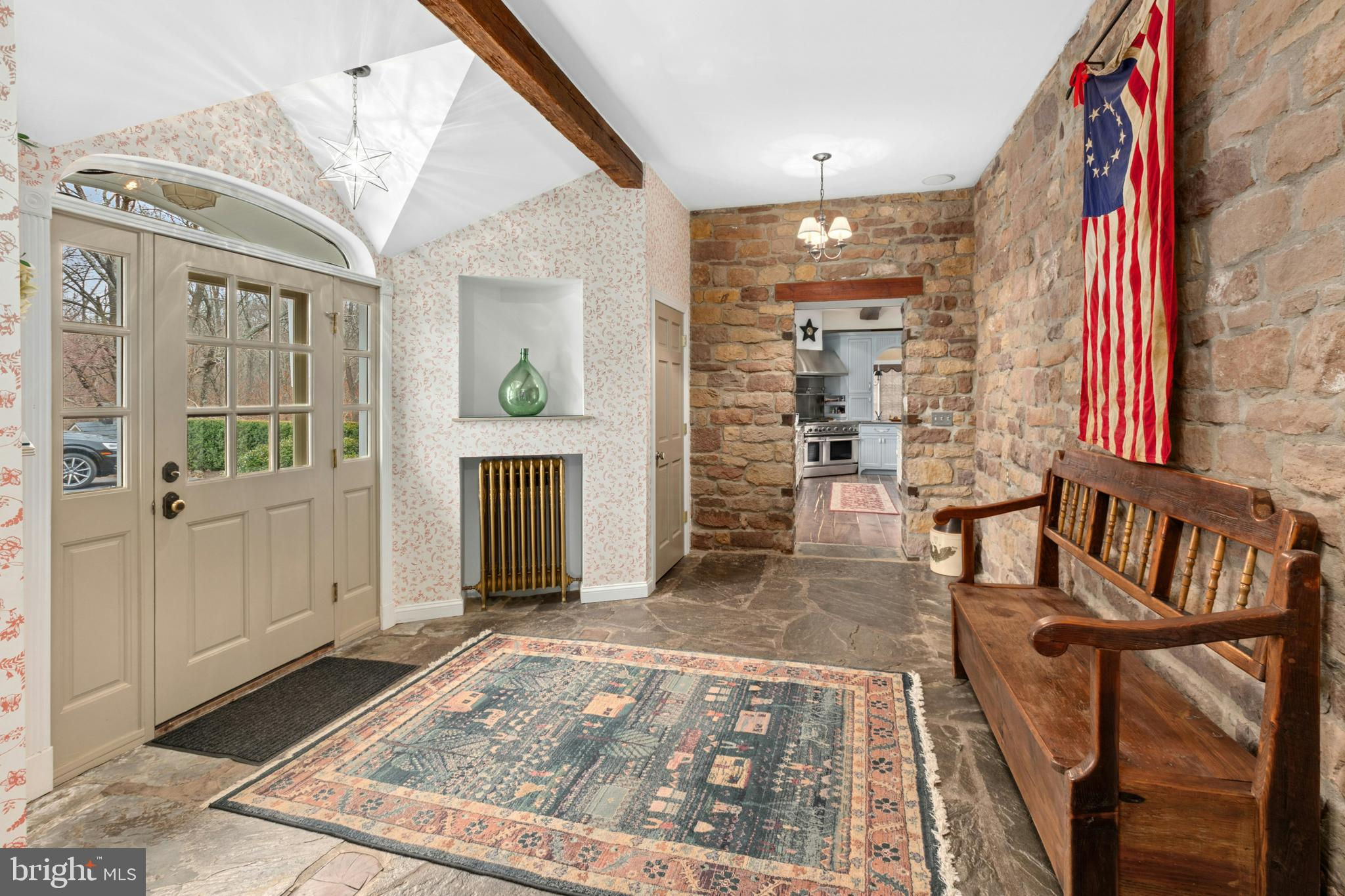 Situated amidst pastures, meadows, and hundreds of acres of preserved land, Molasses Creek Farm blends the renowned beauty of the Bucks County countryside with stunning modern enhancements. The expansive 58 acre property, set along a quiet rural road, is marked by the convergence of two pristine creeks. Built by a Revolutionary War colonel in 1795, the stone farmhouse boasts original wood floors, deep window sills, period moldings and impressive ceiling heights. The formal entry hall opens to a spacious living room, with a marble fireplace and built-ins, as well as a family room with a wood stove and surround sound entertainment. Designed with entertaining in mind, the large dining room offers built-in storage and access to the butler’s pantry. The kitchen is a chef’s dream, with antiqued cabinetry, stainless appliances, granite and butcher block countertops, and a brick wood-burning fireplace as the focal point. The perfectly poised breakfast and sitting rooms extend this remarkable gathering space, offering superb views of the sparkling pool, wisteria covered pergola, outdoor entertaining kitchen, and terraced garden. Modern luxuries are found in bright and inviting bedrooms including a soothing primary bedroom suite with dual custom walk-in closets, laundry, full sauna and sun porch bathed in warm natural light. The en suite bath includes dual vanities, a claw foot tub, and spa shower. A second suite is on this floor, as well as two additional large bedrooms that share a hall bath. The finished third floor is an unexpected delight, with a wide sitting room, two large bedrooms, and a hall bath.The lower level includes a wine cellar along with a tasting room. State of the art equine facilities include the restored original bank barn from 1803. The tiled silo has been meticulously renovated to form the feed room. Five large stalls are fitted with metal kick plates and rubber mats, and the aisle and wash area is floored in stylish brick pavers.The heated tack room has ample space above with endless possibilities. There are five fenced pastures and a round pen. The 80’ x 200’ indoor riding arena built in 2010 has been designed to match the elegant style of the house and barn, with state of the art footing and screened windows on all sides to bring in the light and breezes. Lovely gardens encircle the house, pool and outside kitchen with perennial beds featuring roses, echinacea, rudbeckia, hostas, lavender, clematis, geraniums and lilies which intermingle with hollies, yews and hydrangeas. In the rose garden stands a sundial that was custom made in England. The farmer’s milk house and carriage house with antique cobblestone courtyard stand proudly as reminders of days gone by. A synthetic turf tennis court is tucked into the hillside and a variety of plum, pear, apple and crabapple trees invite one to stroll through the orchard. The entire property is solarized with the panels discreetly hidden from view, another illustration of the harmonious blend of old and new at Molasses Creek Farm. For more than 200 years passersby have admired this graceful residence and picturesque farm located just 90 minutes from Manhattan and an hour from Philadelphia. The charming shops, innovative restaurants and cultural events of the Delaware River villages are a short drive from Molasses Creek Farm.