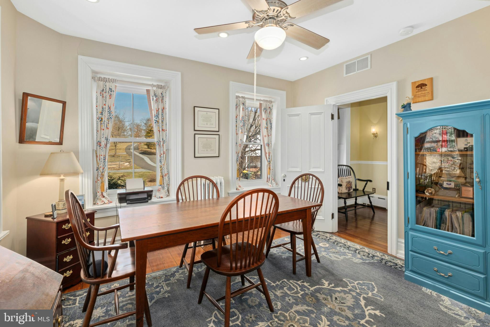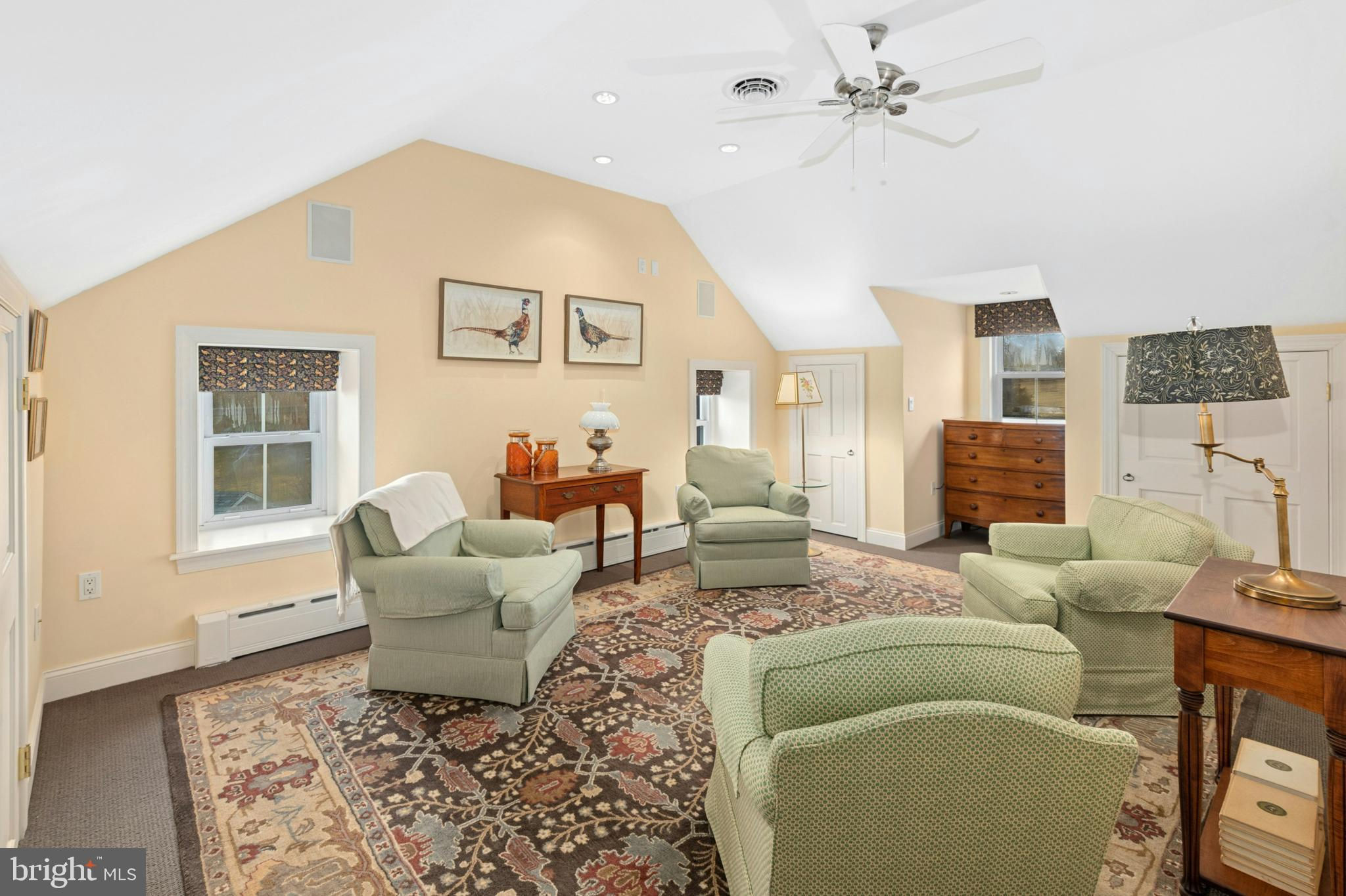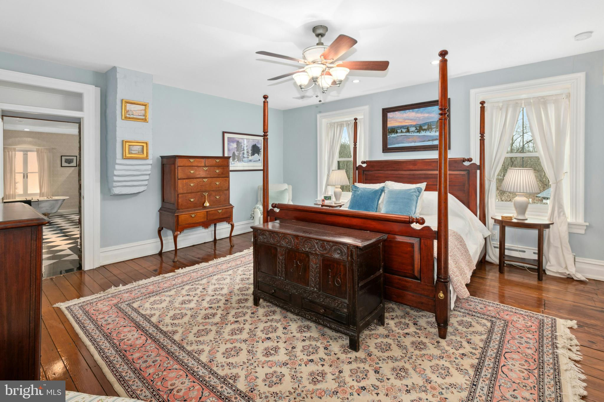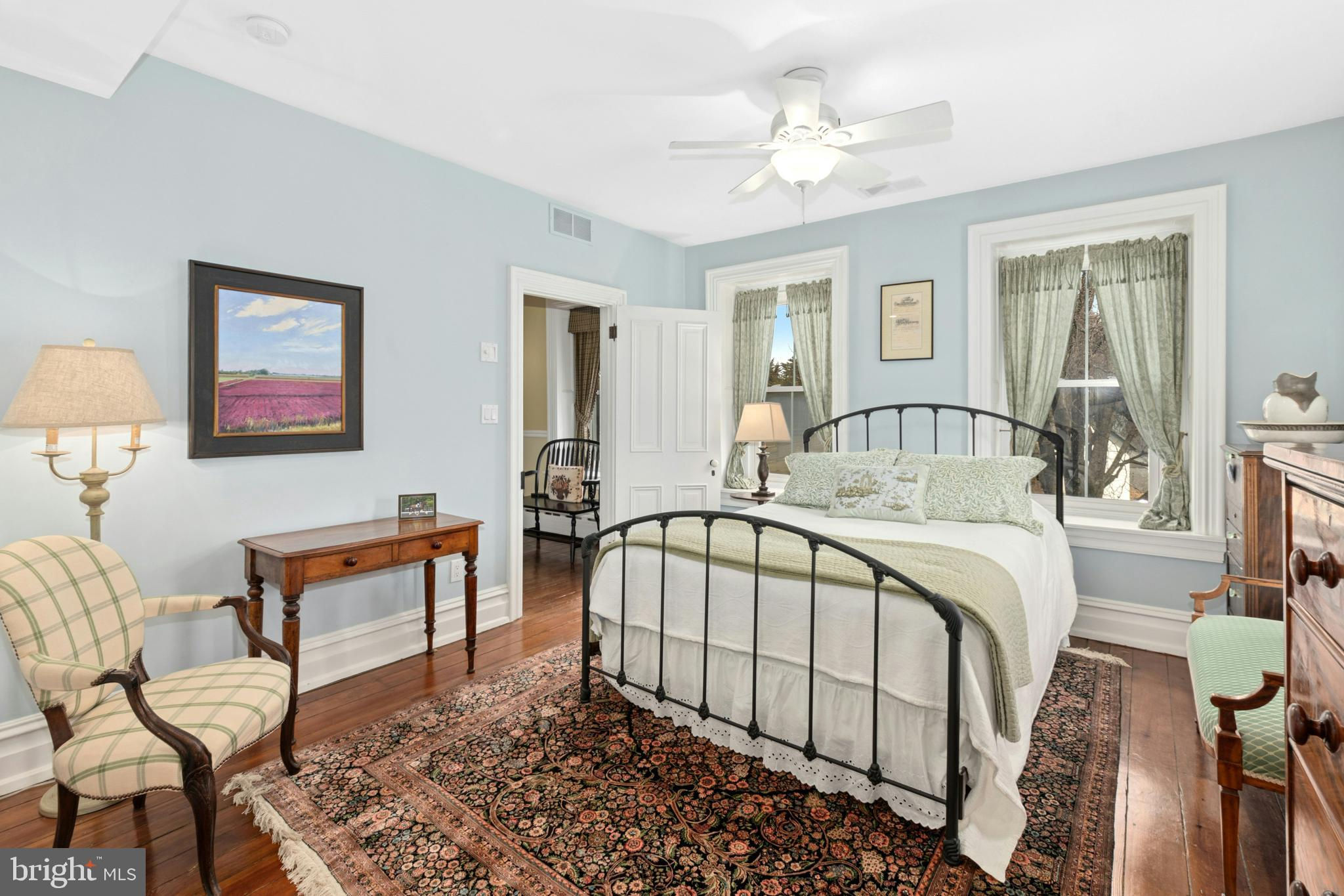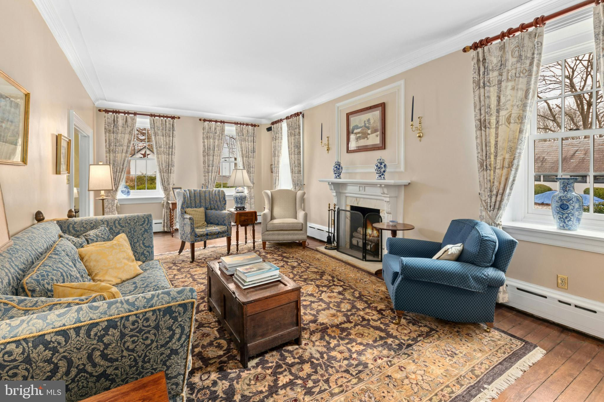 Situated amidst pastures, meadows, and hundreds of acres of preserved land, Molasses Creek Farm blends the renowned beauty of the Bucks County countryside with stunning modern enhancements. The expansive 58 acre property, set along a quiet rural road, is marked by the convergence of two pristine creeks. Built by a Revolutionary War colonel in 1795, the stone farmhouse boasts original wood floors, deep window sills, period moldings and impressive ceiling heights. The formal entry hall opens to a spacious living room, with a marble fireplace and built-ins, as well as a family room with a wood stove and surround sound entertainment. Designed with entertaining in mind, the large dining room offers built-in storage and access to the butler’s pantry. The kitchen is a chef’s dream, with antiqued cabinetry, stainless appliances, granite and butcher block countertops, and a brick wood-burning fireplace as the focal point. The perfectly poised breakfast and sitting rooms extend this remarkable gathering space, offering superb views of the sparkling pool, wisteria covered pergola, outdoor entertaining kitchen, and terraced garden. Modern luxuries are found in bright and inviting bedrooms including a soothing primary bedroom suite with dual custom walk-in closets, laundry, full sauna and sun porch bathed in warm natural light. The en suite bath includes dual vanities, a claw foot tub, and spa shower. A second suite is on this floor, as well as two additional large bedrooms that share a hall bath. The finished third floor is an unexpected delight, with a wide sitting room, two large bedrooms, and a hall bath.The lower level includes a wine cellar along with a tasting room. State of the art equine facilities include the restored original bank barn from 1803. The tiled silo has been meticulously renovated to form the feed room. Five large stalls are fitted with metal kick plates and rubber mats, and the aisle and wash area is floored in stylish brick pavers.The heated tack room has ample space above with endless possibilities. There are five fenced pastures and a round pen. The 80’ x 200’ indoor riding arena built in 2010 has been designed to match the elegant style of the house and barn, with state of the art footing and screened windows on all sides to bring in the light and breezes. Lovely gardens encircle the house, pool and outside kitchen with perennial beds featuring roses, echinacea, rudbeckia, hostas, lavender, clematis, geraniums and lilies which intermingle with hollies, yews and hydrangeas. In the rose garden stands a sundial that was custom made in England. The farmer’s milk house and carriage house with antique cobblestone courtyard stand proudly as reminders of days gone by. A synthetic turf tennis court is tucked into the hillside and a variety of plum, pear, apple and crabapple trees invite one to stroll through the orchard. The entire property is solarized with the panels discreetly hidden from view, another illustration of the harmonious blend of old and new at Molasses Creek Farm. For more than 200 years passersby have admired this graceful residence and picturesque farm located just 90 minutes from Manhattan and an hour from Philadelphia. The charming shops, innovative restaurants and cultural events of the Delaware River villages are a short drive from Molasses Creek Farm.