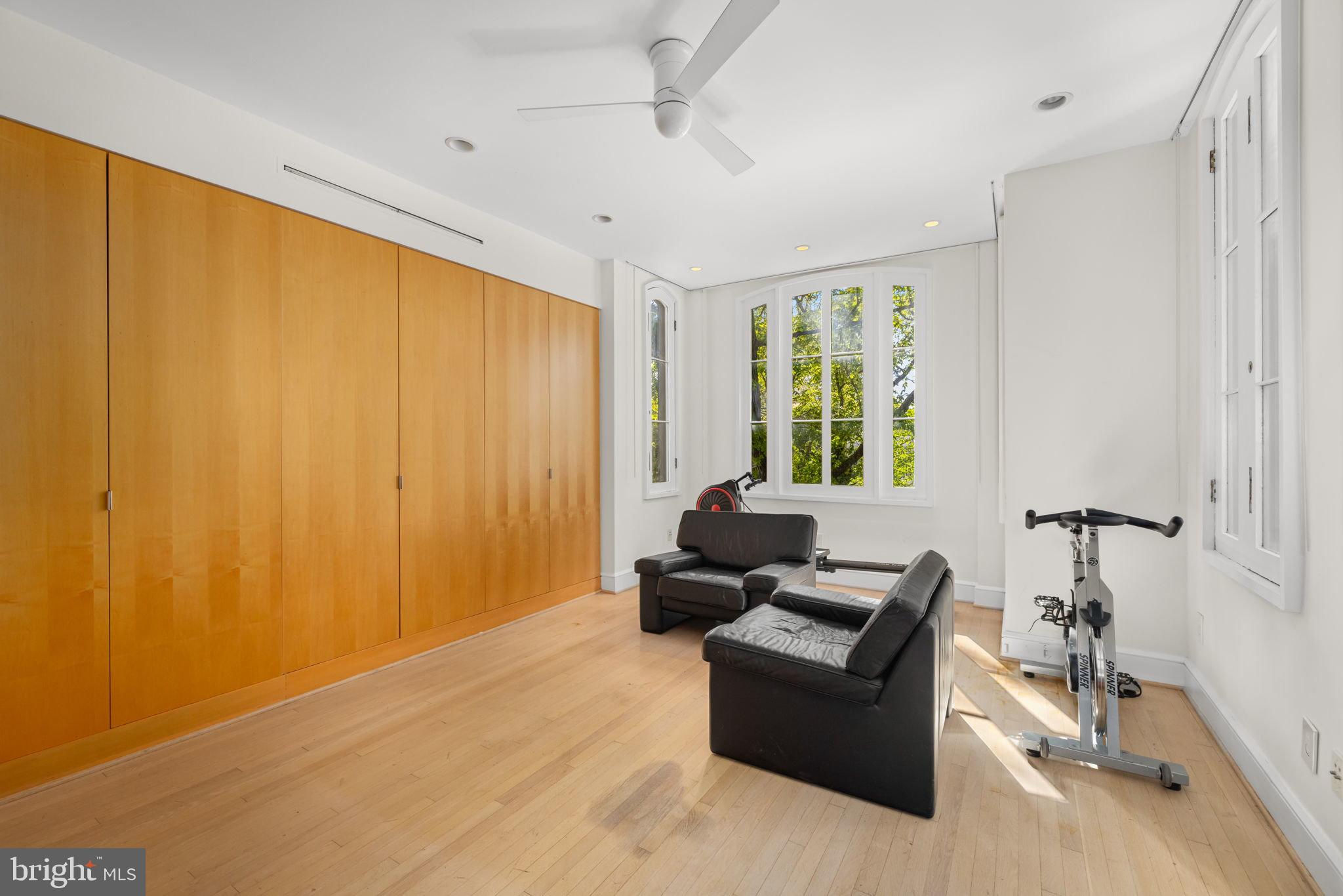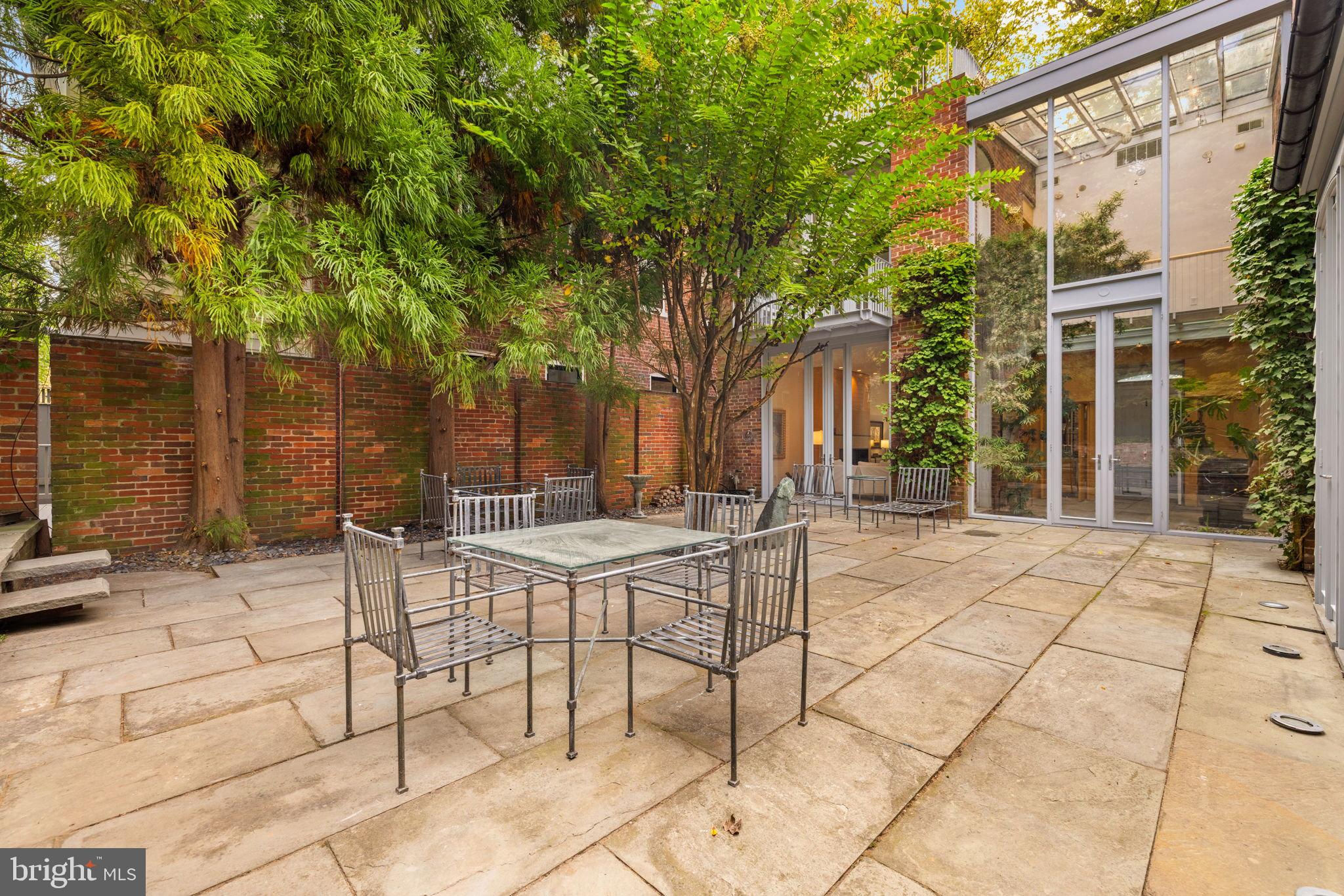 Award-winning and architecturally significant, 2813 Q Street is one of Hugh Newell Jacobsen’s earliest and defining Georgetown works. Designed in 1962, reconciles the Old Georgetown Act’s preservation standards with Jacobsen’s modernist clarity and precision. Behind its 19th-century façade lies a luminous world of soaring space, geometry, and proportion—a timeless expression of Washington modernism. A double set of entry doors opens to a two-story atrium more than twenty feet high, capped by glass ceilings and framed by tall doors to the garden and public rooms. The scale accommodates full trees indoors, while a discreet bar and deep coat closet are built in seamlessly and are hiding in plain sight. To the right, the expansive living room with massive fireplace features a south-facing bay window and glass doors to the garden. On the west side of the atrium, a south-facing library offers large windows, a fireplace, and custom cabinetry. Across the bluestone hallway is a perfectly square dining room with tall connecting doors that creates a singular flow, ideal for entertaining. The immense marble-and-stainless kitchen is filled with light and garden views, it too has a fireplace, and multiple exits to the terrace, and all the practical elements of a true chef’s kitchen. Further down the hall lies the original 1880s staircase, with lower-level stairs and a generous powder room tucked behind them. The lower level provides a lot of dry storage and laundry. Upstairs in the original house are two bedrooms, each with a unique marble-and-glass bath and wonderful views. The adjoining family room, lined with Jacobsen’s signature shelving has treetop vistas, and leads across a glass bridge spanning the atrium to the primary suite—an inspired composition of light and privacy. The suite includes a large, garden-facing bedroom, a fitted dressing room ample enough for a sitting area or gym, and a striking black marble bath. French doors open to a private balcony with a spiral staircase ascending to a remarkable roof deck overlooking the garden and Georgetown’s rooftops. The garden, designed by landscape architect Lester Collins, extends across a double lot in layered terraces of bluestone and brick centered on a broad lily pool framed by clipped Deodar cedar. It remains one of Georgetown’s most extraordinary modern landscapes—a perfect counterpart to Jacobsen’s architecture and a masterclass in the union of modern form and natural grace.