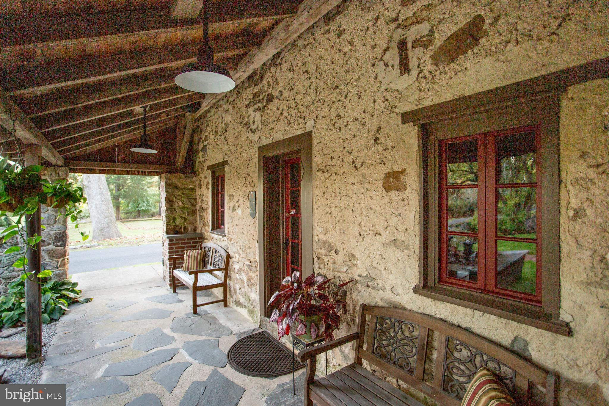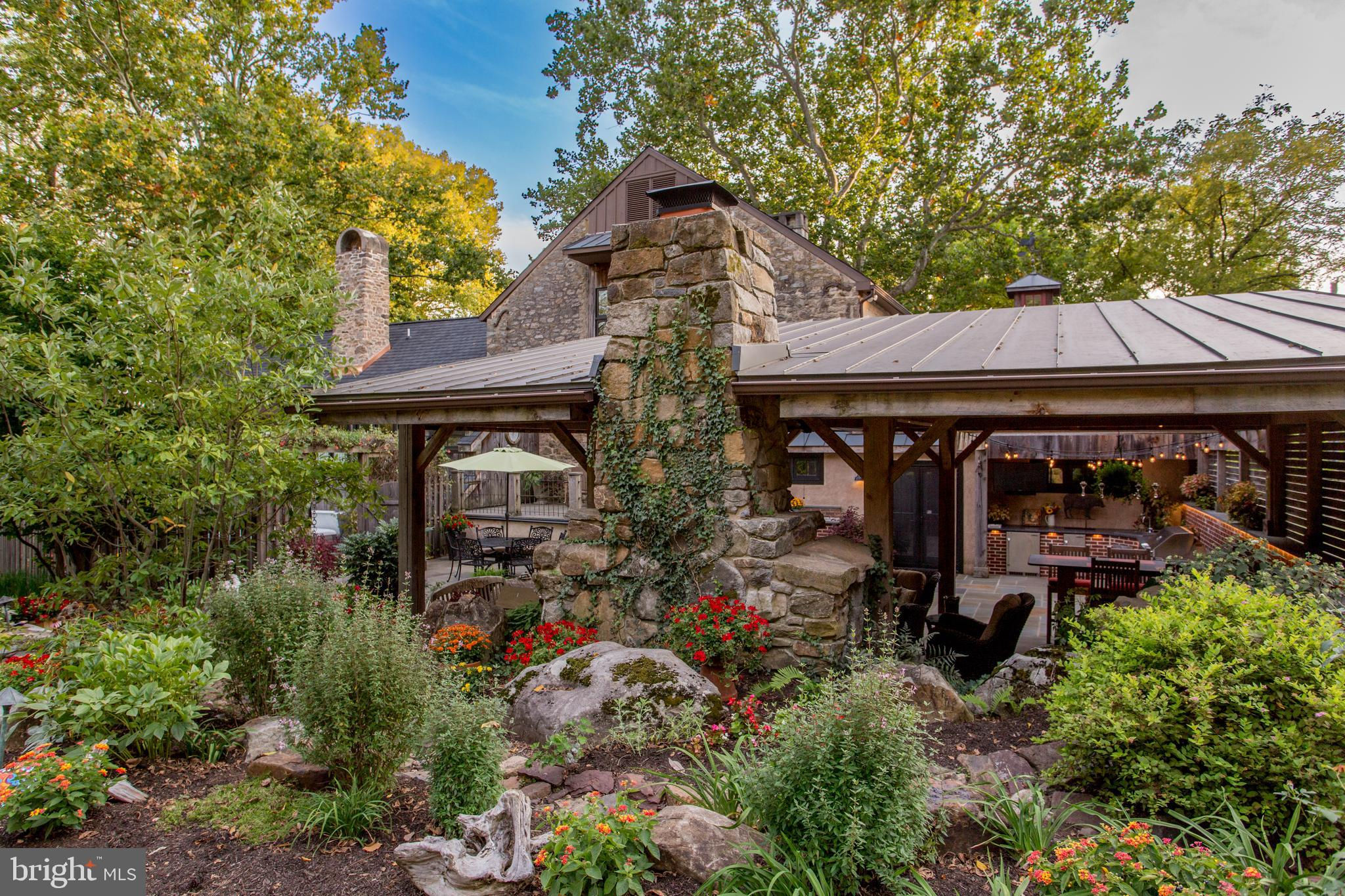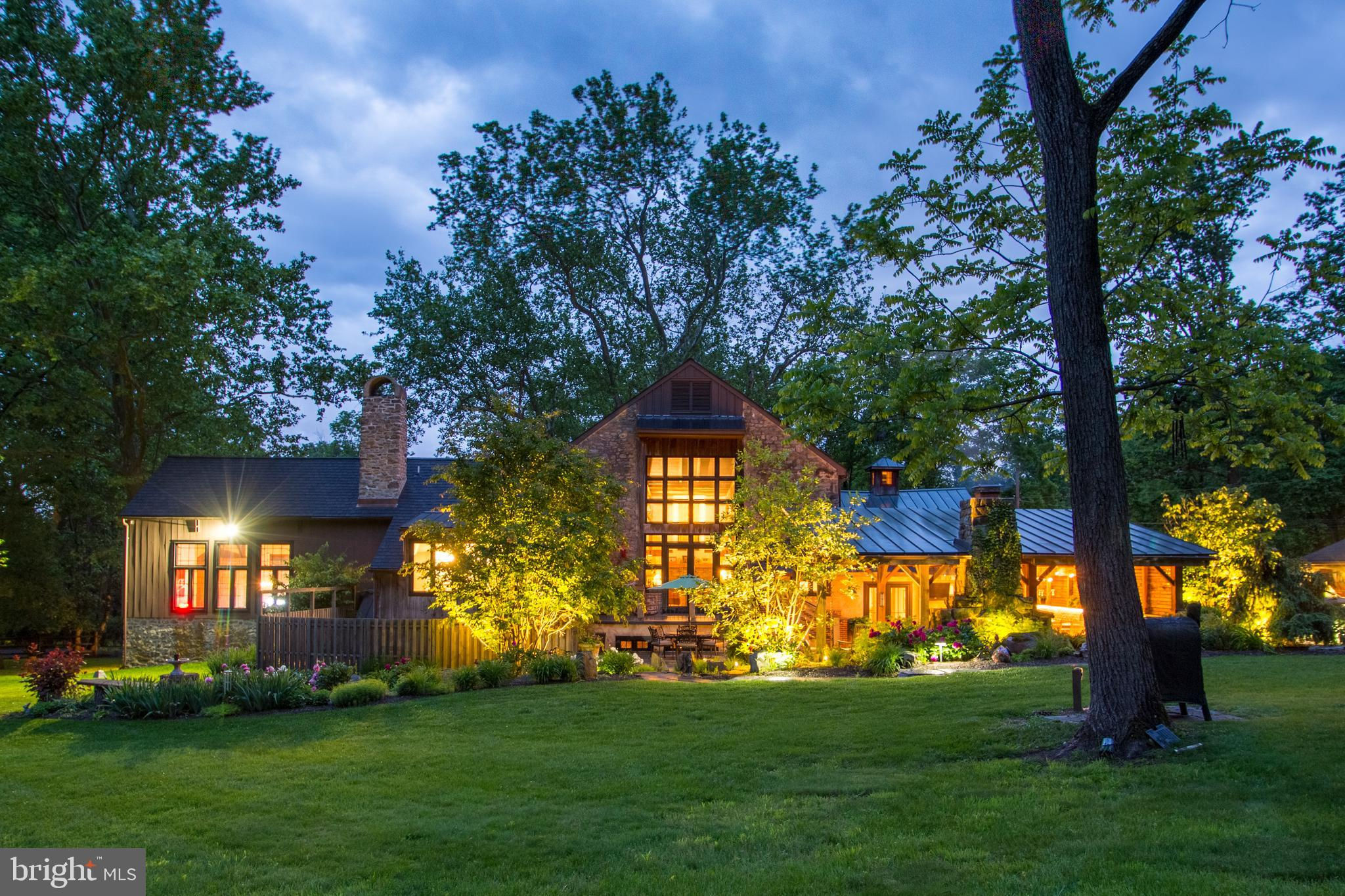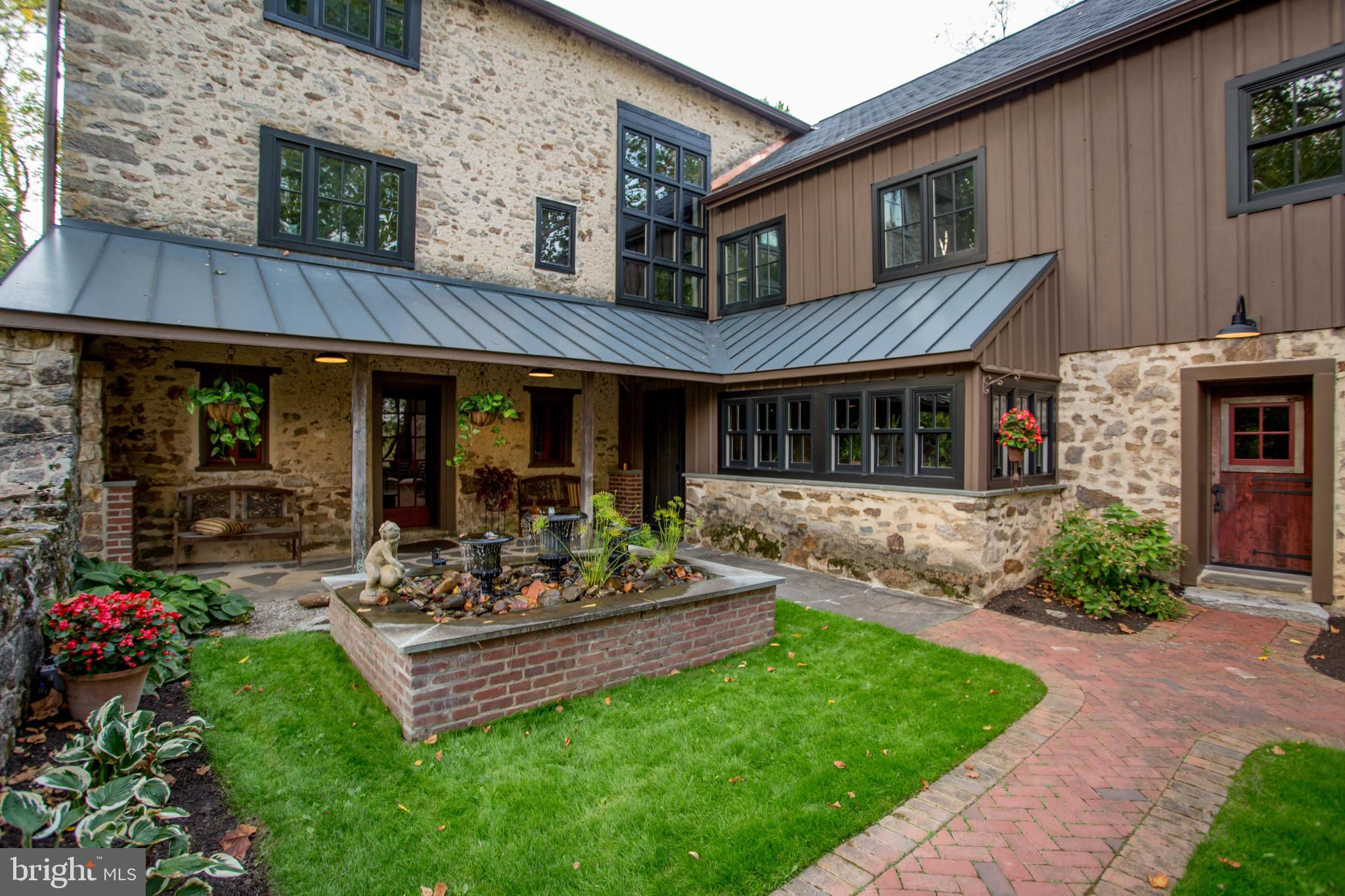 Welcome to the Barn at Ash Mill. A quintessential Bucks County converted stone bank barn circa 1729. This extraordinary property is situated on almost 12 bucolic acres encompassing both sides of one of Buckingham Township’s most desirable roads and conveniently located minutes away from the river town of New Hope, and historic Doylestown Pennsylvania with fine dining, shopping and entertainment. History abounds as it was once the studio of the renowned impressionist painter and designer of stained-glass windows George W. Sotter. He was mostly known for his association with the New Hope Art Colony. The 6,880+/- sq. ft. barn was completely and thoughtfully restored in 2012 including modern amenities while preserving the historic character and charm of an old barn. Featuring geothermal green energy heating and cooling, radiant floor heating, new roof in 2024, Anderson full divided light windows, security system with cameras, and fully integrated Sonos surround sound system. The expert craftsmanship is evident from the reclaimed weathered barnwood siding to the attention to detail and quality of materials throughout. Upon entering the foyer there is a feeling of comfort and spaciousness. A vaulted ceiling, exposed beams, plaster walls and a stone wall entrance that invites you into the massive great room. Here you’ll be amazed by the 17-foot-high ceiling, walls of windows, post and beam structure and one of the four fireplaces located on the property. The chef inspired kitchen is equipped with Wolf, Liebherr and Bosch appliances, custom cabinetry, granite countertop, large barnwood and black walnut island, 2 copper sinks and built-in banquet seating. Also conveniently located on the main level is the laundry room, powder room and the primary bedroom with two large walk-in closets. The ensuite bathroom has a vaulted ceiling, a spacious shower and a clawfoot tub. The upper level consists of two bedrooms with exposed beams, large windows and a hall bath. The lower level invites you to a large entertainment space with a stone fireplace, travertine floors, exposed beams, barnwood accents and a private ensuite bedroom. There is also a utility room, gym, sunroom, library, wine cellar, and half-bath. The two-story pub room has stone and plaster walls, leaded stained-glass windows, stone fireplace, granite counter tops, custom bar wrapped in copper, glass front refrigerator/freezer, microwave/convection oven, galvanized sink and beer tap. An office/painter’s studio with brick floors can be accessed from the main living area or a private entrance. Virtually staged room do not reflect the original hardwood flooring. The rear exterior of the Barn boasts a spectacular entertainment area with multi-level bluestone patios, a pergola covered kitchen with high-end Twin Eagle appliances, a granite countertop and peninsula. Adjacent to the kitchen is a covered post and beam sitting area with a massive stone fireplace and brick walls with boulder outcroppings that blend seamlessly with beautiful views of rock gardens and split-rail fenced pastures beyond. A private enclosed saltwater spa is just steps away. For the auto collector or car enthusiast there is a detached four-car garage with a built- in work bench and storage room. There is also a detached one car garage located on the property. A darling garden potting shed and a 14-tree organic fenced in orchard complete the rear 10+/- acres of the property. As you approach the front of the barn you are welcomed by a stone walled courtyard with brick and bluestone patios and a tranquil water feature. Overlooking an additional 2+/- acres there are views of mature trees, lush greenery and a picturesque woodshed with a moss-covered roof. Experience the ultimate in country living…. Live in a Barn!!