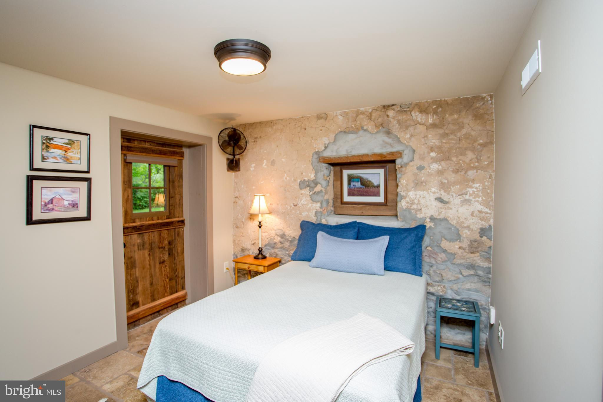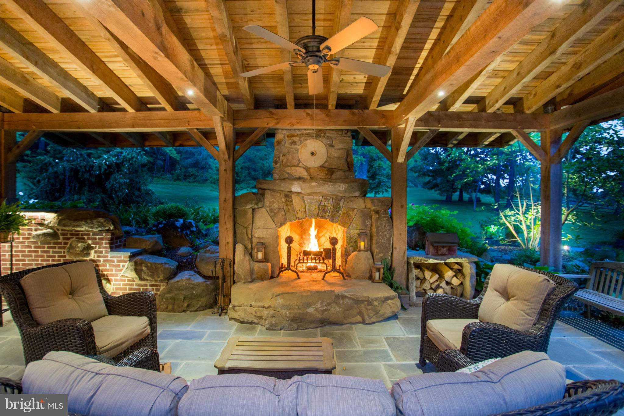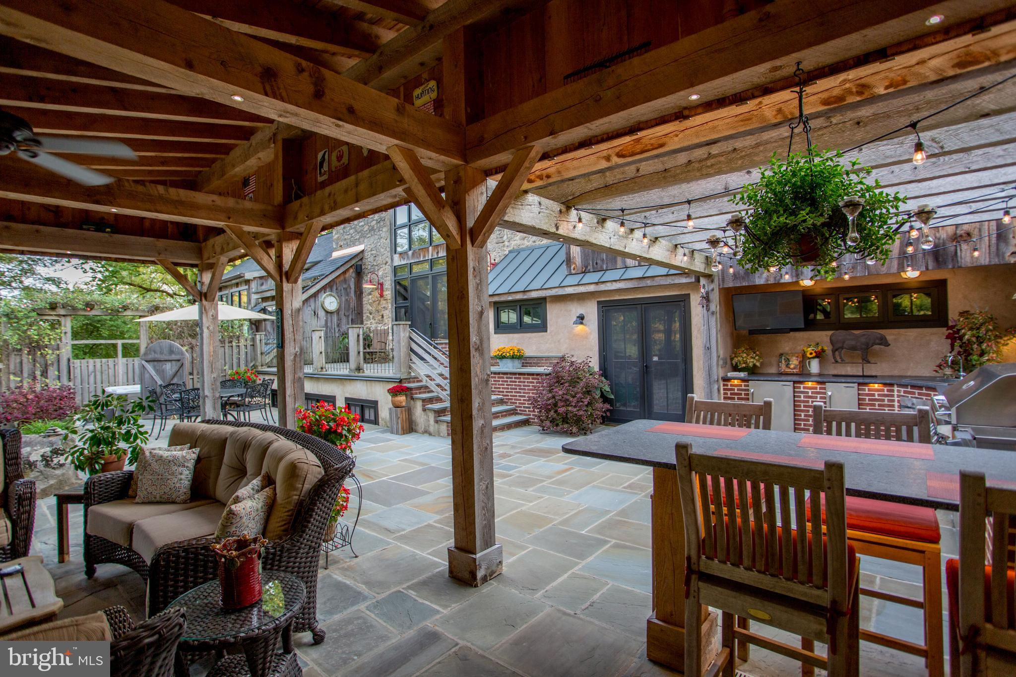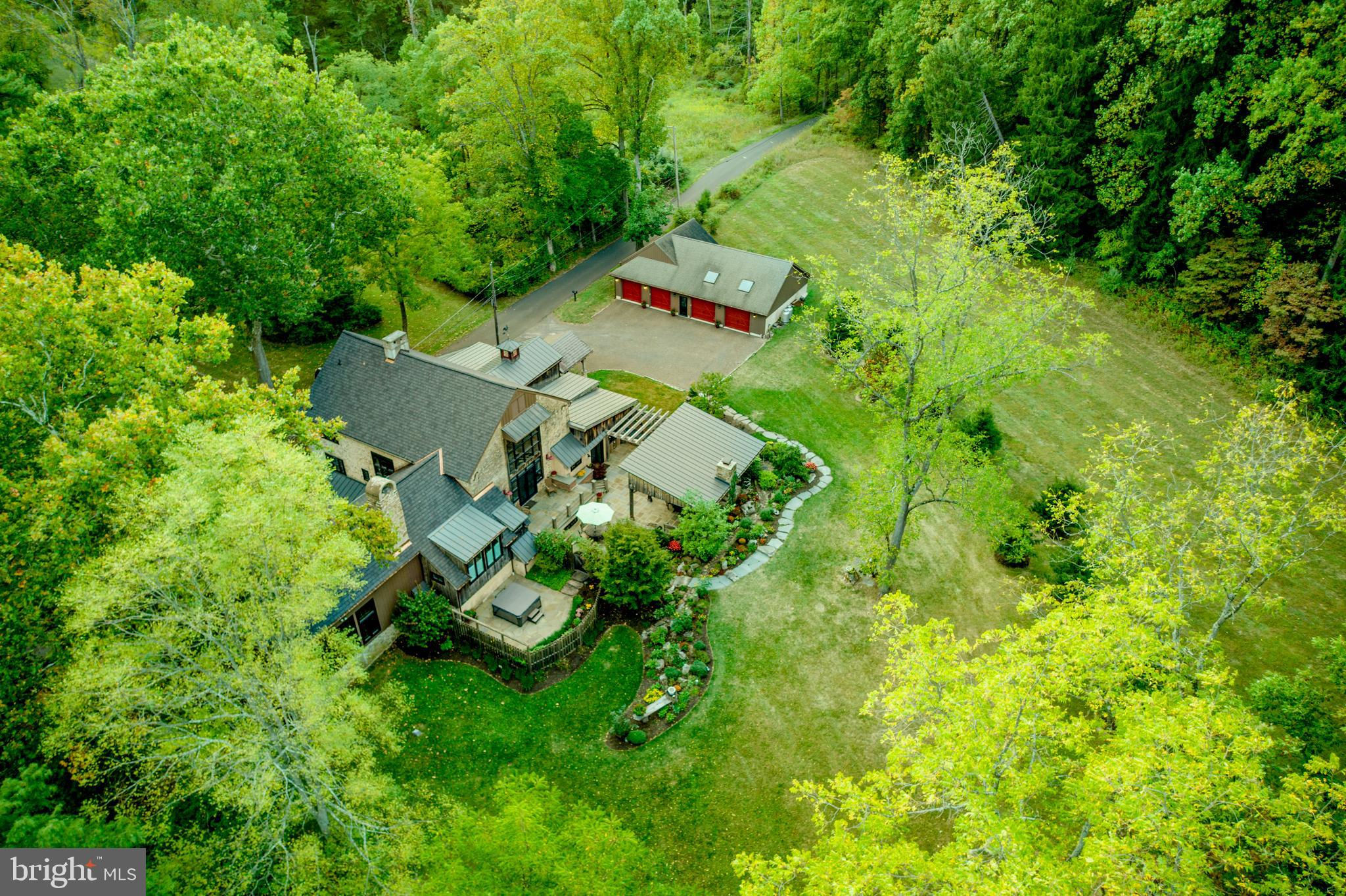 Welcome to the Barn at Ash Mill. A quintessential Bucks County converted stone bank barn circa 1729. This extraordinary property is situated on almost 12 bucolic acres encompassing both sides of one of Buckingham Township’s most desirable roads and conveniently located minutes away from the river town of New Hope, and historic Doylestown Pennsylvania with fine dining, shopping and entertainment. History abounds as it was once the studio of the renowned impressionist painter and designer of stained-glass windows George W. Sotter. He was mostly known for his association with the New Hope Art Colony. The 6,880+/- sq. ft. barn was completely and thoughtfully restored in 2012 including modern amenities while preserving the historic character and charm of an old barn. Featuring geothermal green energy heating and cooling, radiant floor heating, new roof in 2024, Anderson full divided light windows, security system with cameras, and fully integrated Sonos surround sound system. The expert craftsmanship is evident from the reclaimed weathered barnwood siding to the attention to detail and quality of materials throughout. Upon entering the foyer there is a feeling of comfort and spaciousness. A vaulted ceiling, exposed beams, plaster walls and a stone wall entrance that invites you into the massive great room. Here you’ll be amazed by the 17-foot-high ceiling, walls of windows, post and beam structure and one of the four fireplaces located on the property. The chef inspired kitchen is equipped with Wolf, Liebherr and Bosch appliances, custom cabinetry, granite countertop, large barnwood and black walnut island, 2 copper sinks and built-in banquet seating. Also conveniently located on the main level is the laundry room, powder room and the primary bedroom with two large walk-in closets. The ensuite bathroom has a vaulted ceiling, a spacious shower and a clawfoot tub. The upper level consists of two bedrooms with exposed beams, large windows and a hall bath. The lower level invites you to a large entertainment space with a stone fireplace, travertine floors, exposed beams, barnwood accents and a private ensuite bedroom. There is also a utility room, gym, sunroom, library, wine cellar, and half-bath. The two-story pub room has stone and plaster walls, leaded stained-glass windows, stone fireplace, granite counter tops, custom bar wrapped in copper, glass front refrigerator/freezer, microwave/convection oven, galvanized sink and beer tap. An office/painter’s studio with brick floors can be accessed from the main living area or a private entrance. Virtually staged room do not reflect the original hardwood flooring. The rear exterior of the Barn boasts a spectacular entertainment area with multi-level bluestone patios, a pergola covered kitchen with high-end Twin Eagle appliances, a granite countertop and peninsula. Adjacent to the kitchen is a covered post and beam sitting area with a massive stone fireplace and brick walls with boulder outcroppings that blend seamlessly with beautiful views of rock gardens and split-rail fenced pastures beyond. A private enclosed saltwater spa is just steps away. For the auto collector or car enthusiast there is a detached four-car garage with a built- in work bench and storage room. There is also a detached one car garage located on the property. A darling garden potting shed and a 14-tree organic fenced in orchard complete the rear 10+/- acres of the property. As you approach the front of the barn you are welcomed by a stone walled courtyard with brick and bluestone patios and a tranquil water feature. Overlooking an additional 2+/- acres there are views of mature trees, lush greenery and a picturesque woodshed with a moss-covered roof. Experience the ultimate in country living…. Live in a Barn!!