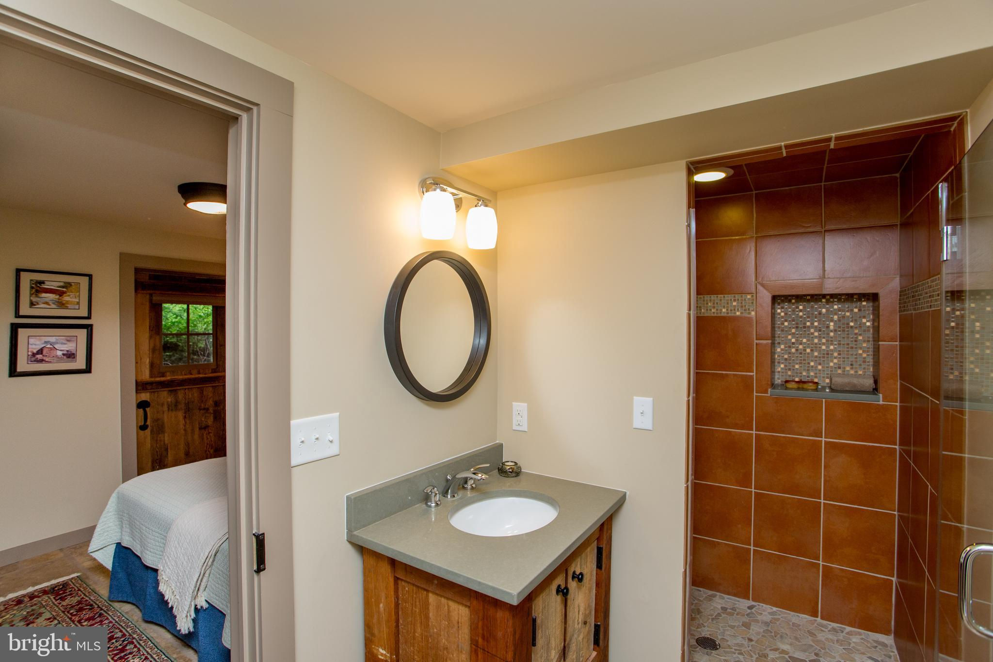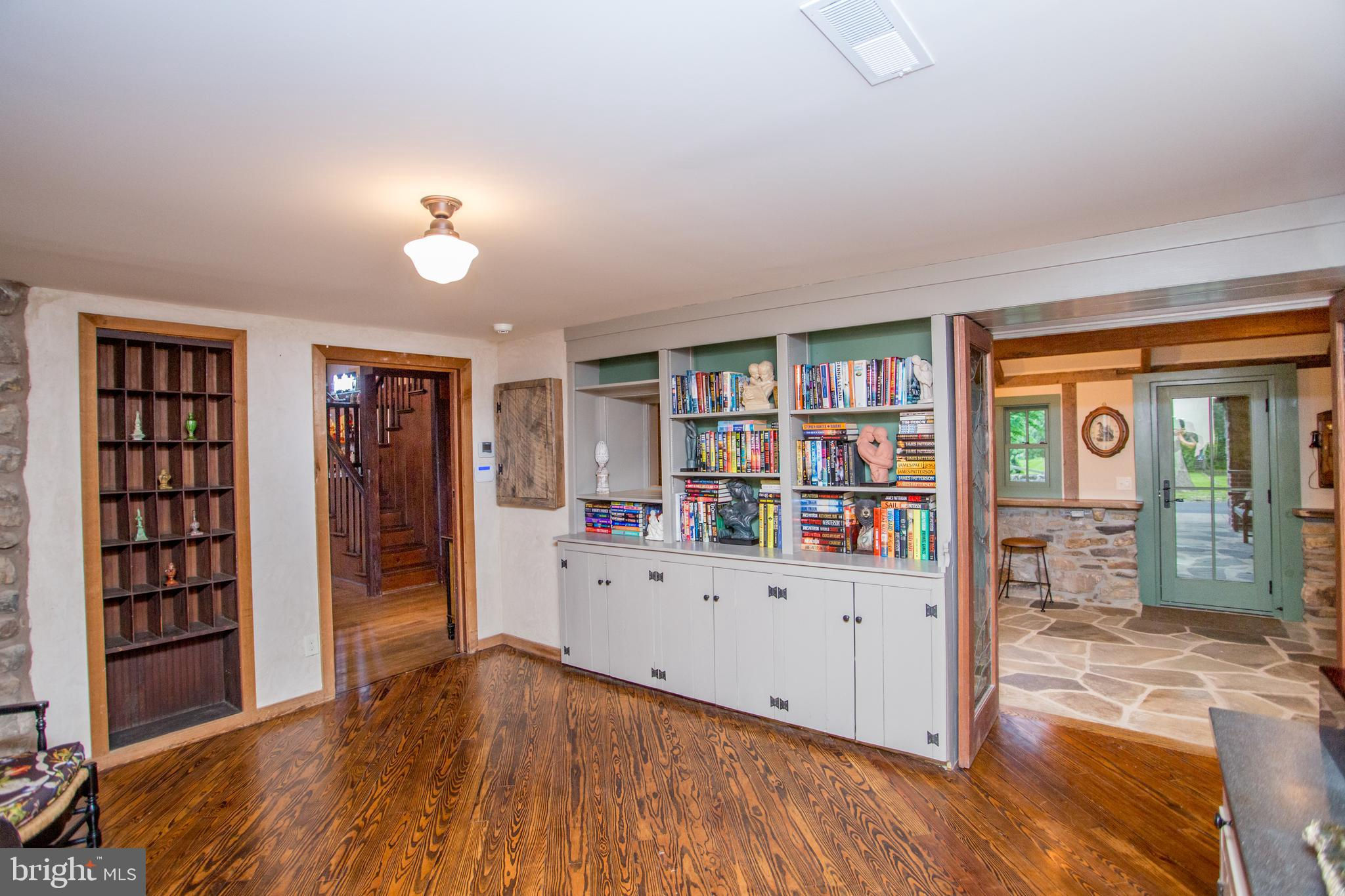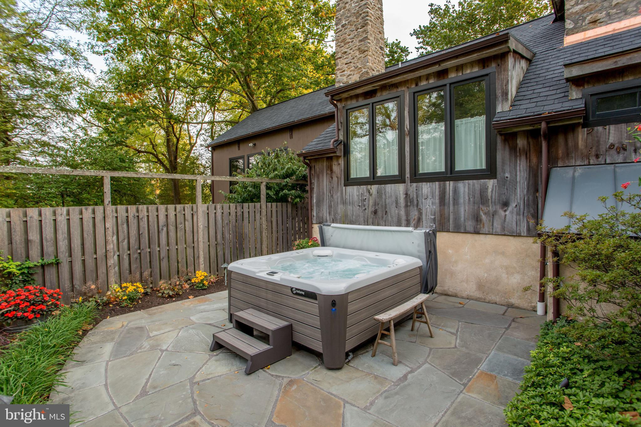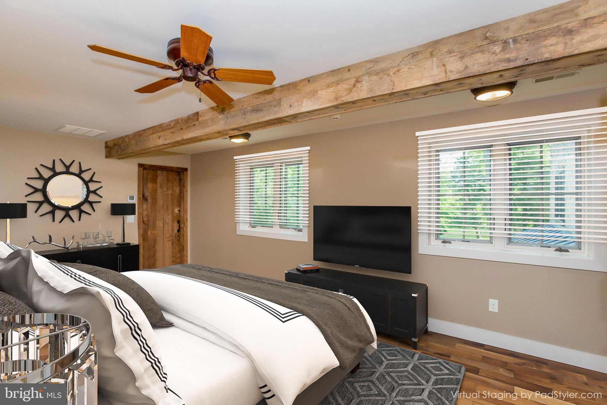 Welcome to the Barn at Ash Mill. A quintessential Bucks County converted stone bank barn circa 1729. This extraordinary property is situated on almost 12 bucolic acres encompassing both sides of one of Buckingham Township’s most desirable roads and conveniently located minutes away from the river town of New Hope, and historic Doylestown Pennsylvania with fine dining, shopping and entertainment. History abounds as it was once the studio of the renowned impressionist painter and designer of stained-glass windows George W. Sotter. He was mostly known for his association with the New Hope Art Colony. The 6,880+/- sq. ft. barn was completely and thoughtfully restored in 2012 including modern amenities while preserving the historic character and charm of an old barn. Featuring geothermal green energy heating and cooling, radiant floor heating, new roof in 2024, Anderson full divided light windows, security system with cameras, and fully integrated Sonos surround sound system. The expert craftsmanship is evident from the reclaimed weathered barnwood siding to the attention to detail and quality of materials throughout. Upon entering the foyer there is a feeling of comfort and spaciousness. A vaulted ceiling, exposed beams, plaster walls and a stone wall entrance that invites you into the massive great room. Here you’ll be amazed by the 17-foot-high ceiling, walls of windows, post and beam structure and one of the four fireplaces located on the property. The chef inspired kitchen is equipped with Wolf, Liebherr and Bosch appliances, custom cabinetry, granite countertop, large barnwood and black walnut island, 2 copper sinks and built-in banquet seating. Also conveniently located on the main level is the laundry room, powder room and the primary bedroom with two large walk-in closets. The ensuite bathroom has a vaulted ceiling, a spacious shower and a clawfoot tub. The upper level consists of two bedrooms with exposed beams, large windows and a hall bath. The lower level invites you to a large entertainment space with a stone fireplace, travertine floors, exposed beams, barnwood accents and a private ensuite bedroom. There is also a utility room, gym, sunroom, library, wine cellar, and half-bath. The two-story pub room has stone and plaster walls, leaded stained-glass windows, stone fireplace, granite counter tops, custom bar wrapped in copper, glass front refrigerator/freezer, microwave/convection oven, galvanized sink and beer tap. An office/painter’s studio with brick floors can be accessed from the main living area or a private entrance. Virtually staged room do not reflect the original hardwood flooring. The rear exterior of the Barn boasts a spectacular entertainment area with multi-level bluestone patios, a pergola covered kitchen with high-end Twin Eagle appliances, a granite countertop and peninsula. Adjacent to the kitchen is a covered post and beam sitting area with a massive stone fireplace and brick walls with boulder outcroppings that blend seamlessly with beautiful views of rock gardens and split-rail fenced pastures beyond. A private enclosed saltwater spa is just steps away. For the auto collector or car enthusiast there is a detached four-car garage with a built- in work bench and storage room. There is also a detached one car garage located on the property. A darling garden potting shed and a 14-tree organic fenced in orchard complete the rear 10+/- acres of the property. As you approach the front of the barn you are welcomed by a stone walled courtyard with brick and bluestone patios and a tranquil water feature. Overlooking an additional 2+/- acres there are views of mature trees, lush greenery and a picturesque woodshed with a moss-covered roof. Experience the ultimate in country living…. Live in a Barn!!