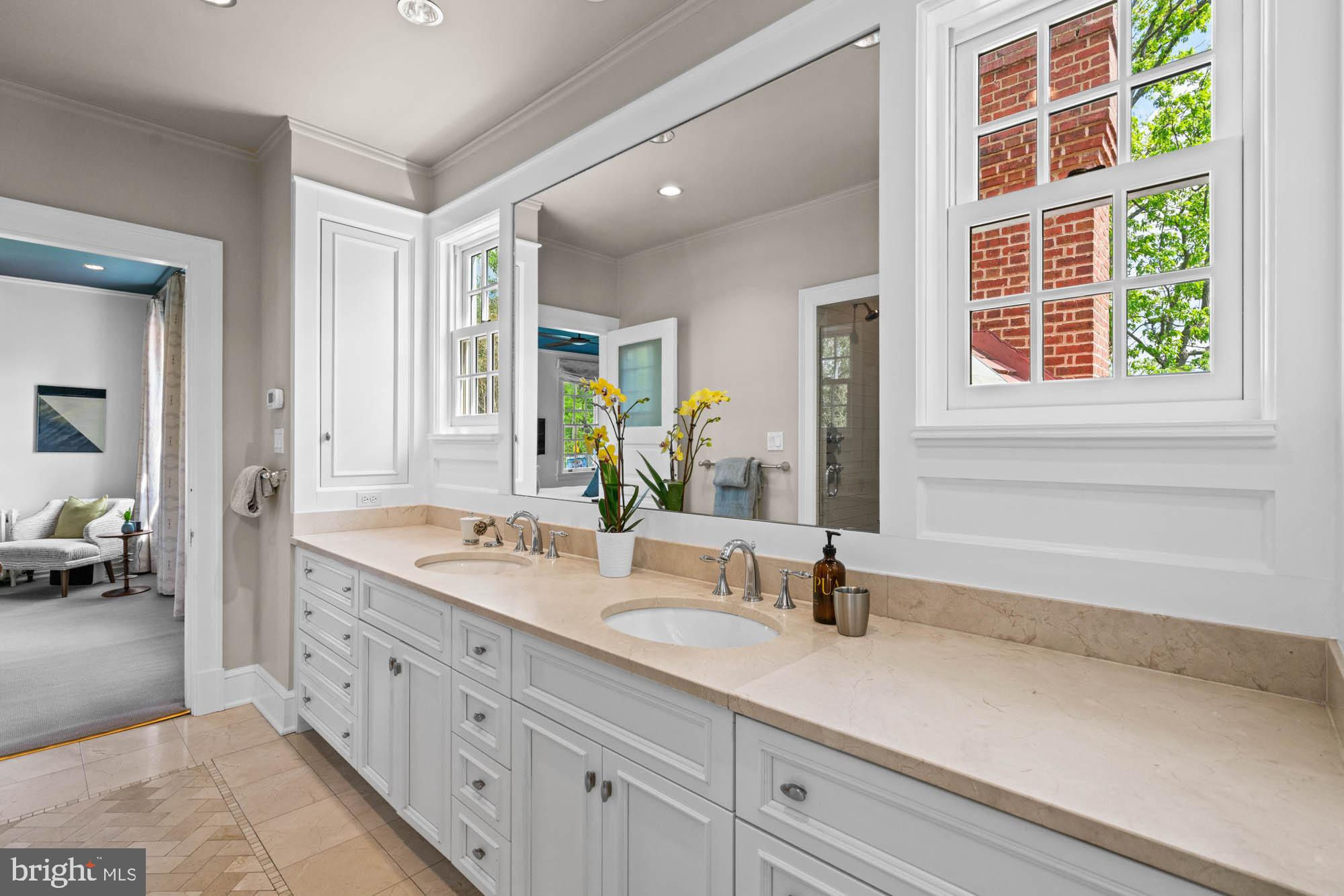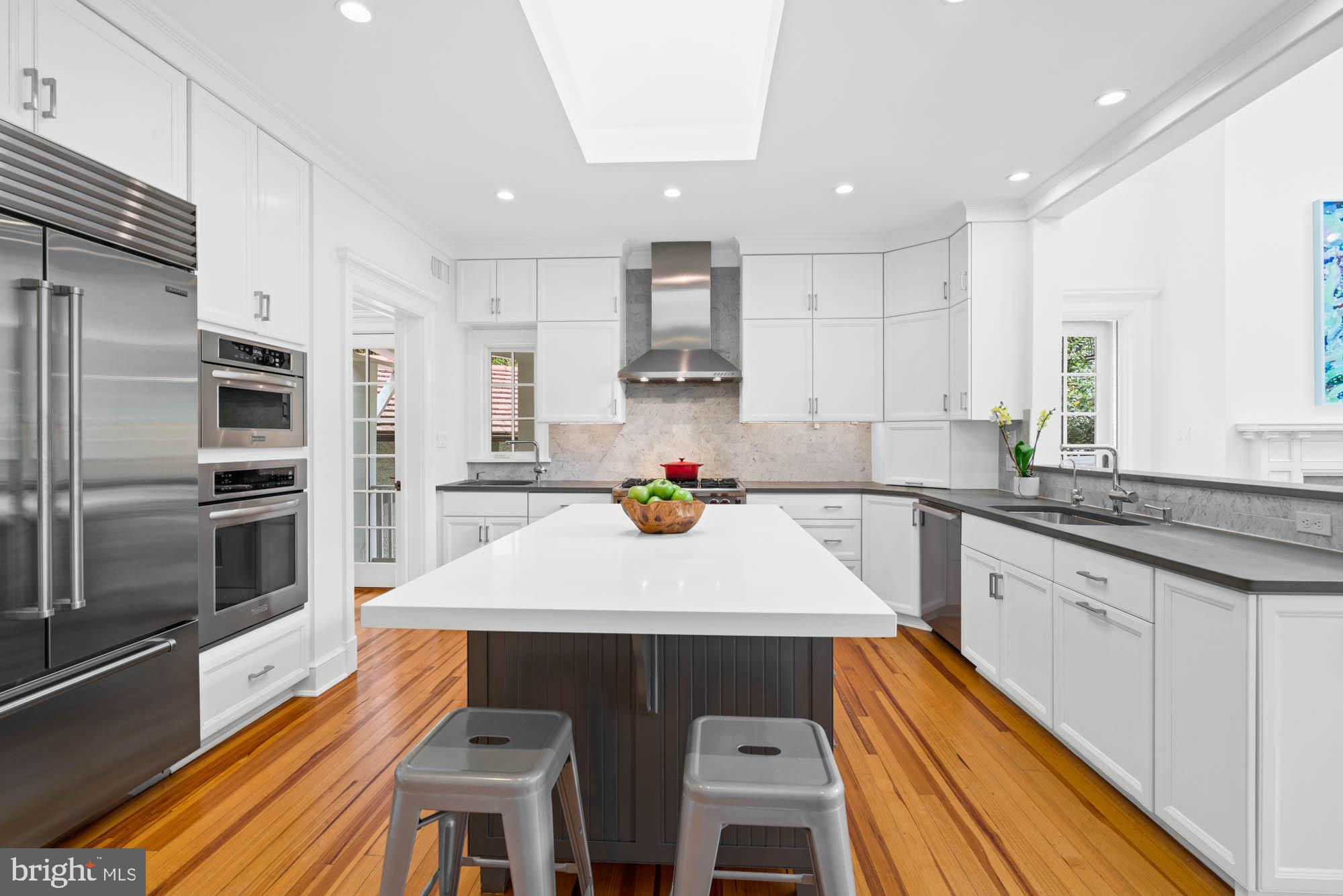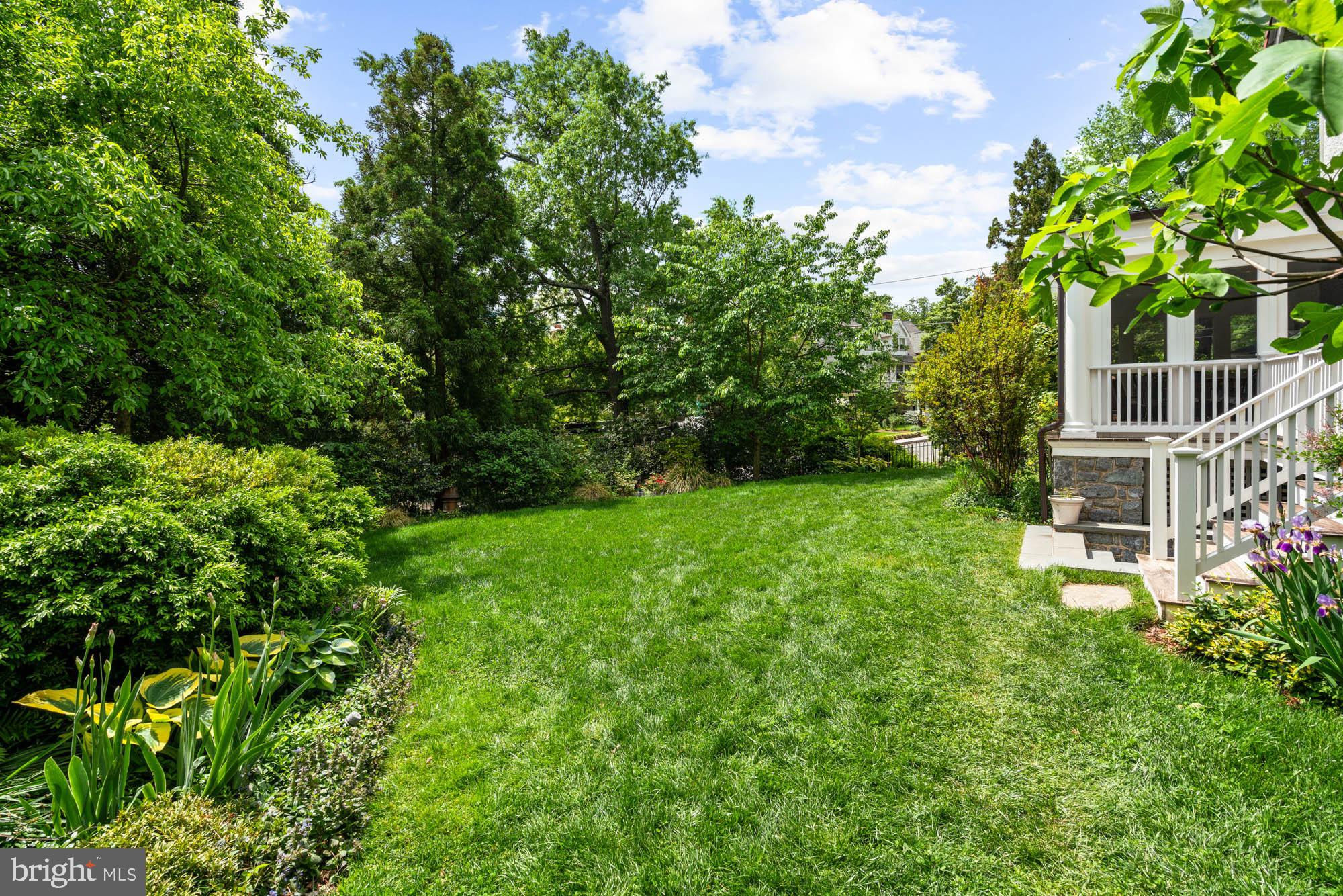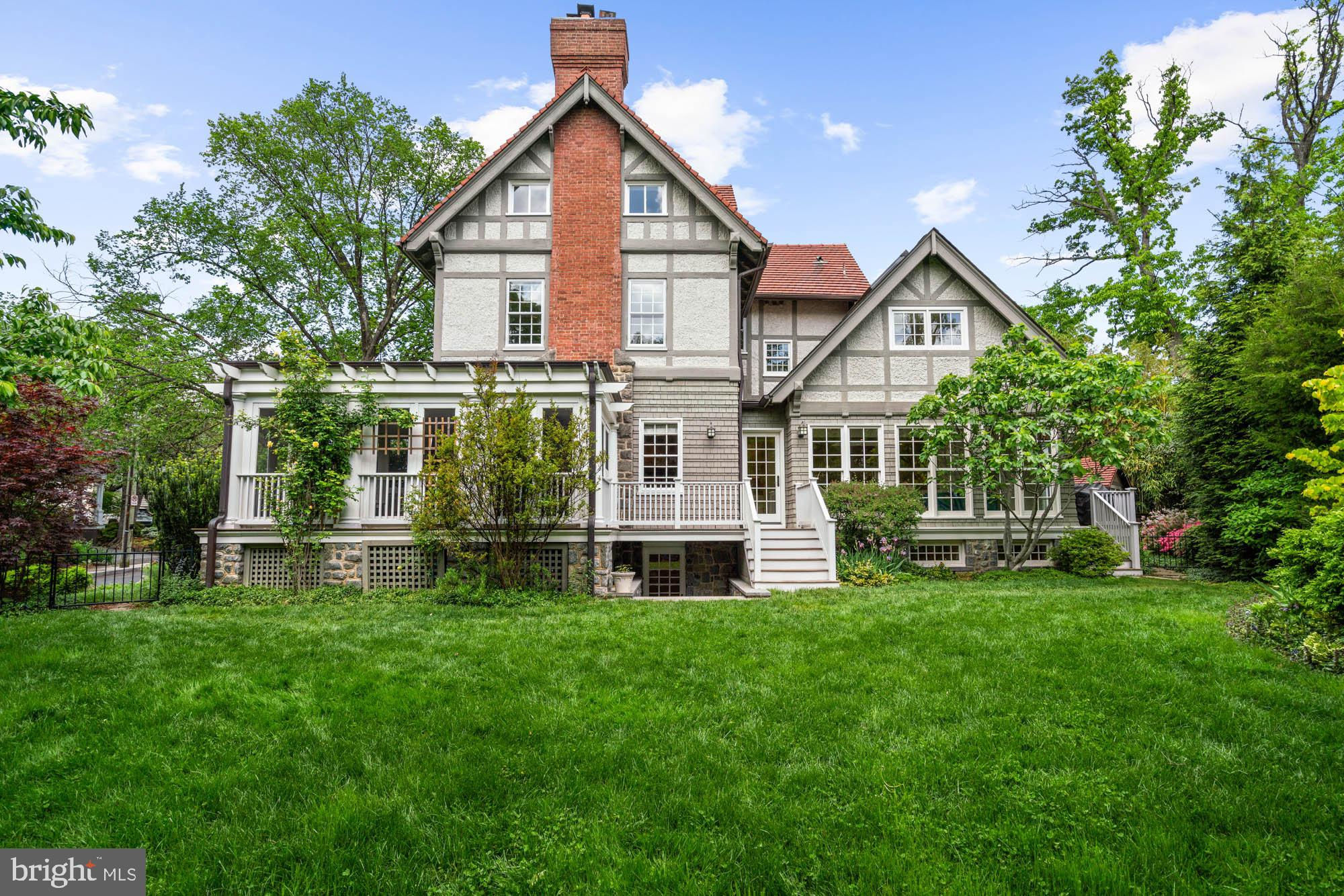 This elegant 1905 residence is ideally sited on a prominent corner lot in the highly coveted Cleveland Park neighborhood. Meticulously updated and expanded across four spacious levels, the home blends timeless architectural character with refined modern living. A gracious and inviting foyer, accented by elegant wall paneling and crown molding, introduces the sophisticated main level. Original hardwood floors and sliding pocket doors provide historic detail, while the living room showcases a beautifully crafted fireplace, intricate ceiling trim, custom built-ins, and doors leading to a charming screen porch offering lovely garden views. Expansive windows throughout fill the interiors with abundant natural light, enhancing the sense of warmth and space. The chef’s kitchen is well-appointed with a large center island, Sub-Zero refrigerator and freezer, double sinks and wall ovens, and ample custom cabinetry. The kitchen opens to the family and breakfast room, which features a soaring cathedral ceiling, fireplace, oversized windows, and French doors to the exterior gardens. The formal dining room exudes sophistication with another fireplace, elaborate millwork, and crown moldings. An adjoining study or music room transitions to a main-level recreation room with a wall of windows overlooking the mature gardens. There is also the added convenience of a mud room with ample storage and large coat closet on this floor. Upstairs, the large primary suite offers a peaceful retreat with a generous custom walk-in closet, extensive built-ins, and a spa-inspired bath with dual vanities and a frameless glass shower. This level also includes a spacious bedroom with a fireplace, a full hall bathroom, an office, and a laundry room. The third level features three additional well-appointed bedrooms with ample closet space, built-in shelving, and a large hall bathroom. There is an additional office on this floor as well. The expansive lower level includes a large recreation room, a sixth bedroom with full bathroom, dedicated storage rooms, cubbies / mudroom shelving, and French doors opening to the verdant yard. Surrounding the home are lush professionally landscaped gardens, a stone path encircling the residence, a spacious deck off the kitchen ideal for outdoor entertaining, and a granite stone driveway leading to a detached garage. This exceptional property is ideally located within walking distance to sought after schools, including Hearst Elementary, Sidwell Friends, Beauvoir, St. Albans, and National Cathedral School. It also offers easy access to the Metro, Cathedral Commons, neighborhood shops and dining, and the newly renovated Hearst Park, which features a pool, tennis courts, sports fields, and a playground. Seamlessly combining location, historic character, and luxury, this is a rare offering in one of Washington’s most desirable communities.