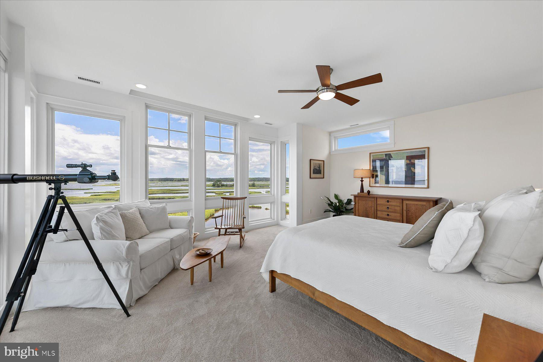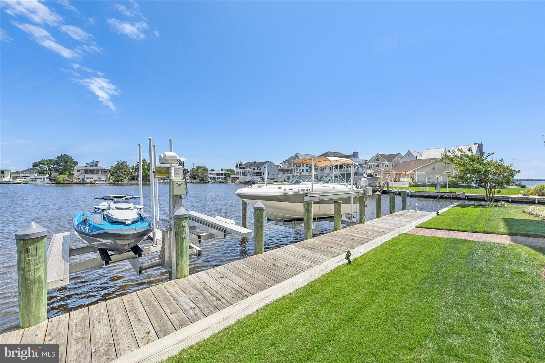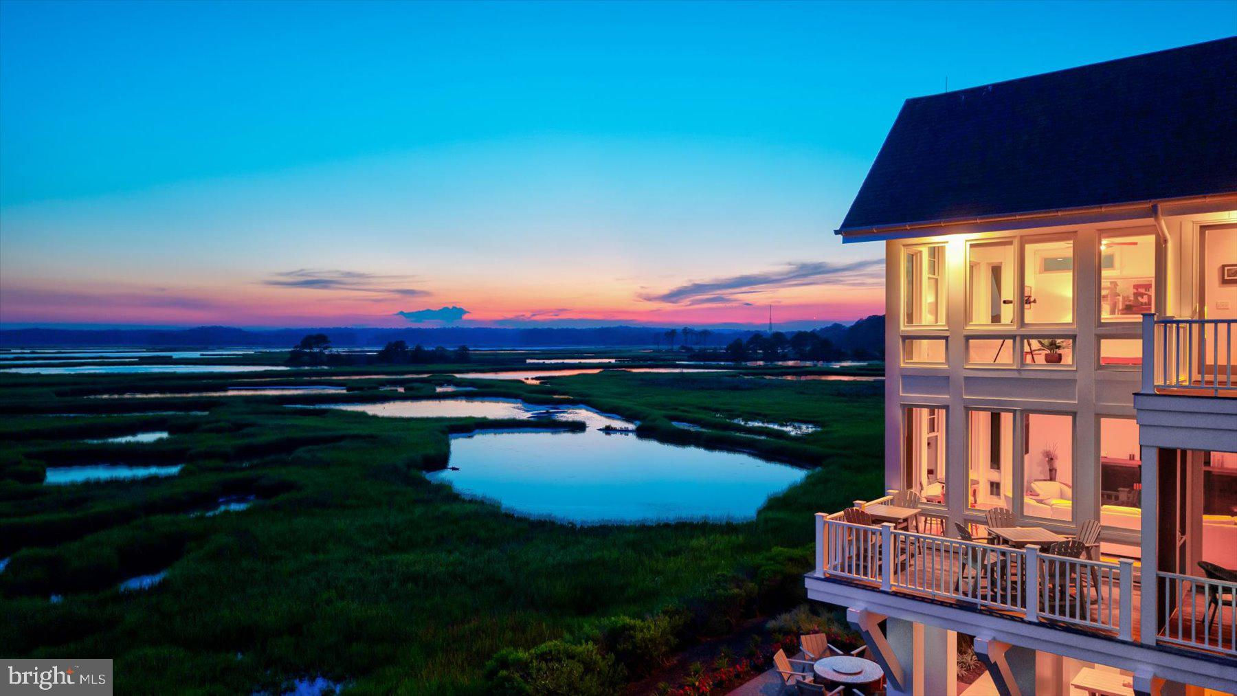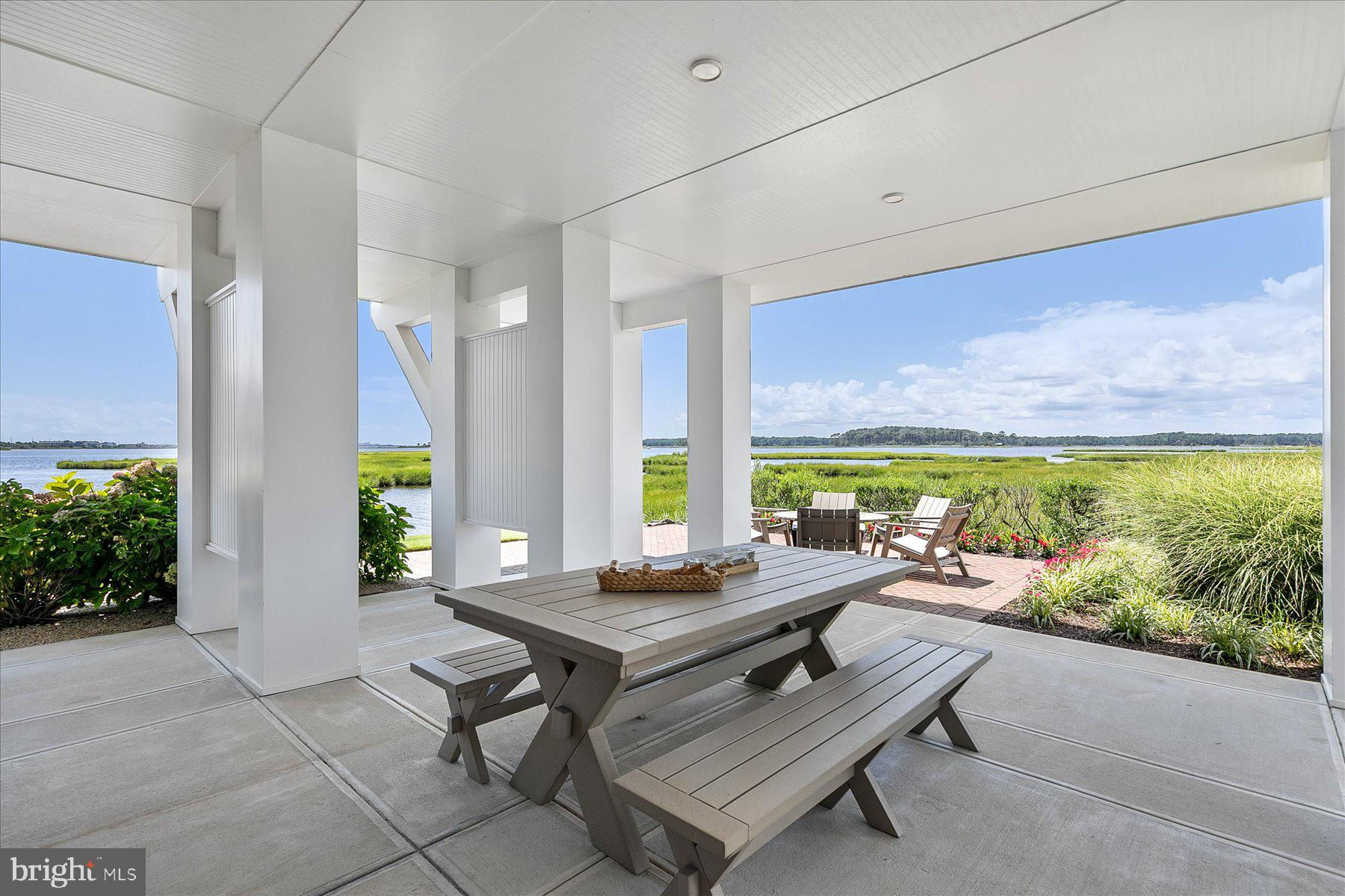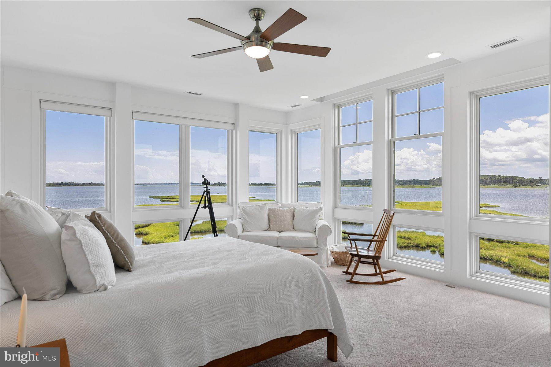 Take in unparalleled panoramic bay views from every room of this sophisticated modern beach home, ideally located on one of the most sought-after bayfront properties with water on three sides of the home. Complete with a private 50-foot dock, boat lift, and double jet ski lift, this exceptional residence was impressively designed, featuring high-end finishes and craftsmanship throughout. The expansive great room, with floor-to-ceiling windows on two sides, effortlessly frames sweeping views of the water and seamlessly blends the living, dining, and gourmet kitchen spaces. A large work island, bar with seating, and premium appliances elevate this culinary and entertaining space with easy access to a screened porch and open deck with views that are unable to be duplicated. The main level also offers a cozy family room, two guest bedrooms, and a full bathroom, along with a convenient powder room for guests. Upstairs, the bayfront primary suite is a tranquil retreat with its own private waterfront deck. Three generously-sized guest rooms each feature en-suite bathrooms, ensuring ample space and privacy for visitors. On the ground level, a spacious workshop and covered patio provide the perfect setting for crab feasts and relaxation, while the brick paver patio offers an ideal spot for evening bonfires by the water. The outdoor shower with a changing area makes clean-ups after a day on the beach or boat a breeze, and a two-car garage plus second one-car garage provide ample storage and convenience for all your vehicles, beach gear, kayaks, canoes, boating accessories, and bikes. Additional highlights include an elevator shaft for future conversion, geothermal hvac, and a location that’s impossible to duplicate—situated on a peninsula with sweeping views of the bay and wetlands, yet just moments from the beach. Homes of this caliber, in such a prime location, are a rare offering.