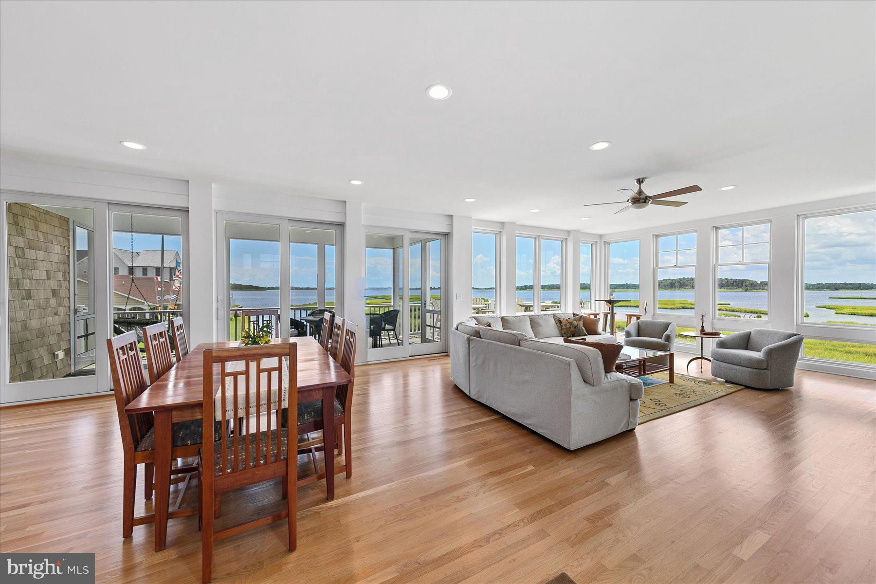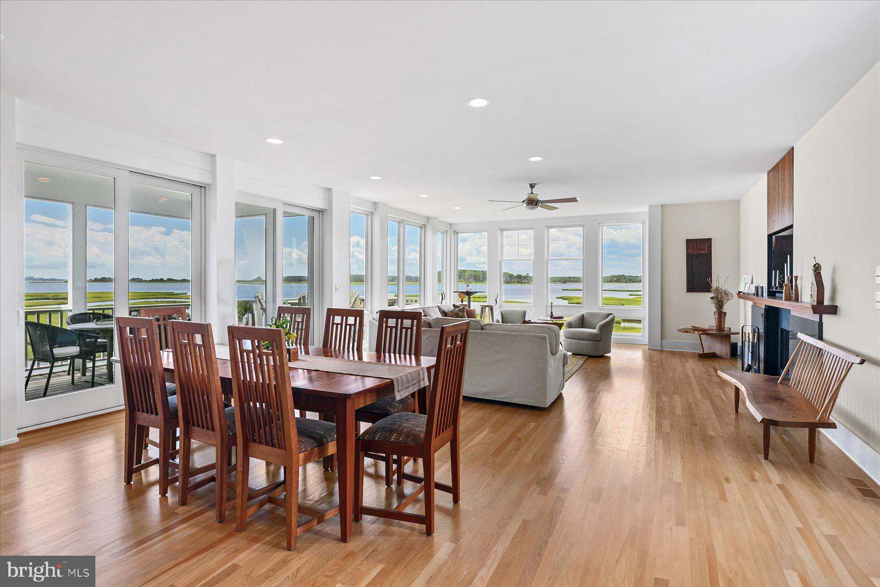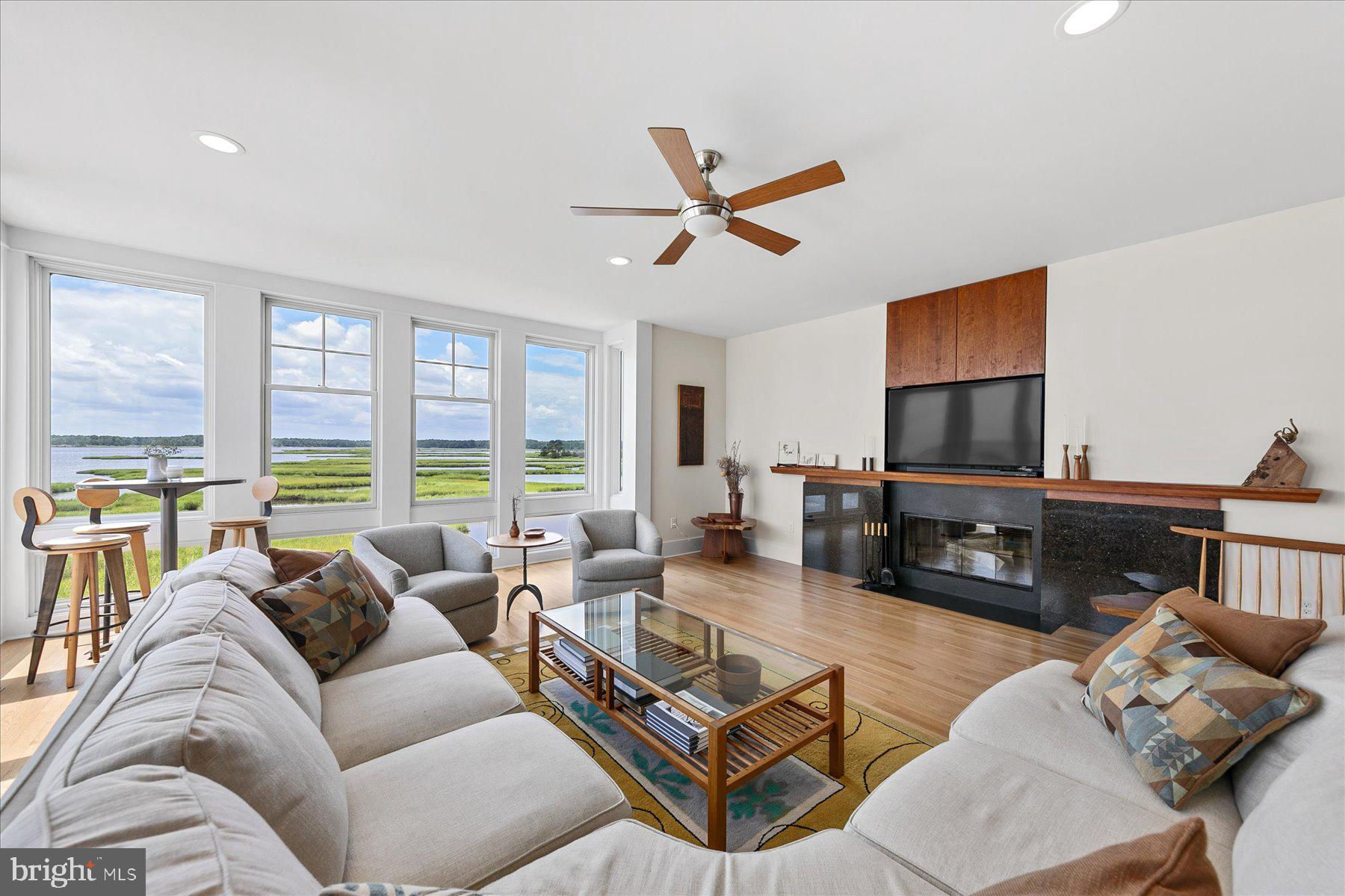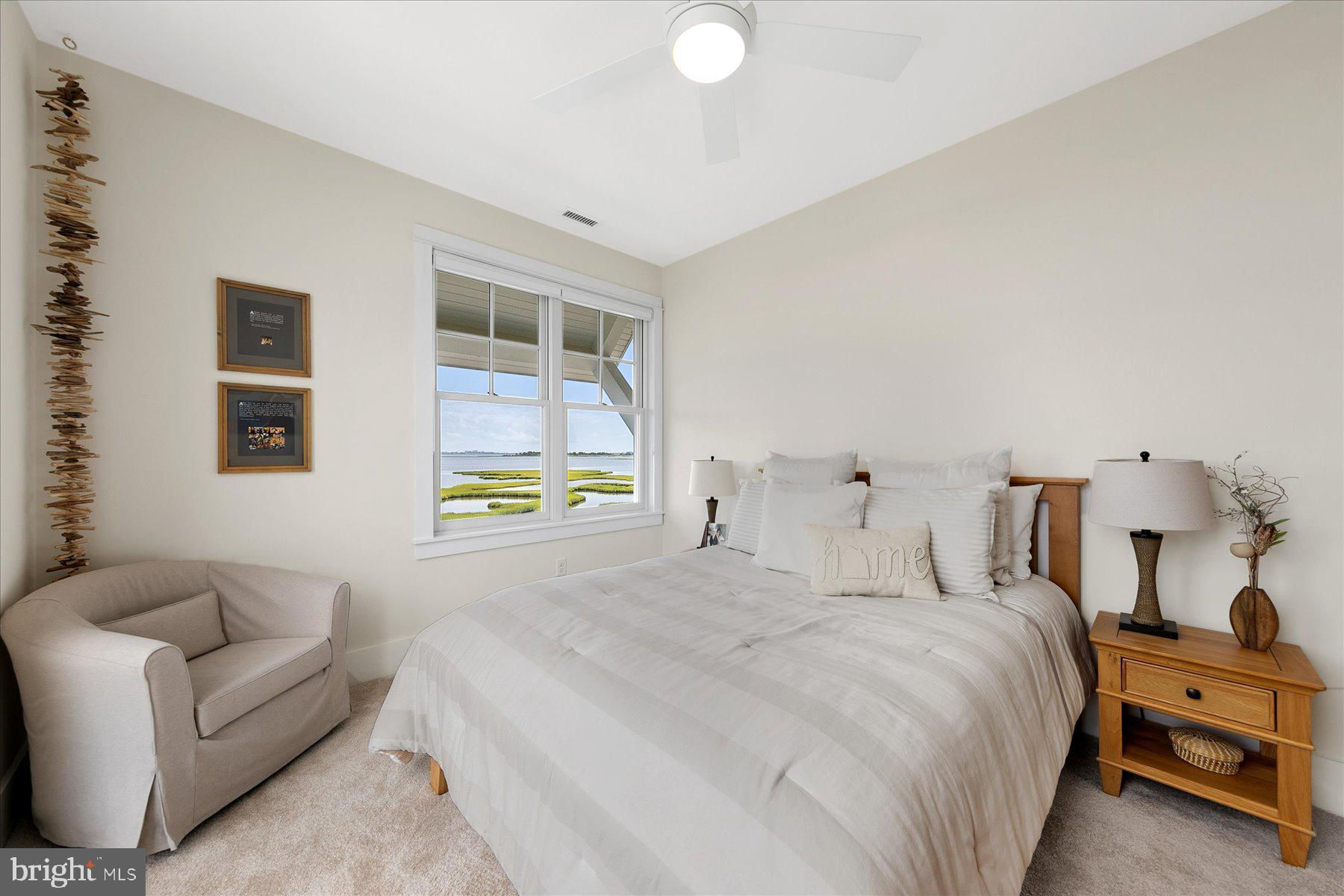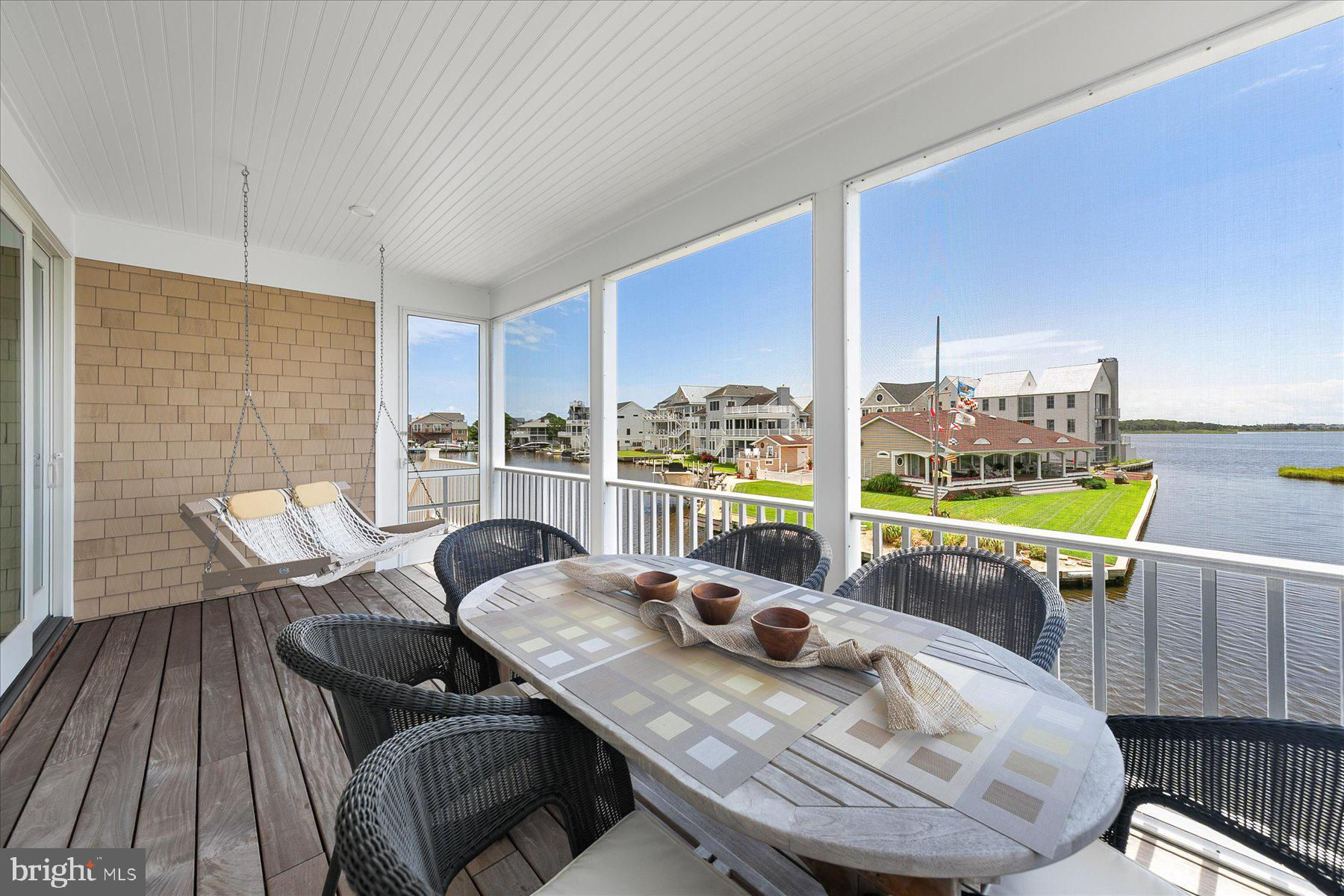 Take in unparalleled panoramic bay views from every room of this sophisticated modern beach home, ideally located on one of the most sought-after bayfront properties with water on three sides of the home. Complete with a private 50-foot dock, boat lift, and double jet ski lift, this exceptional residence was impressively designed, featuring high-end finishes and craftsmanship throughout. The expansive great room, with floor-to-ceiling windows on two sides, effortlessly frames sweeping views of the water and seamlessly blends the living, dining, and gourmet kitchen spaces. A large work island, bar with seating, and premium appliances elevate this culinary and entertaining space with easy access to a screened porch and open deck with views that are unable to be duplicated. The main level also offers a cozy family room, two guest bedrooms, and a full bathroom, along with a convenient powder room for guests. Upstairs, the bayfront primary suite is a tranquil retreat with its own private waterfront deck. Three generously-sized guest rooms each feature en-suite bathrooms, ensuring ample space and privacy for visitors. On the ground level, a spacious workshop and covered patio provide the perfect setting for crab feasts and relaxation, while the brick paver patio offers an ideal spot for evening bonfires by the water. The outdoor shower with a changing area makes clean-ups after a day on the beach or boat a breeze, and a two-car garage plus second one-car garage provide ample storage and convenience for all your vehicles, beach gear, kayaks, canoes, boating accessories, and bikes. Additional highlights include an elevator shaft for future conversion, geothermal hvac, and a location that’s impossible to duplicate—situated on a peninsula with sweeping views of the bay and wetlands, yet just moments from the beach. Homes of this caliber, in such a prime location, are a rare offering.