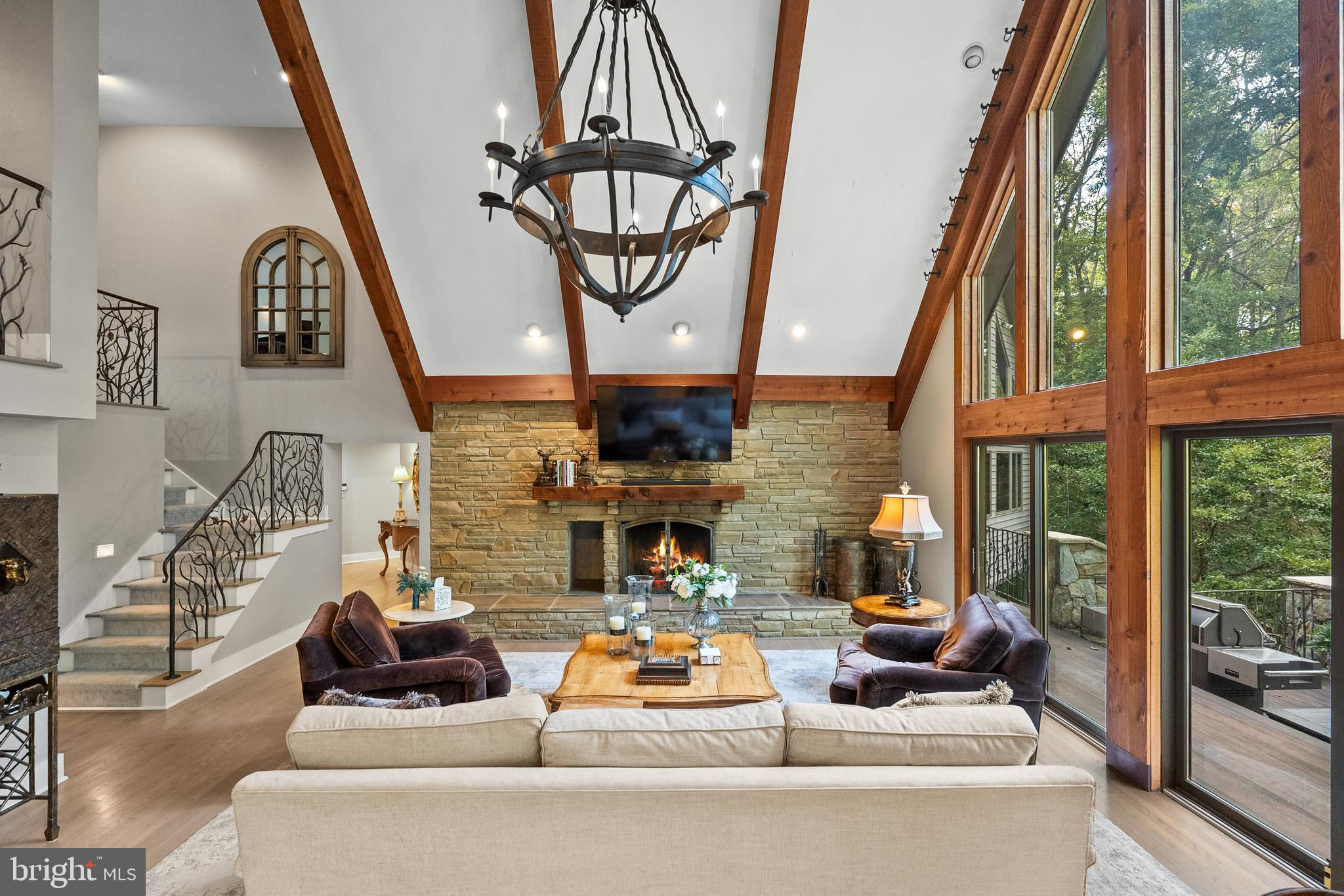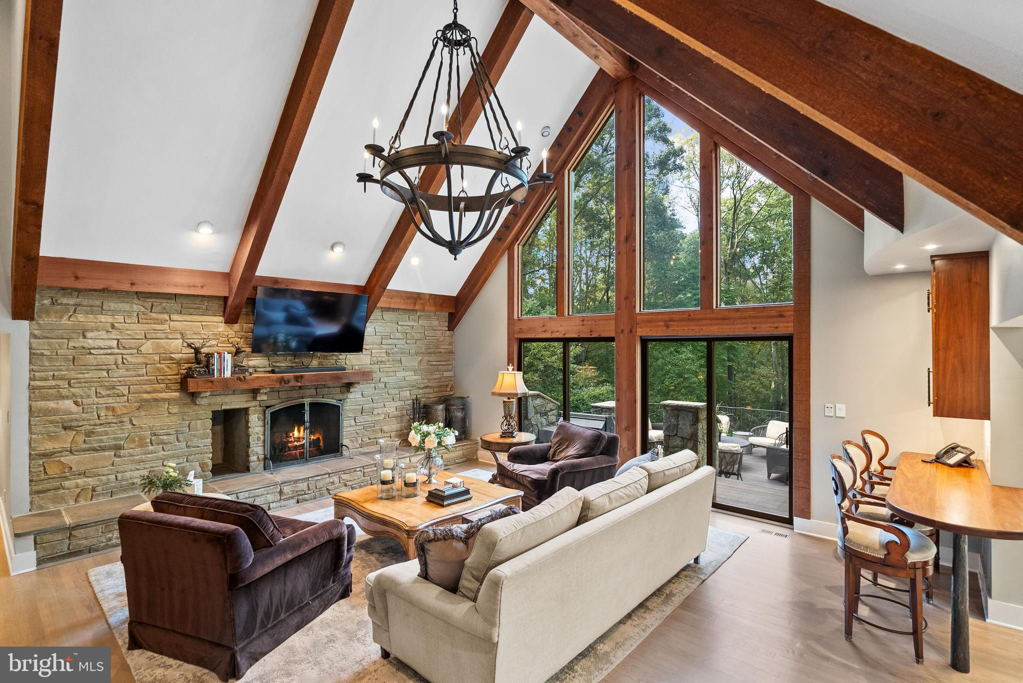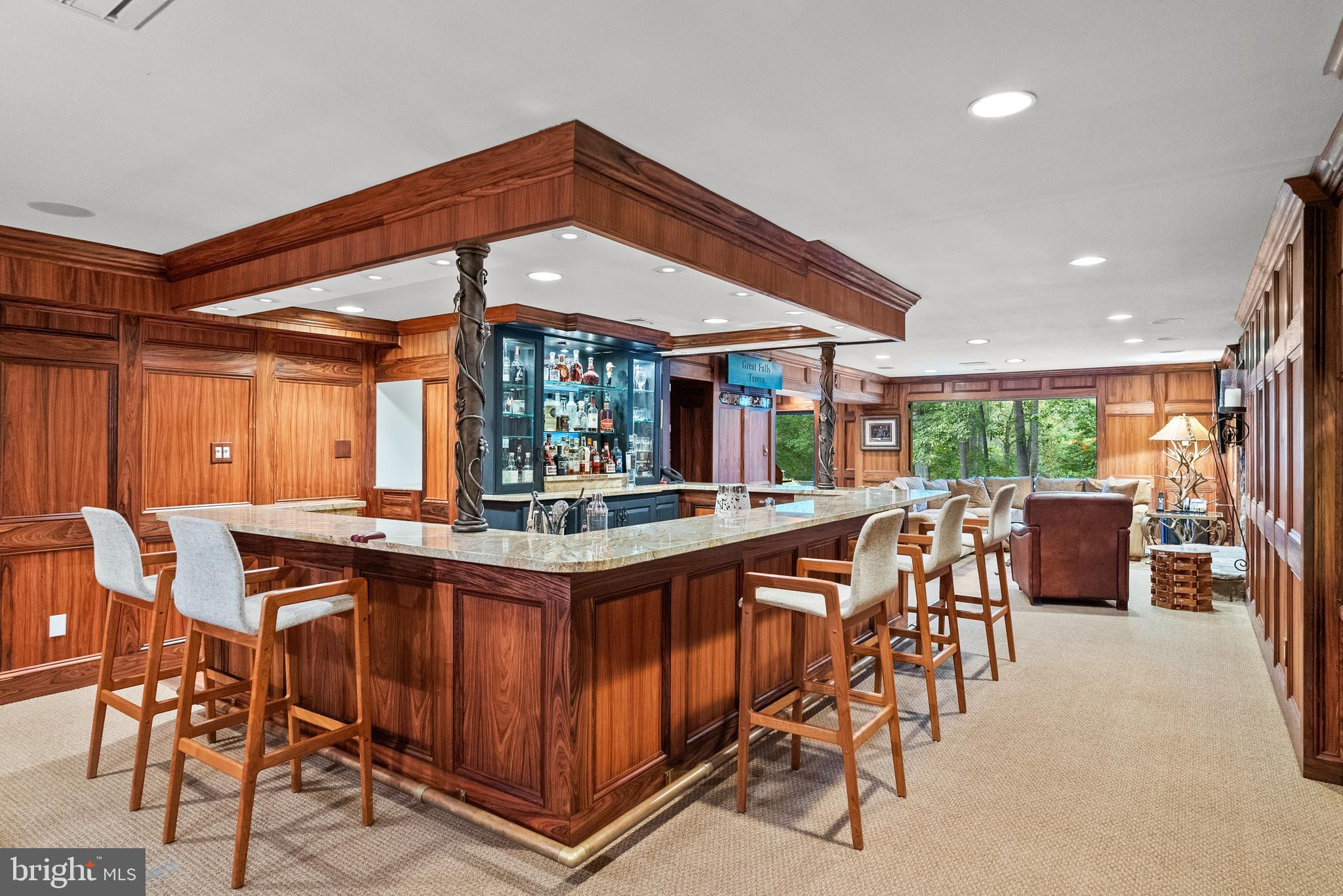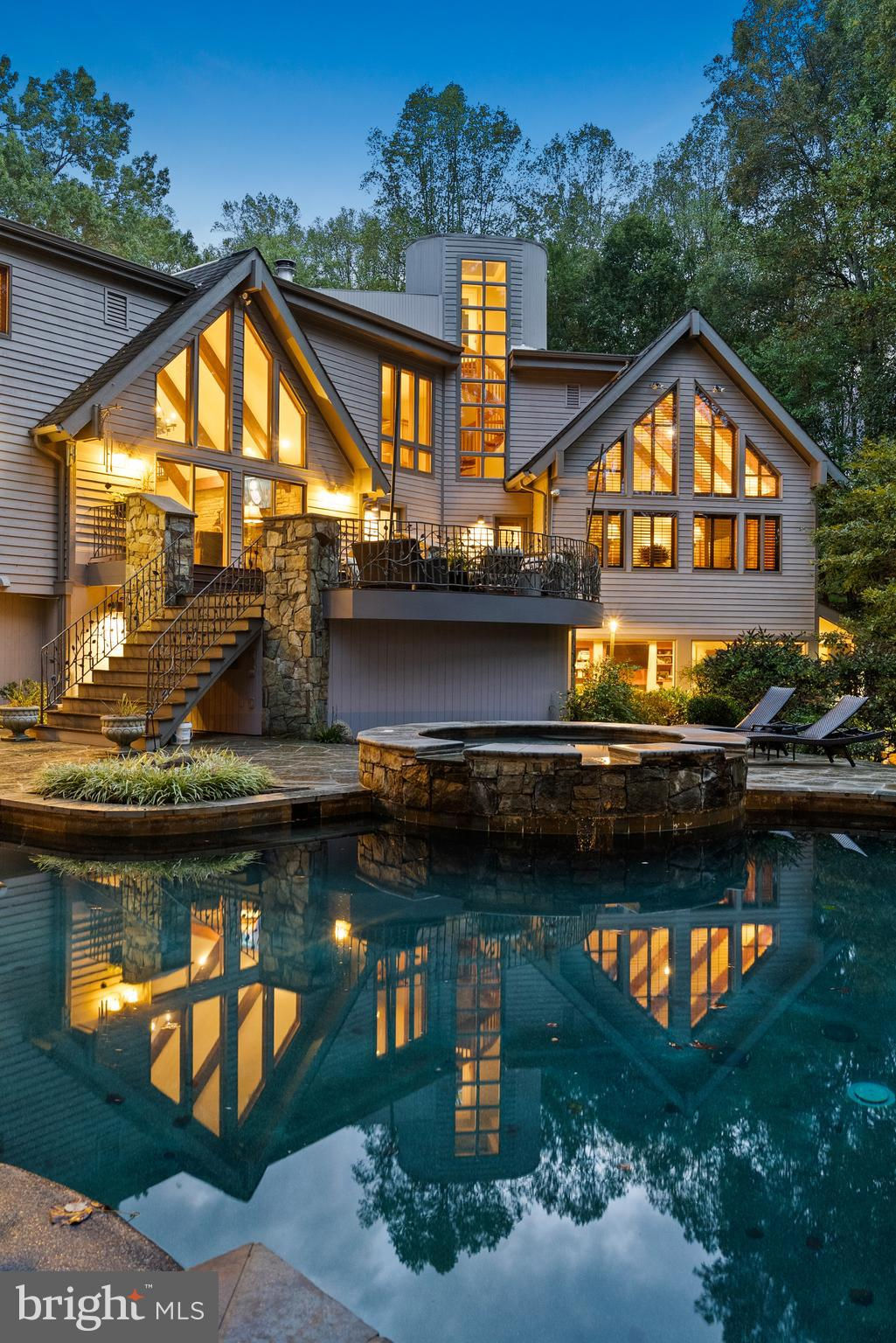 Welcome to the best of Aspen in Great Falls! Enter through the gates to a spectacular setting sited on 6 verdant acres and drive down the circular driveway to find a private resort with stack stone hardscape, lawn art and mature landscaping. Light-filled Grand Foyer. Hand-forged Cardine Studios custom iron railings, exposed wood beams and stone fireplaces throughout. Gourmet Kitchen with Thermador/SubZero appliances, spacious island, big picture window with scenic, wooded vistas and a balcony that overlooks a fabulous pool and pond. An adjacent morning room with stone terrace doubles as entertaining or study space. Expansive A-Frame family room with beams, fireplace, and multi-level deck access. Main level includes second Owner’s suite with luxe bath, Au-Pair/In-Law, luxurious laundry with stone accents, grand great room with fireplace and soaring ceilings. Upper level Owner’s suite features balcony, custom beverage center, two extra large walk-in closets and spa-like primary bath with heated floors, soaking tub and steam shower. Spiral staircase leads to rooftop sundeck with 360-degree views. Three additional Bedrooms with updated baths. Lower level offers multi-person office with conference area, wine tasting room, ventilated Cigar room, full Bath, IT room and workshop. Club level entertainment space with paneled Bolivian Rosewood includes game areas, professional bar, billiards, and Caterer’s kitchen. Gym with “environmental bed” with steam, sauna and sun lamp. Oversized heated 5-car garage with lift. Resort-like grounds feature infinity pool/spa, multi-level decks, slate patios, pickleball/sport court with basketball hoops and wooded seclusion.