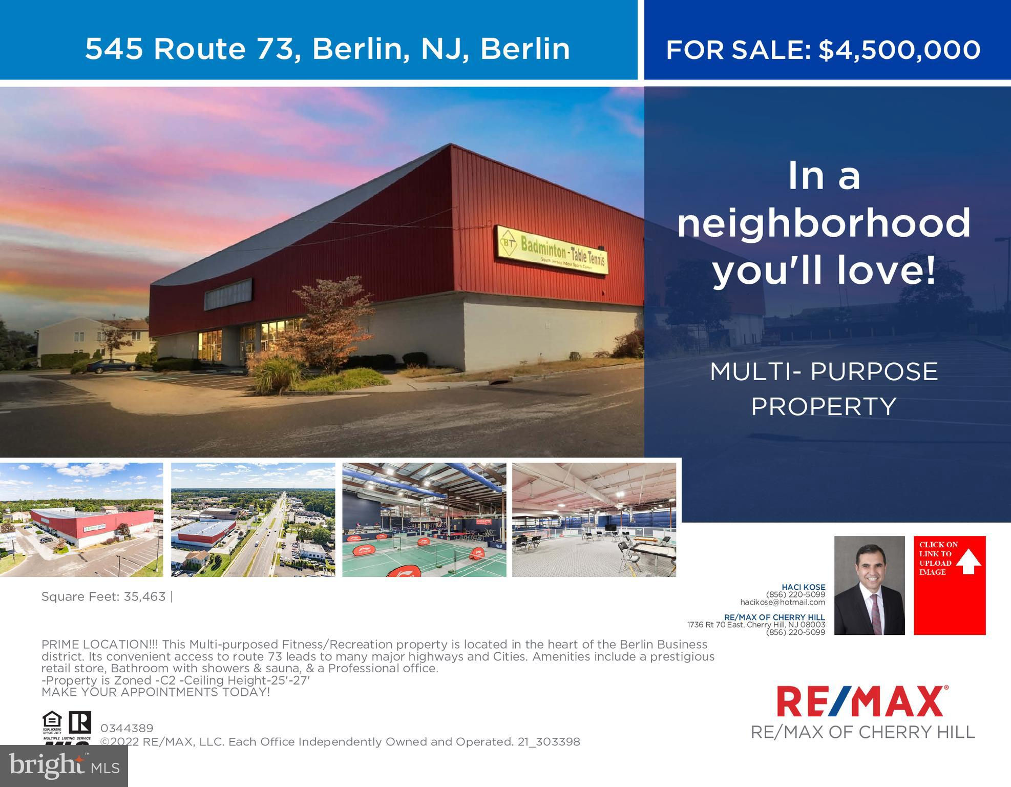 PRIME LOCATION!!! This Multi-purposed Fitness/Recreation property is located in the heart of the Berlin Business district. Its convenient access to route 73 leads to many major highways and Cities. MAKE YOUR APPOINTMENTS TODAY!
