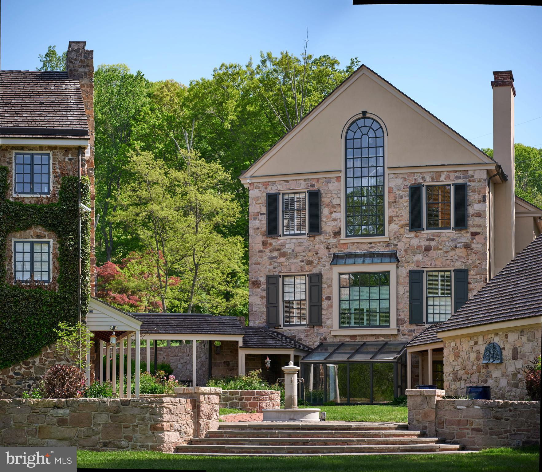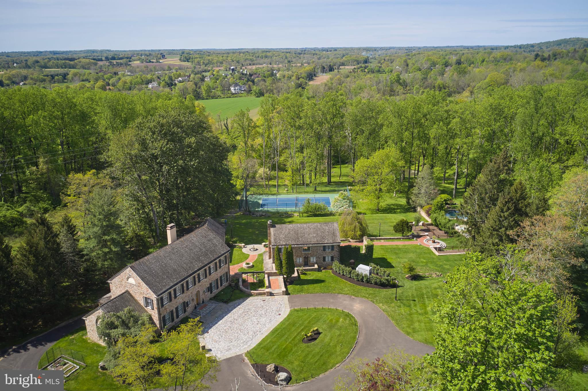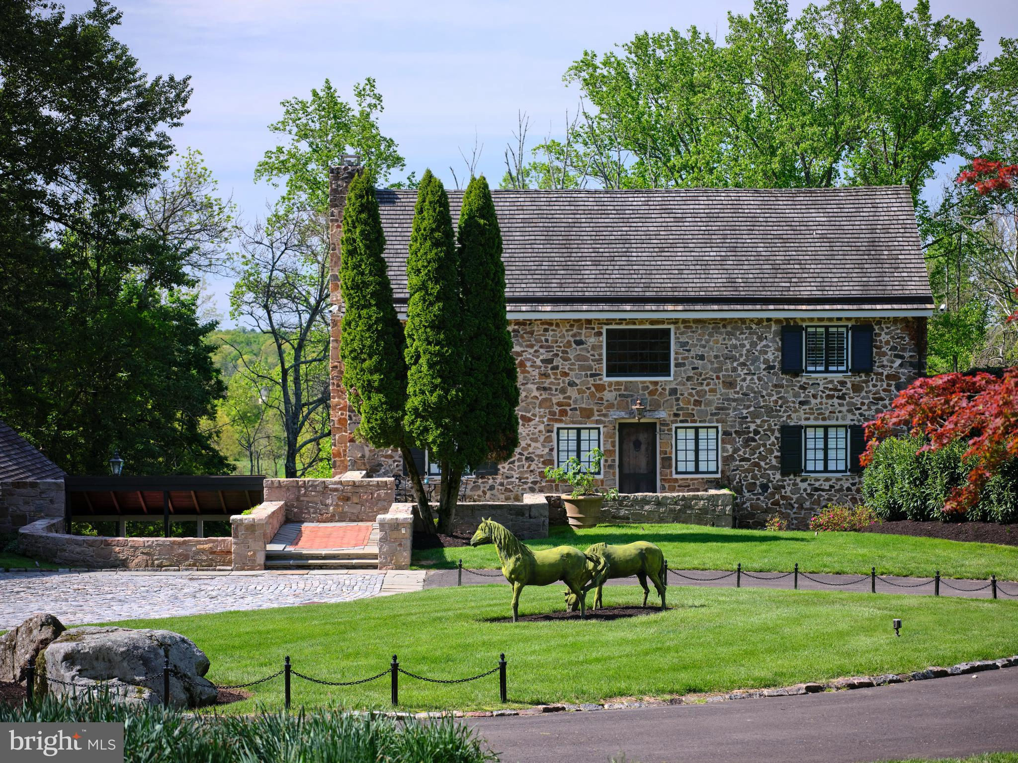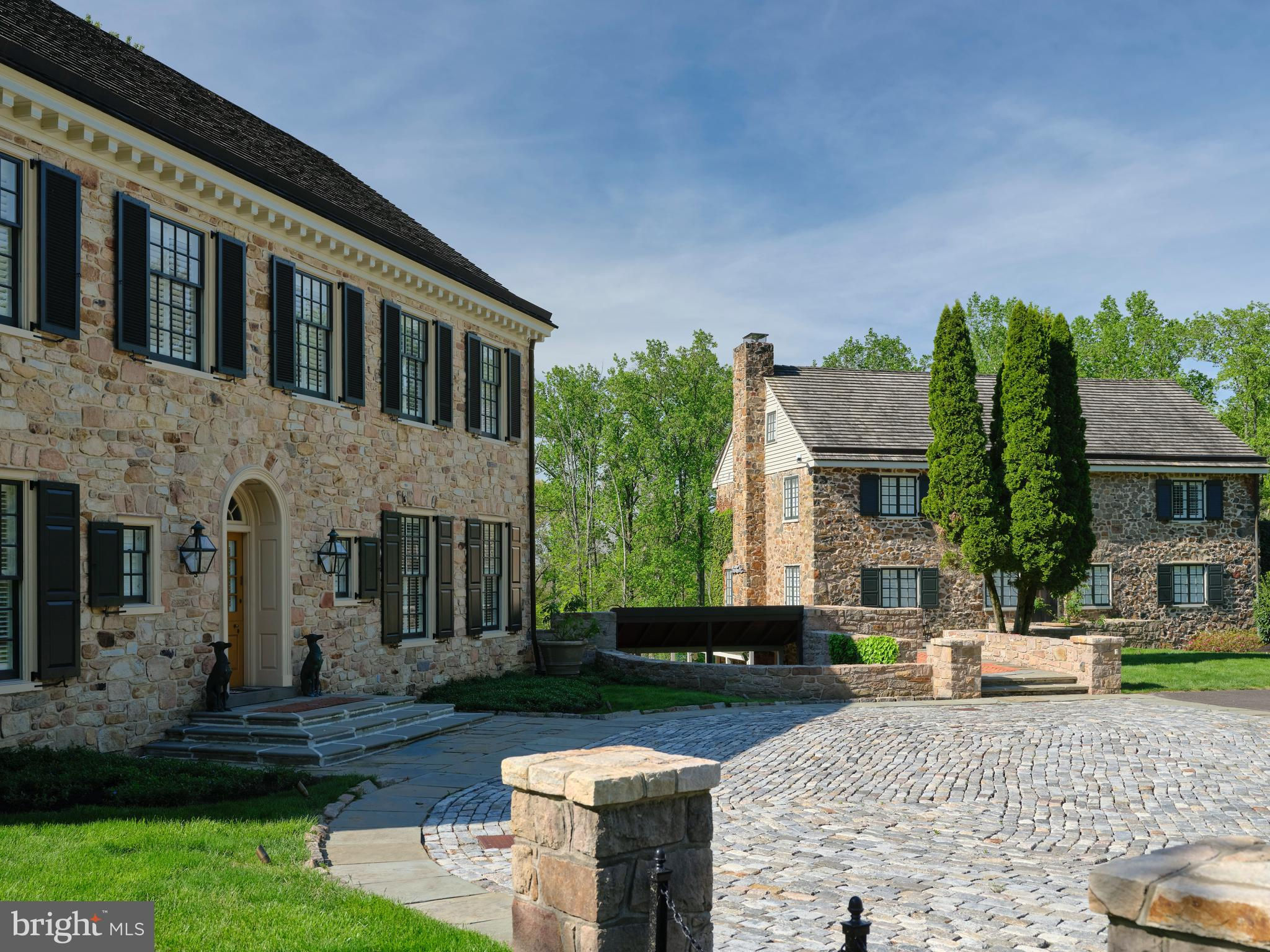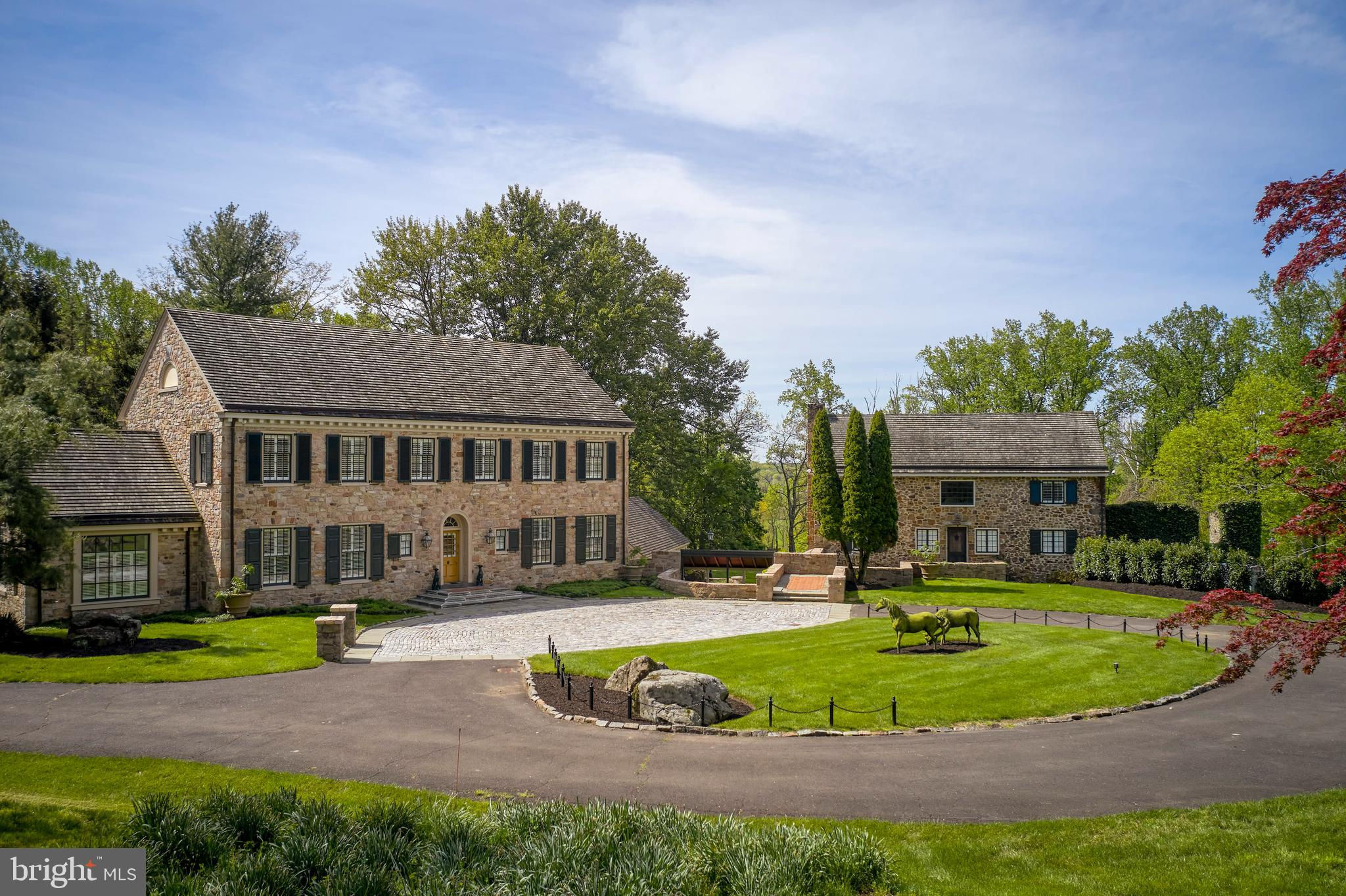 A long, private meandering drive delivers you to the newly renovated and reimagined Bramingham Estate,…arguably one of the more beautiful estate properties in Solebury. The commanding stone manor house sits prominently in the foreground and is flanked by an equally stately 5 bedroom/4 bathroom stone guest house. As you enter the main entrance, a grand foyer greets you with outstanding millwork in all directions. To the right is the presidential salon…a formal living room with portraits of American presidents, stately chandelier and antique fireplace. On the opposite side of this home is the morning room with built-in coffee station and an informality perfect for gatherings. The ceiling is an architectural feat of beauty and this magnificent room could be an impressive dining room, if you choose. The adjacent room is far beyond an ordinary chef’s kitchen-beautiful woodworking throughout, large granite counter space, high-end appliances and even a La Cornue wall mounted rotisserie, makes this beyond most high-end kitchens. This light-filled space is inviting to all chef’s and want to be chefs. Off of the hall, is an inviting office space that can serve as T.V. room or library. A beautifully constructed staircase leads to the primary en suite and two other bedrooms. The lower level boasts a studio space or activity room and a full bath, greenhouse and murphy bed. This level also contains a laundry room, wine cellar, sauna and mechanicals. The very special guest house has the feel of a lodge with open space on the first level and 5 bedrooms, 4 bathrooms and a newly refurbished kitchen. The fireplace adds the extra charm that your family or guests will cherish. The grounds have been impeccably maintained with lush lawns, specimen plantings, stone walks, sculpture, large planters, fountain and stone ruins for al fresco dining. The brick paths lead to the spa-like crystal clean concrete pool. The large patio space encourages outdoor entertaining. The pool house contains his and her changing rooms and baths, a full caretaker or Au Pair suite and rough plumbing exists for a pool kitchen or caretaker’s kitchen. The 11 acre property also has a game ready tennis court and a bucolic pond. Bramingham is a property that offers the privacy one rarely finds today and the evolution and design of structures and natural settings that grow organically from each other. The property is protected by a state of the art security system. Note: The size of the Manor Home is 5,175.80 sq. ft. The Guest Cottage is 2,190 Sq. ft. and the pool house is 831.1 square feet. Perfect Family Compound. Must have Buyer financials prior to showing, 48 Hours notice required for all showings. ***Property is being sold "As-Is.” Buyers are encouraged to do all inspections and financing prior to making an offer. Note: The size of the Manor Home is 5,175.80 sq. ft. The Guest Cottage is 2,190 Sq. ft. and the pool house is 831.1 square feet.