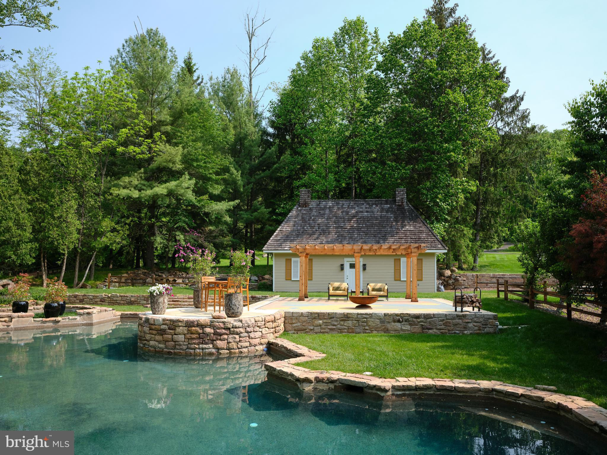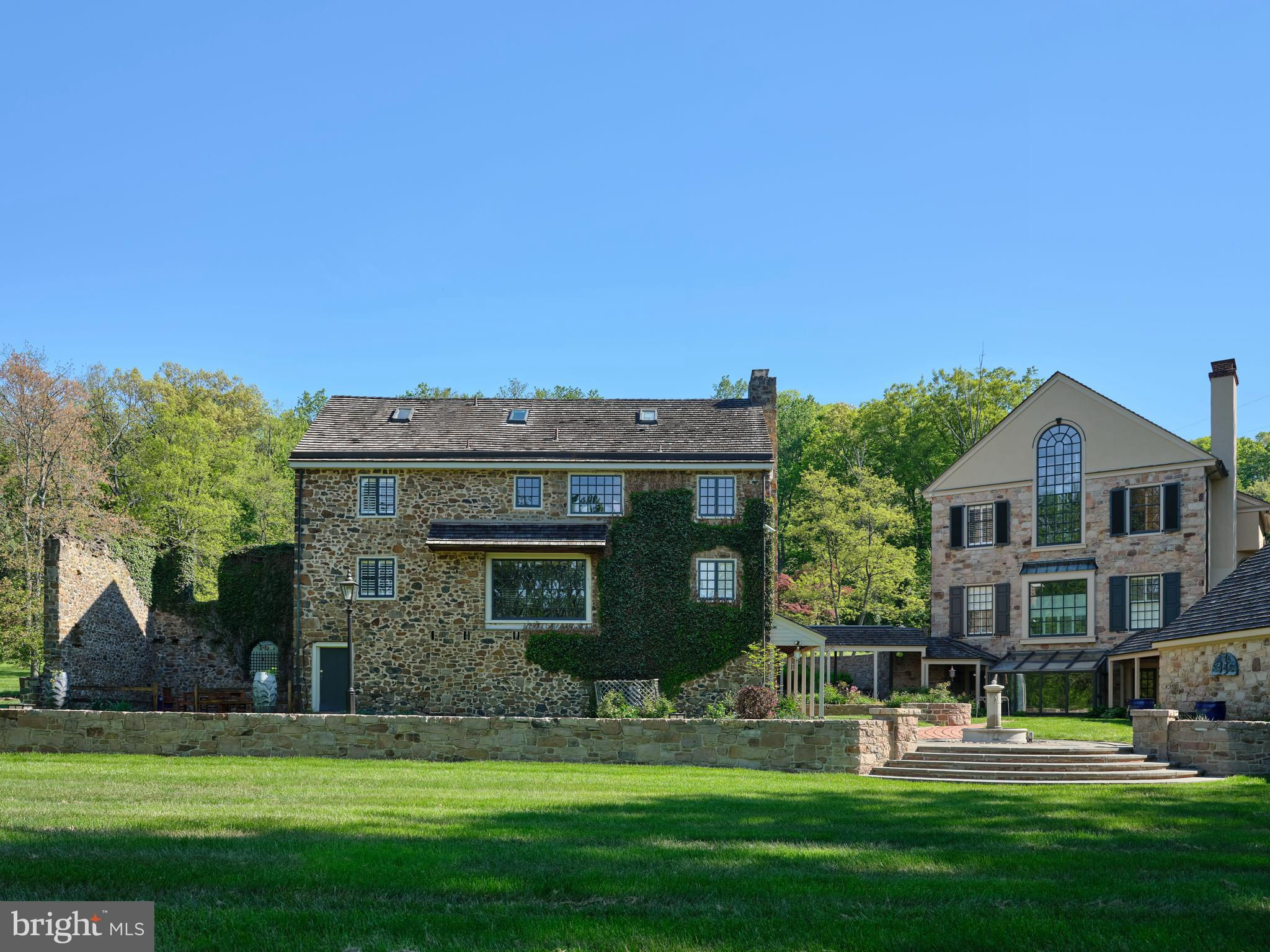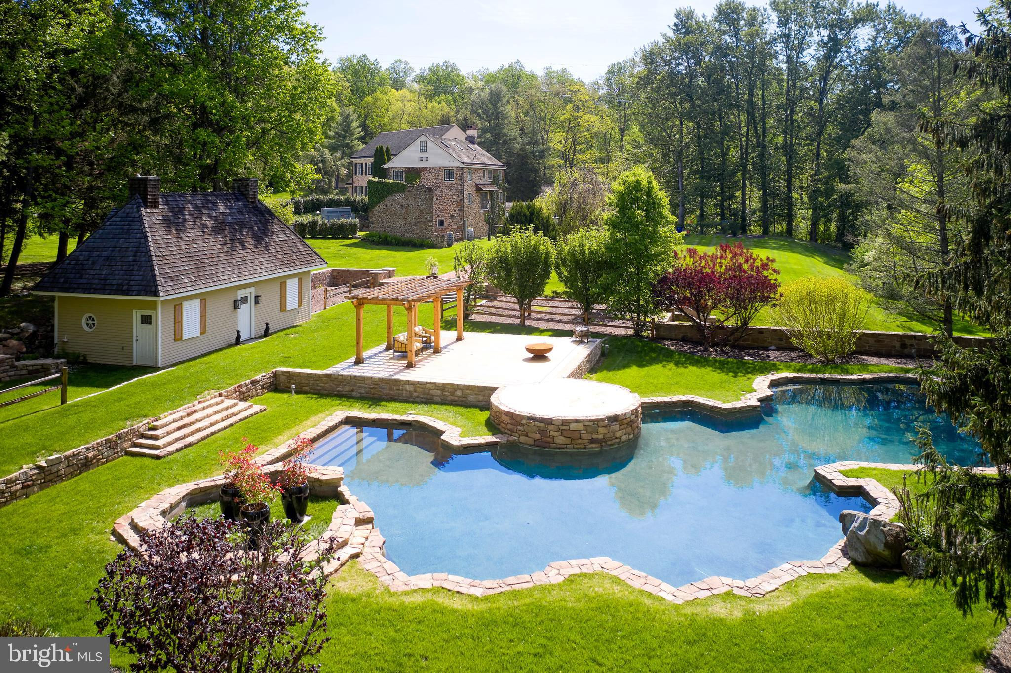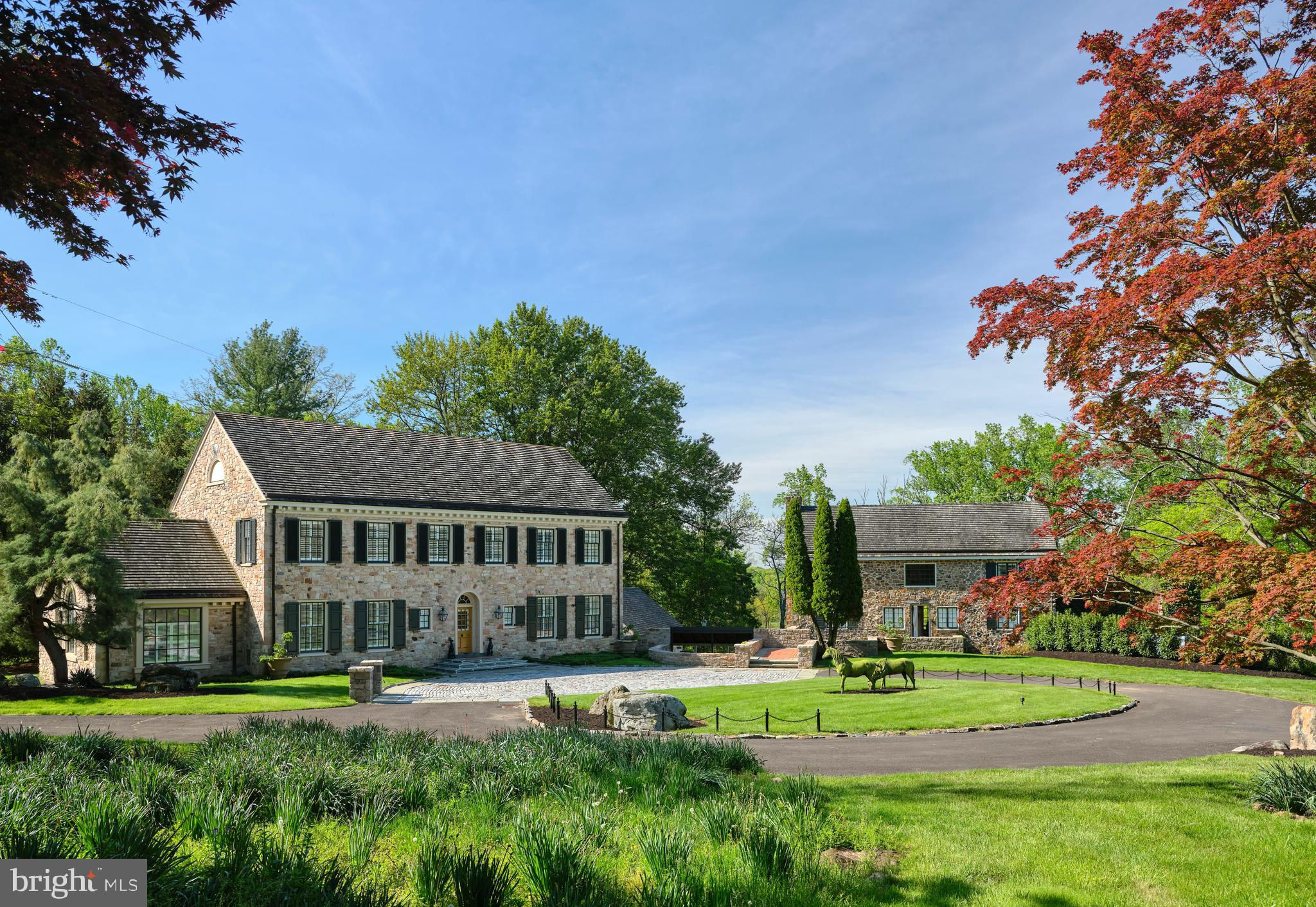 A long, private meandering drive delivers you to the newly renovated and reimagined Bramingham Estate,…arguably one of the more beautiful estate properties in Solebury. The commanding stone manor house sits prominently in the foreground and is flanked by an equally stately 5 bedroom/4 bathroom stone guest house. As you enter the main entrance, a grand foyer greets you with outstanding millwork in all directions. To the right is the presidential salon…a formal living room with portraits of American presidents, stately chandelier and antique fireplace. On the opposite side of this home is the morning room with built-in coffee station and an informality perfect for gatherings. The ceiling is an architectural feat of beauty and this magnificent room could be an impressive dining room, if you choose. The adjacent room is far beyond an ordinary chef’s kitchen-beautiful woodworking throughout, large granite counter space, high-end appliances and even a La Cornue wall mounted rotisserie, makes this beyond most high-end kitchens. This light-filled space is inviting to all chef’s and want to be chefs. Off of the hall, is an inviting office space that can serve as T.V. room or library. A beautifully constructed staircase leads to the primary en suite and two other bedrooms. The lower level boasts a studio space or activity room and a full bath, greenhouse and murphy bed. This level also contains a laundry room, wine cellar, sauna and mechanicals. The very special guest house has the feel of a lodge with open space on the first level and 5 bedrooms, 4 bathrooms and a newly refurbished kitchen. The fireplace adds the extra charm that your family or guests will cherish. The grounds have been impeccably maintained with lush lawns, specimen plantings, stone walks, sculpture, large planters, fountain and stone ruins for al fresco dining. The brick paths lead to the spa-like crystal clean concrete pool. The large patio space encourages outdoor entertaining. The pool house contains his and her changing rooms and baths, a full caretaker or Au Pair suite and rough plumbing exists for a pool kitchen or caretaker’s kitchen. The 11 acre property also has a game ready tennis court and a bucolic pond. Bramingham is a property that offers the privacy one rarely finds today and the evolution and design of structures and natural settings that grow organically from each other. The property is protected by a state of the art security system. Note: The size of the Manor Home is 5,175.80 sq. ft. The Guest Cottage is 2,190 Sq. ft. and the pool house is 831.1 square feet. Perfect Family Compound. Must have Buyer financials prior to showing, 48 Hours notice required for all showings. ***Property is being sold "As-Is.” Buyers are encouraged to do all inspections and financing prior to making an offer. Note: The size of the Manor Home is 5,175.80 sq. ft. The Guest Cottage is 2,190 Sq. ft. and the pool house is 831.1 square feet.