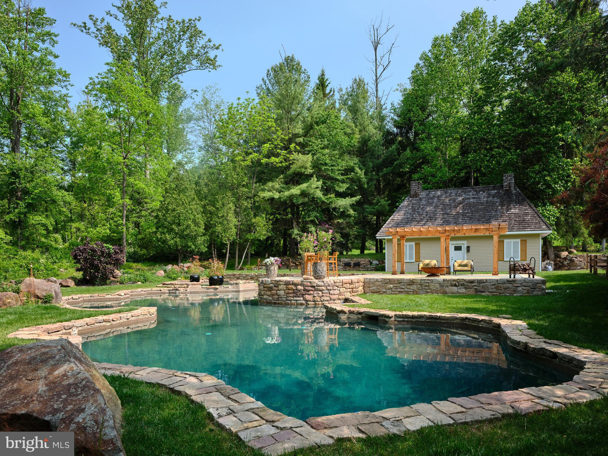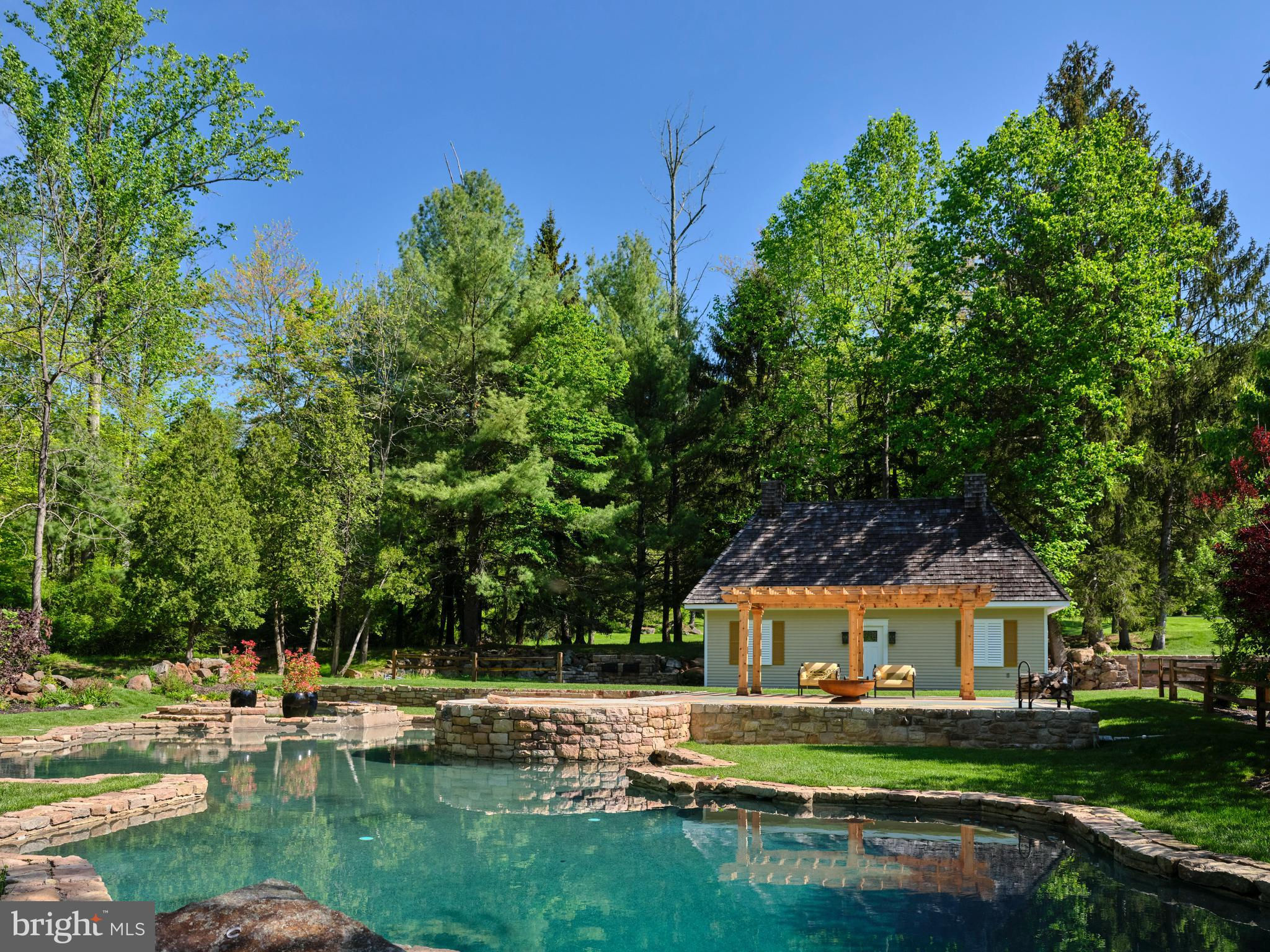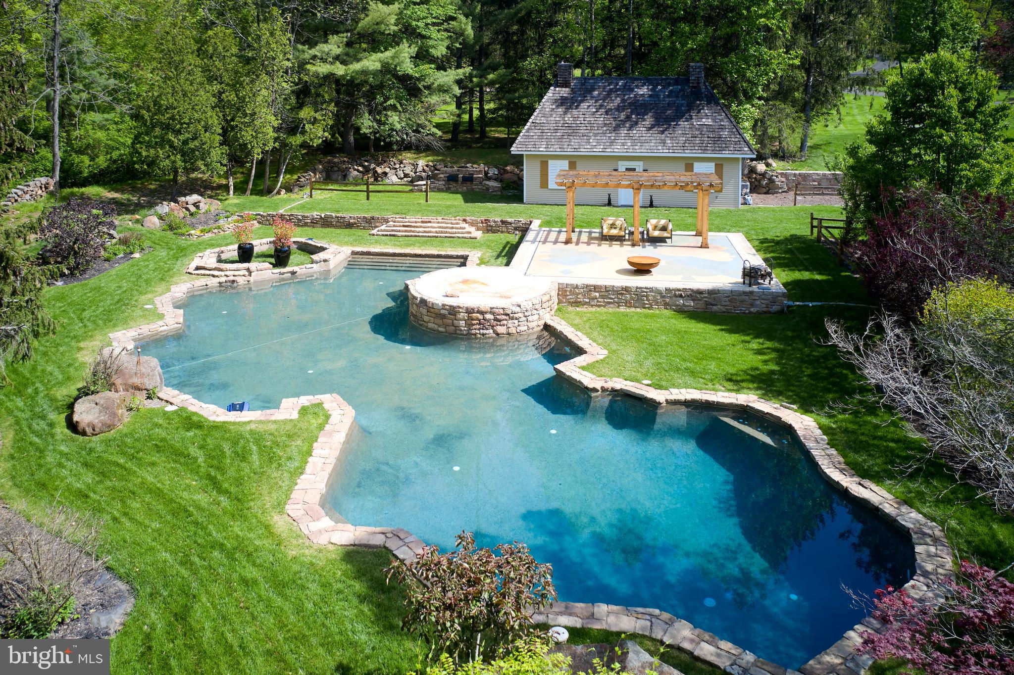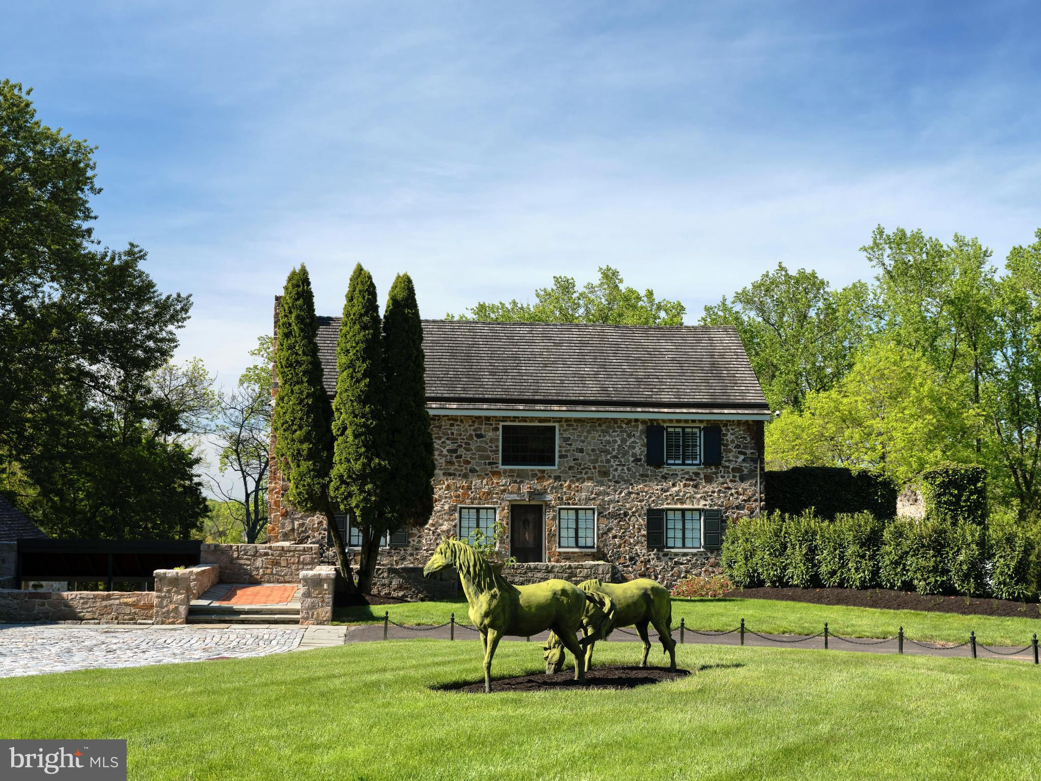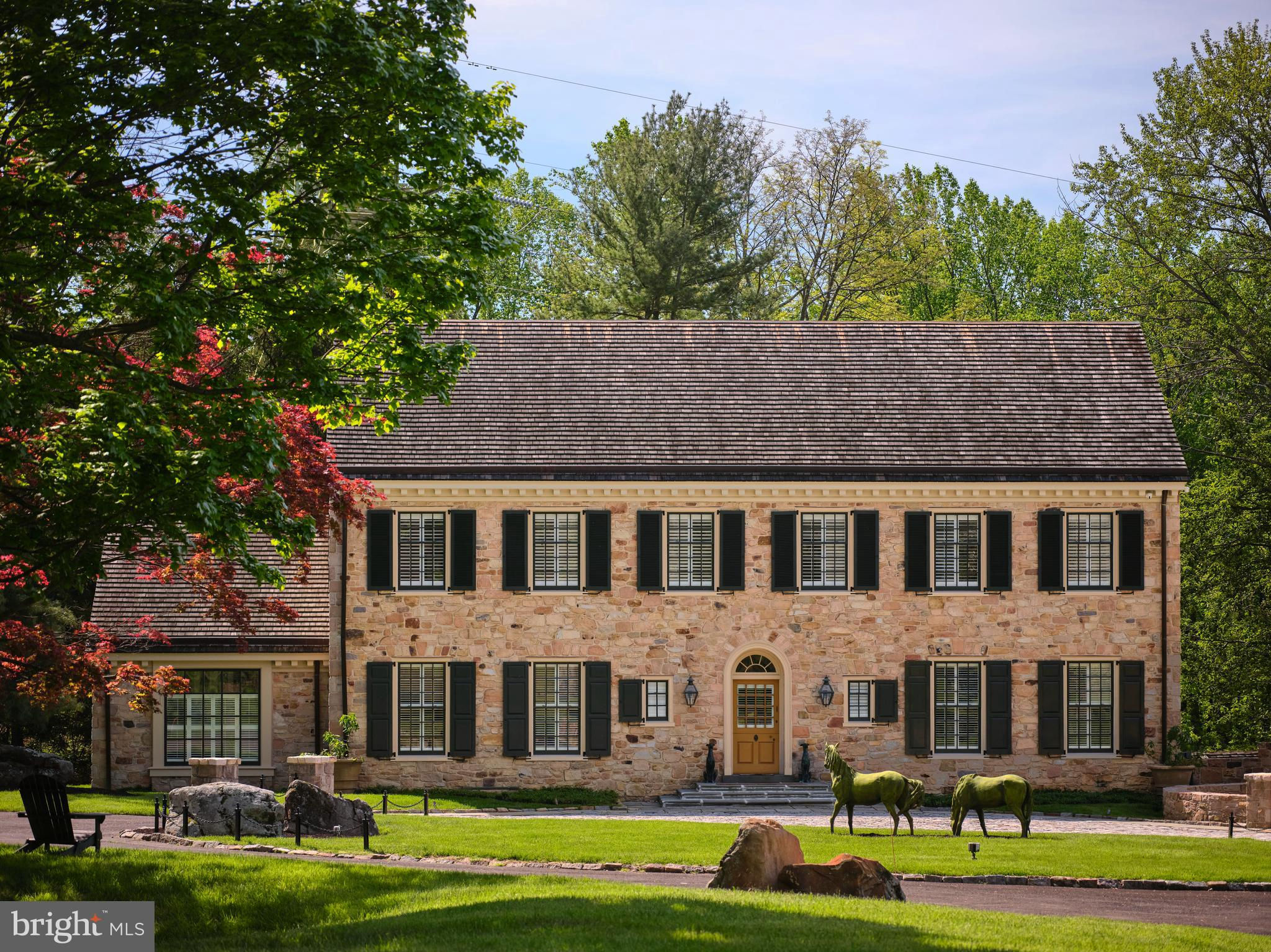 A long, private meandering drive delivers you to the newly renovated and reimagined Bramingham Estate,…arguably one of the more beautiful estate properties in Solebury. The commanding stone manor house sits prominently in the foreground and is flanked by an equally stately 5 bedroom/4 bathroom stone guest house. As you enter the main entrance, a grand foyer greets you with outstanding millwork in all directions. To the right is the presidential salon…a formal living room with portraits of American presidents, stately chandelier and antique fireplace. On the opposite side of this home is the morning room with built-in coffee station and an informality perfect for gatherings. The ceiling is an architectural feat of beauty and this magnificent room could be an impressive dining room, if you choose. The adjacent room is far beyond an ordinary chef’s kitchen-beautiful woodworking throughout, large granite counter space, high-end appliances and even a La Cornue wall mounted rotisserie, makes this beyond most high-end kitchens. This light-filled space is inviting to all chef’s and want to be chefs. Off of the hall, is an inviting office space that can serve as T.V. room or library. A beautifully constructed staircase leads to the primary en suite and two other bedrooms. The lower level boasts a studio space or activity room and a full bath, greenhouse and murphy bed. This level also contains a laundry room, wine cellar, sauna and mechanicals. The very special guest house has the feel of a lodge with open space on the first level and 5 bedrooms, 4 bathrooms and a newly refurbished kitchen. The fireplace adds the extra charm that your family or guests will cherish. The grounds have been impeccably maintained with lush lawns, specimen plantings, stone walks, sculpture, large planters, fountain and stone ruins for al fresco dining. The brick paths lead to the spa-like crystal clean concrete pool. The large patio space encourages outdoor entertaining. The pool house contains his and her changing rooms and baths, a full caretaker or Au Pair suite and rough plumbing exists for a pool kitchen or caretaker’s kitchen. The 11 acre property also has a game ready tennis court and a bucolic pond. Bramingham is a property that offers the privacy one rarely finds today and the evolution and design of structures and natural settings that grow organically from each other. The property is protected by a state of the art security system. Note: The size of the Manor Home is 5,175.80 sq. ft. The Guest Cottage is 2,190 Sq. ft. and the pool house is 831.1 square feet. Perfect Family Compound. Must have Buyer financials prior to showing, 48 Hours notice required for all showings. ***Property is being sold "As-Is.” Buyers are encouraged to do all inspections and financing prior to making an offer. Note: The size of the Manor Home is 5,175.80 sq. ft. The Guest Cottage is 2,190 Sq. ft. and the pool house is 831.1 square feet.