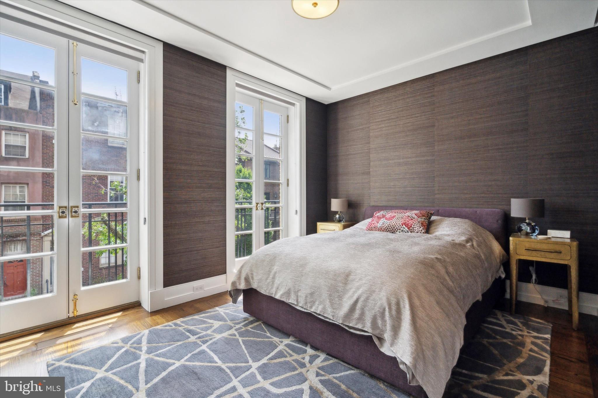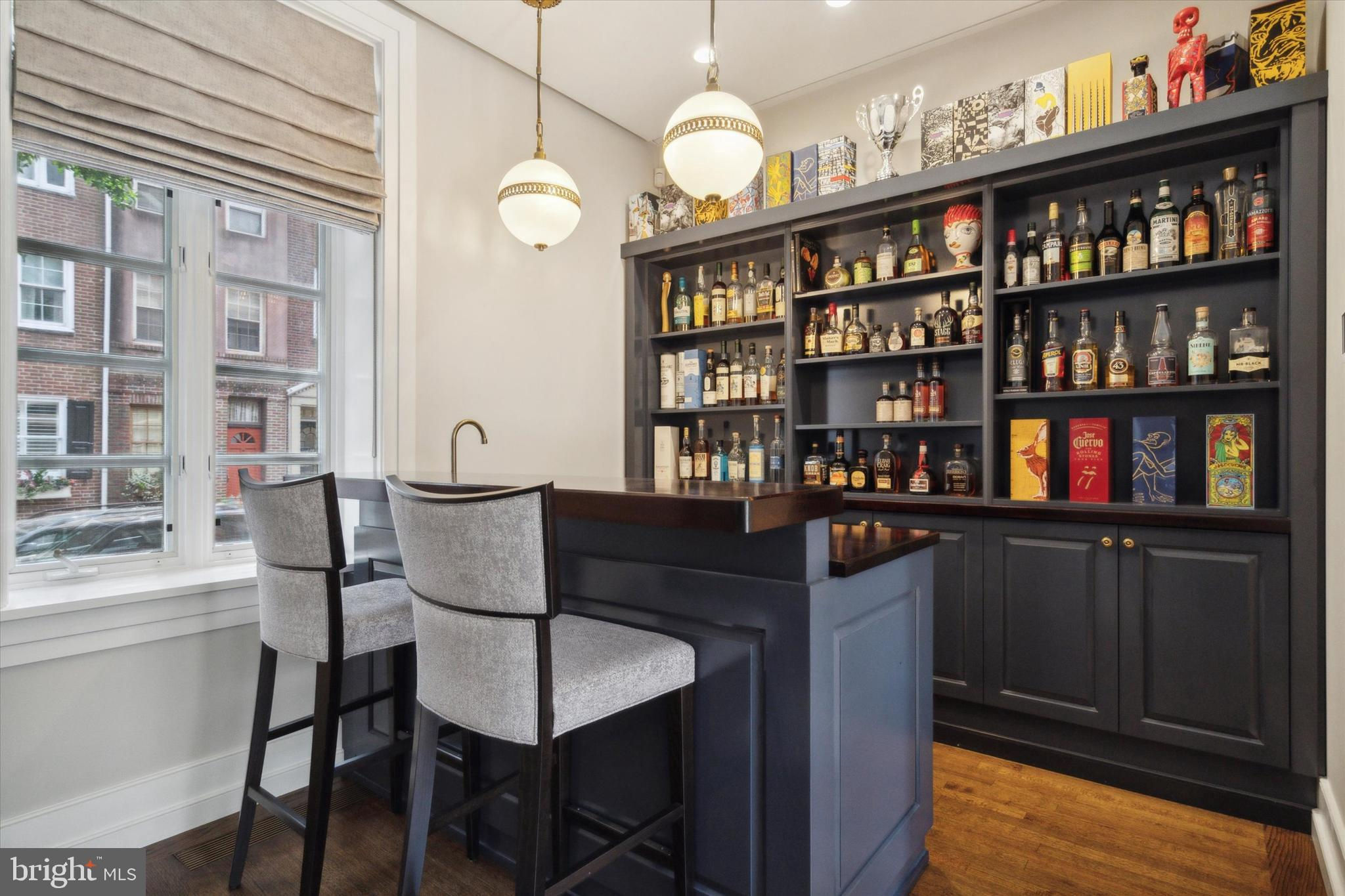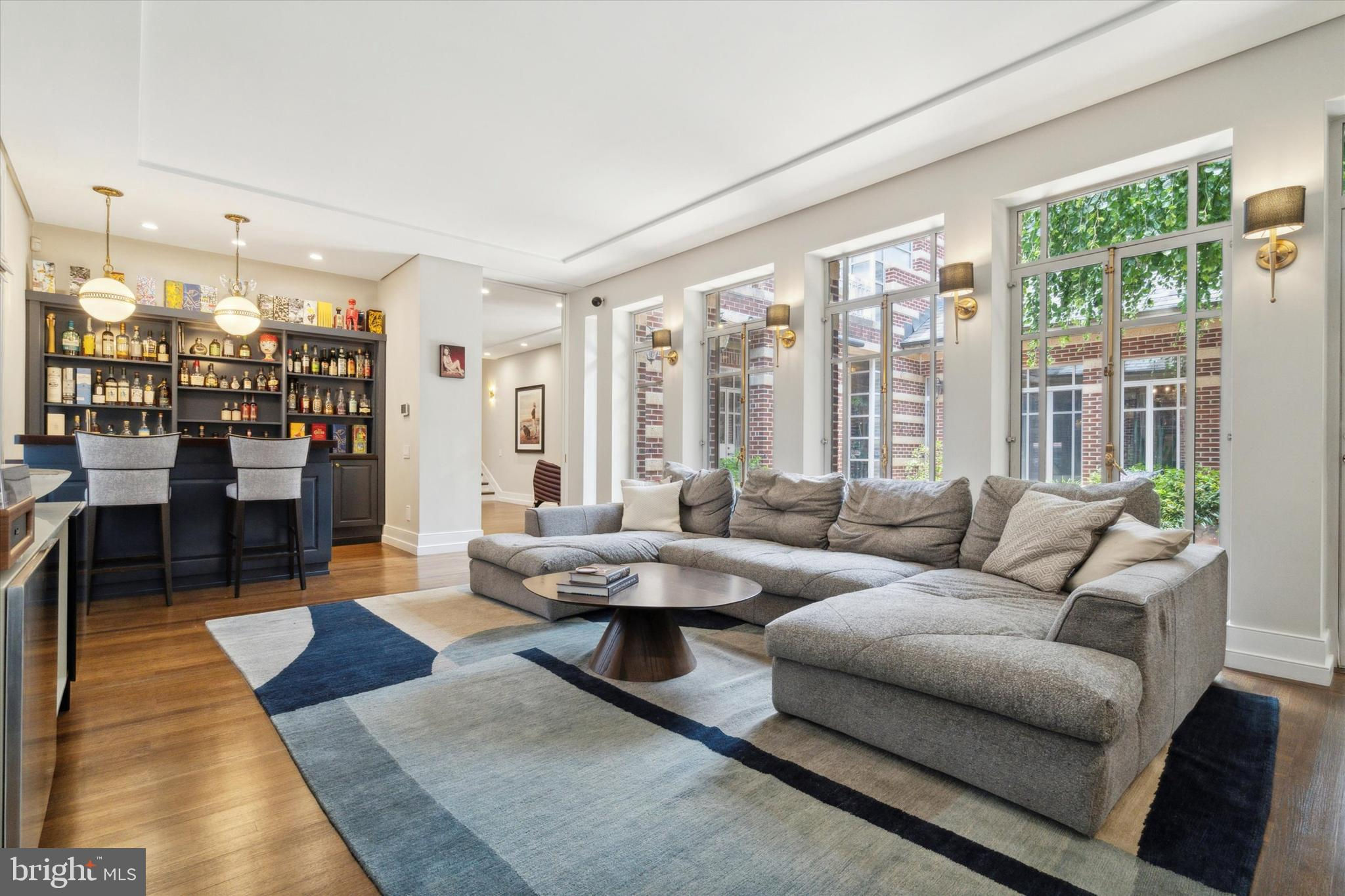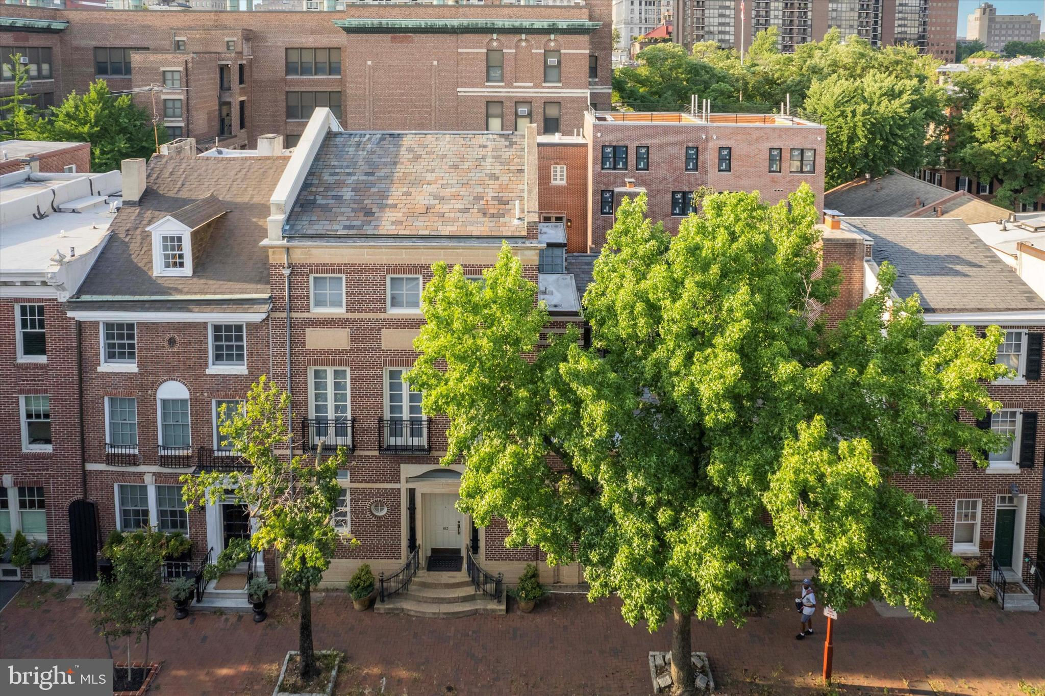 Step into luxury with this stunning 6 bed, 6.5 bath home located in the prestigious Society Hill neighborhood. Situated on an expansive 58x100ft lot, this property offers covered 2-car parking, 2 outdoor spaces, and a newly constructed carriage house with 1 bedroom, 1.5 bathrooms, and 2 elevators, one in each home. The primary home has undergone a meticulous renovation, with brand new mechanicals, a modern kitchen, updated bathrooms, refinished flooring, new lighting, and custom molding throughout. Upon entry, you'll be greeted by a grand foyer featuring marble checkered floors and a convenient half bath. The foyer opens to an impressive spiral staircase and chandelier. To the right find the living room with an ornate wood-burning fireplace, a built-in custom mahogany bar with seating, and a Sub Zero wine fridge. Natural light floods the space from the south-facing windows and a full wall of windows that overlook the private center courtyard. Moving through the home, you'll discover a formal dining room with plenty of space to host and a library with custom built-ins complete with a second wood-burning fireplace. The eat-in kitchen is a chef's dream, boasting top-of-the-line appliances, soft-close walnut cabinetry, quartzite countertops, and a walk-in pantry. The kitchen seamlessly flows out to a meticulously landscaped patio, perfect for entertaining, as well as a 2-car covered garage that leads to the carriage house. Ascending the spiral staircase to the second level, you'll find an open sitting area, and sun-soaked bedroom with French door Juliet balconies and an en-suite bath. The primary bedroom offers a balcony overlooking the courtyard, two walk-in closets both with custom cabinetry, and a luxurious en-suite bath with tiled floors and a fully tiled steam shower. The third level features additional bedrooms, each with its own en-suite bath and generous storage. The lower level is complete with a laundry room, playroom, sauna, wine cellar, and a guest suite with a full bathroom. Primary bathroom and all 3rd floor bathrooms feature radiant floor heating and washlet toilet seats. At the rear of the property, the carriage house offers a private retreat with convenient access from the back. As you enter from the ground level and take the stairs or the elevator, you'll discover an inviting open concept living space. Step into the brand new kitchen with stone countertops, bar seating, and ample cabinetry with soft-close features. The kitchen is equipped with a paneled Sub Zero fridge, a paneled Bosch dishwasher, and a Miele range and oven. Ascending the stairs, you'll find a walk-in closet for storage and a well-appointed bedroom with an additional spacious walk-in closet. A hallway with built-ins adds to the convenience and organization of the space. The bedroom boasts an ensuite bath featuring a porcelain tiled shower and floors, a rain shower head, and a linen closet. This carriage house epitomizes modern comfort and sophistication in the heart of the city!