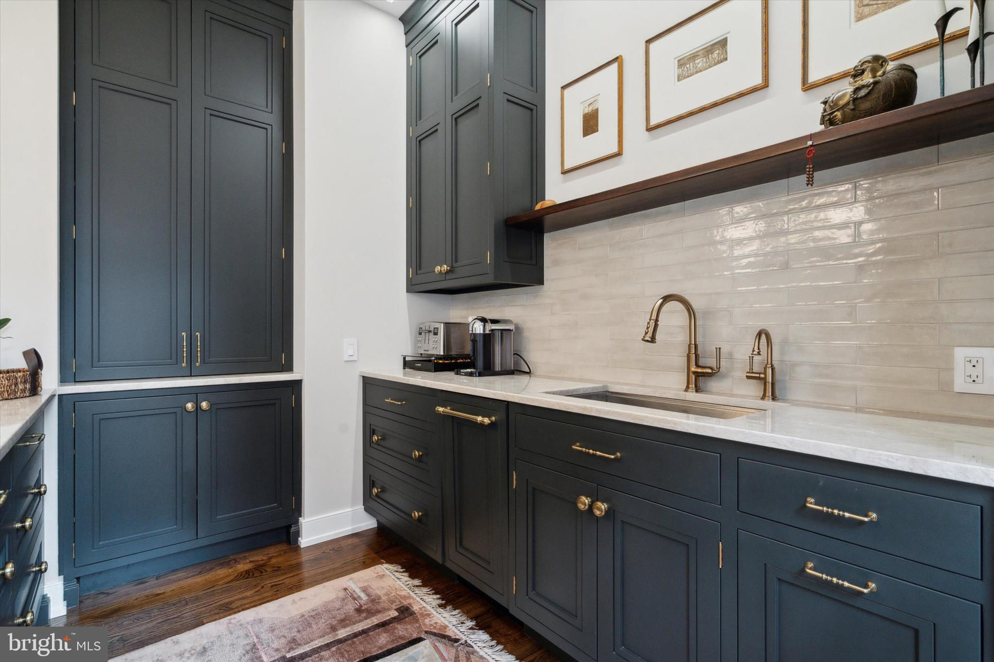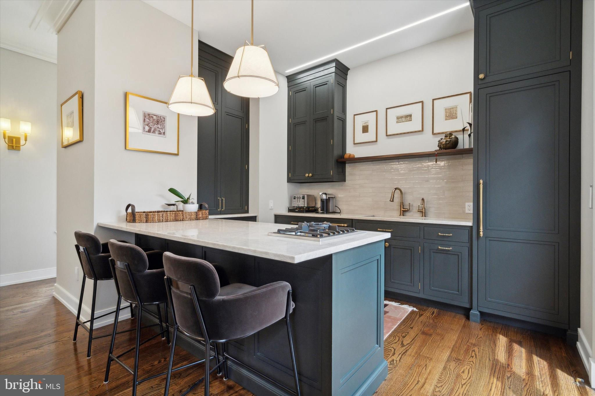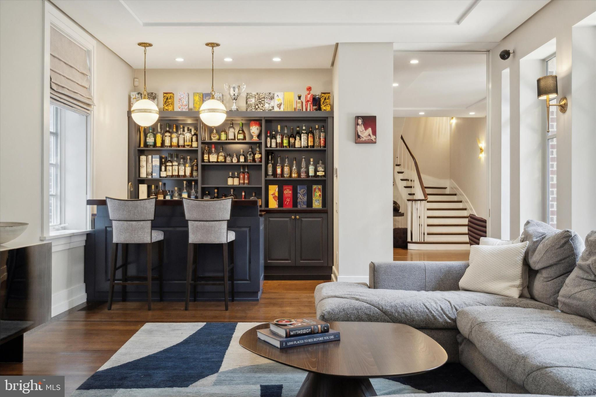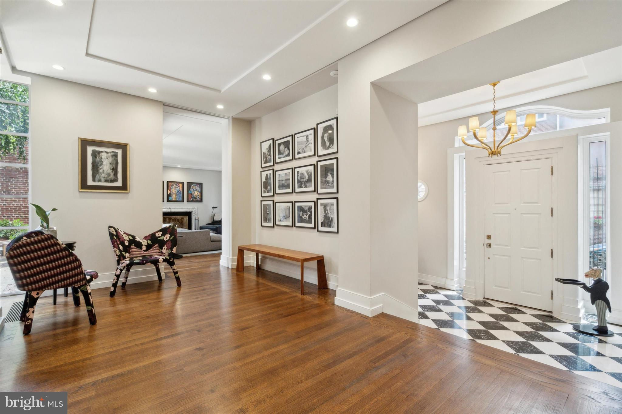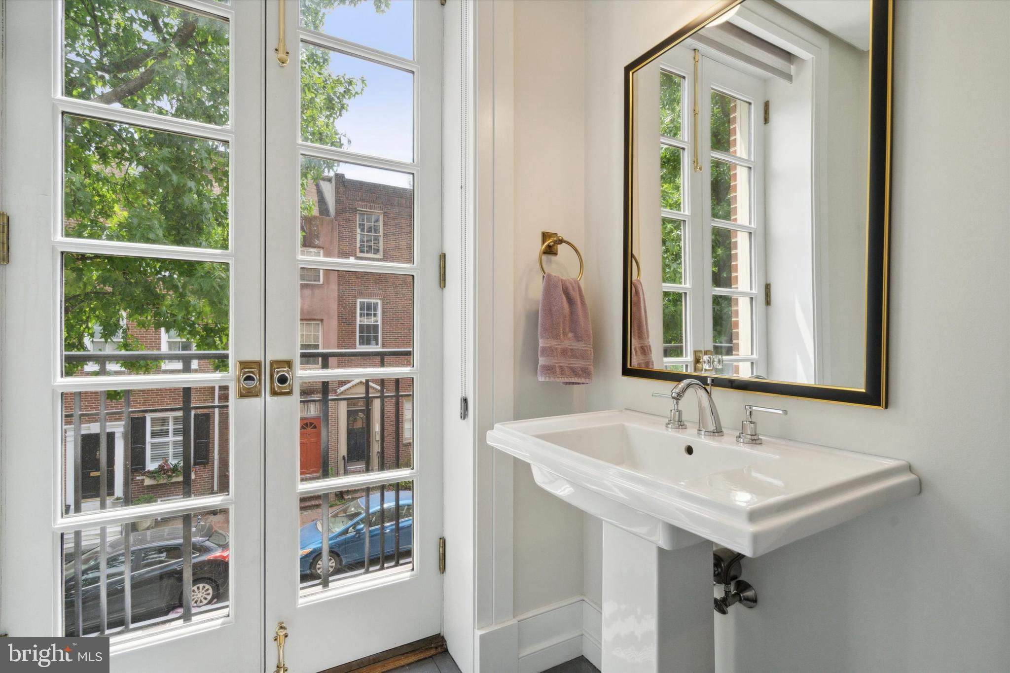 Step into luxury with this stunning 6 bed, 6.5 bath home located in the prestigious Society Hill neighborhood. Situated on an expansive 58x100ft lot, this property offers covered 2-car parking, 2 outdoor spaces, and a newly constructed carriage house with 1 bedroom, 1.5 bathrooms, and 2 elevators, one in each home. The primary home has undergone a meticulous renovation, with brand new mechanicals, a modern kitchen, updated bathrooms, refinished flooring, new lighting, and custom molding throughout. Upon entry, you'll be greeted by a grand foyer featuring marble checkered floors and a convenient half bath. The foyer opens to an impressive spiral staircase and chandelier. To the right find the living room with an ornate wood-burning fireplace, a built-in custom mahogany bar with seating, and a Sub Zero wine fridge. Natural light floods the space from the south-facing windows and a full wall of windows that overlook the private center courtyard. Moving through the home, you'll discover a formal dining room with plenty of space to host and a library with custom built-ins complete with a second wood-burning fireplace. The eat-in kitchen is a chef's dream, boasting top-of-the-line appliances, soft-close walnut cabinetry, quartzite countertops, and a walk-in pantry. The kitchen seamlessly flows out to a meticulously landscaped patio, perfect for entertaining, as well as a 2-car covered garage that leads to the carriage house. Ascending the spiral staircase to the second level, you'll find an open sitting area, and sun-soaked bedroom with French door Juliet balconies and an en-suite bath. The primary bedroom offers a balcony overlooking the courtyard, two walk-in closets both with custom cabinetry, and a luxurious en-suite bath with tiled floors and a fully tiled steam shower. The third level features additional bedrooms, each with its own en-suite bath and generous storage. The lower level is complete with a laundry room, playroom, sauna, wine cellar, and a guest suite with a full bathroom. Primary bathroom and all 3rd floor bathrooms feature radiant floor heating and washlet toilet seats. At the rear of the property, the carriage house offers a private retreat with convenient access from the back. As you enter from the ground level and take the stairs or the elevator, you'll discover an inviting open concept living space. Step into the brand new kitchen with stone countertops, bar seating, and ample cabinetry with soft-close features. The kitchen is equipped with a paneled Sub Zero fridge, a paneled Bosch dishwasher, and a Miele range and oven. Ascending the stairs, you'll find a walk-in closet for storage and a well-appointed bedroom with an additional spacious walk-in closet. A hallway with built-ins adds to the convenience and organization of the space. The bedroom boasts an ensuite bath featuring a porcelain tiled shower and floors, a rain shower head, and a linen closet. This carriage house epitomizes modern comfort and sophistication in the heart of the city!