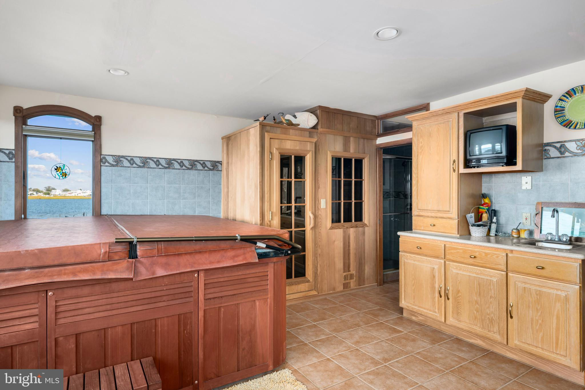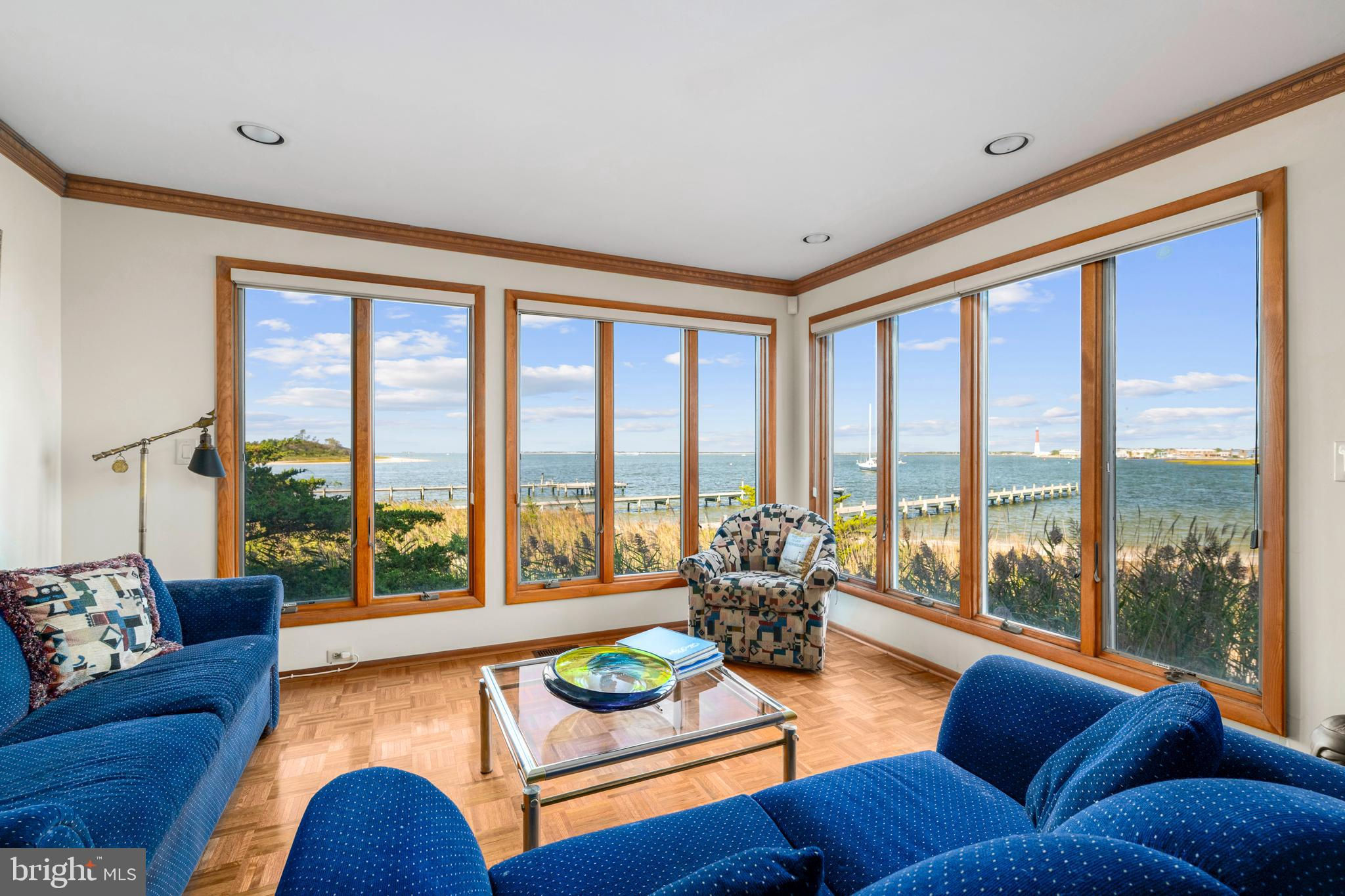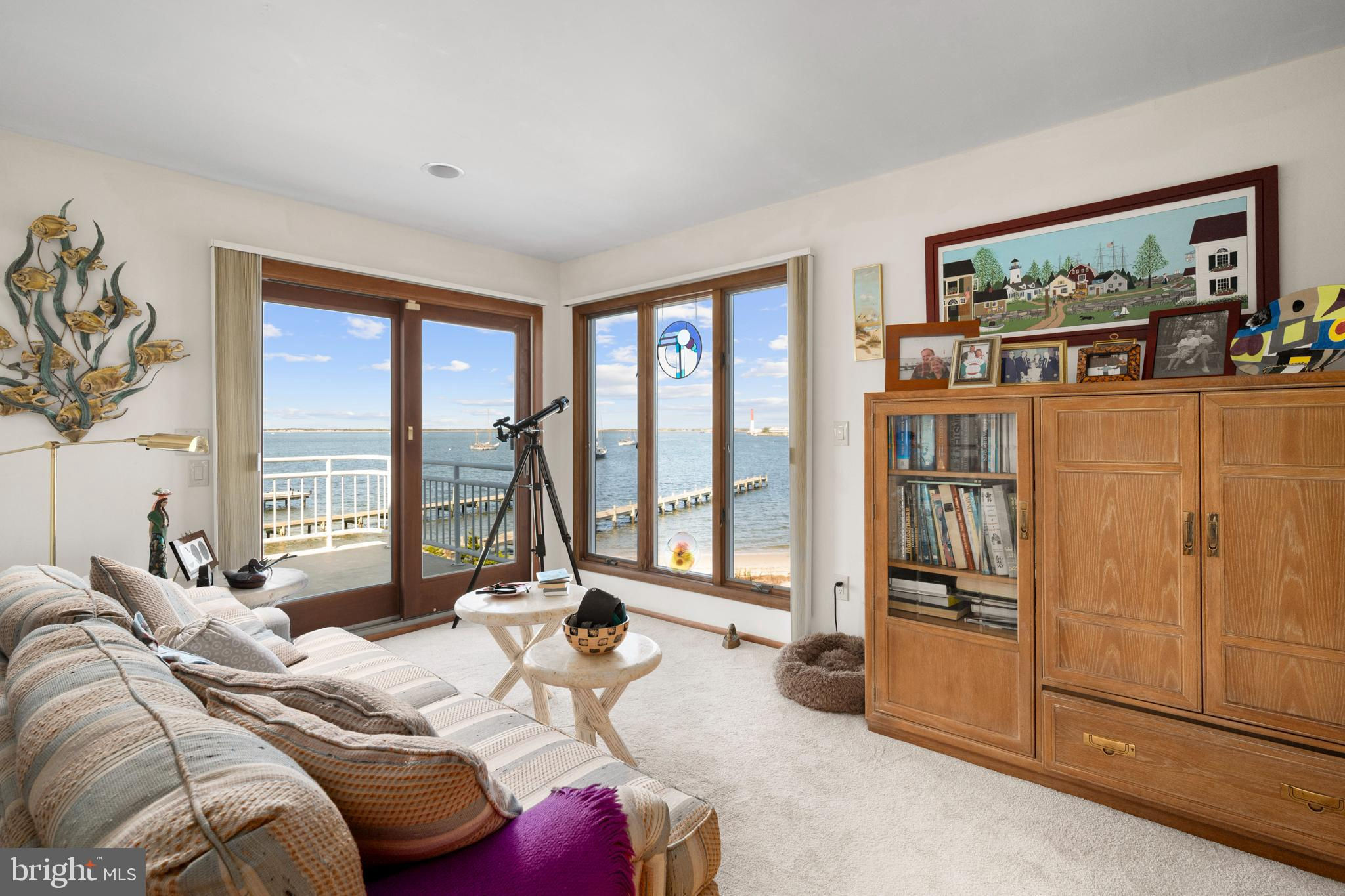 BAYFRONT - HIGH BAR HARBOR: Enjoy the most nautical and fascinating views available on LBI from this superior bayfront location on a giant-sized lot. Direct views of Barnegat Lighthouse, Barnegat Inlet, the wildlife refuge, Island Beach State Park, the harbor and more! More than 200' of pristine white sandy beach and the bay frontage at the end of the huge riparian grant is 331'! Renovate/update in place or build new. The existing living space footprint is approximately 2100sq' plus 430sq' of elevated deck footprint with plenty of room for westward expansion too. Home features 4 bedrooms, 2.5 baths, great room with dining area and granite topped kitchen, large family room with fireplace and vaulted ceiling, den, huge primary suite with phenomenal views, and a spa room with sauna, hot tub, and wet bar. Outdoor features include a large brick paved courtyard and driveway, attractive irrigated landscaping, and private driving easement. A more interesting and beautiful view does not exist!