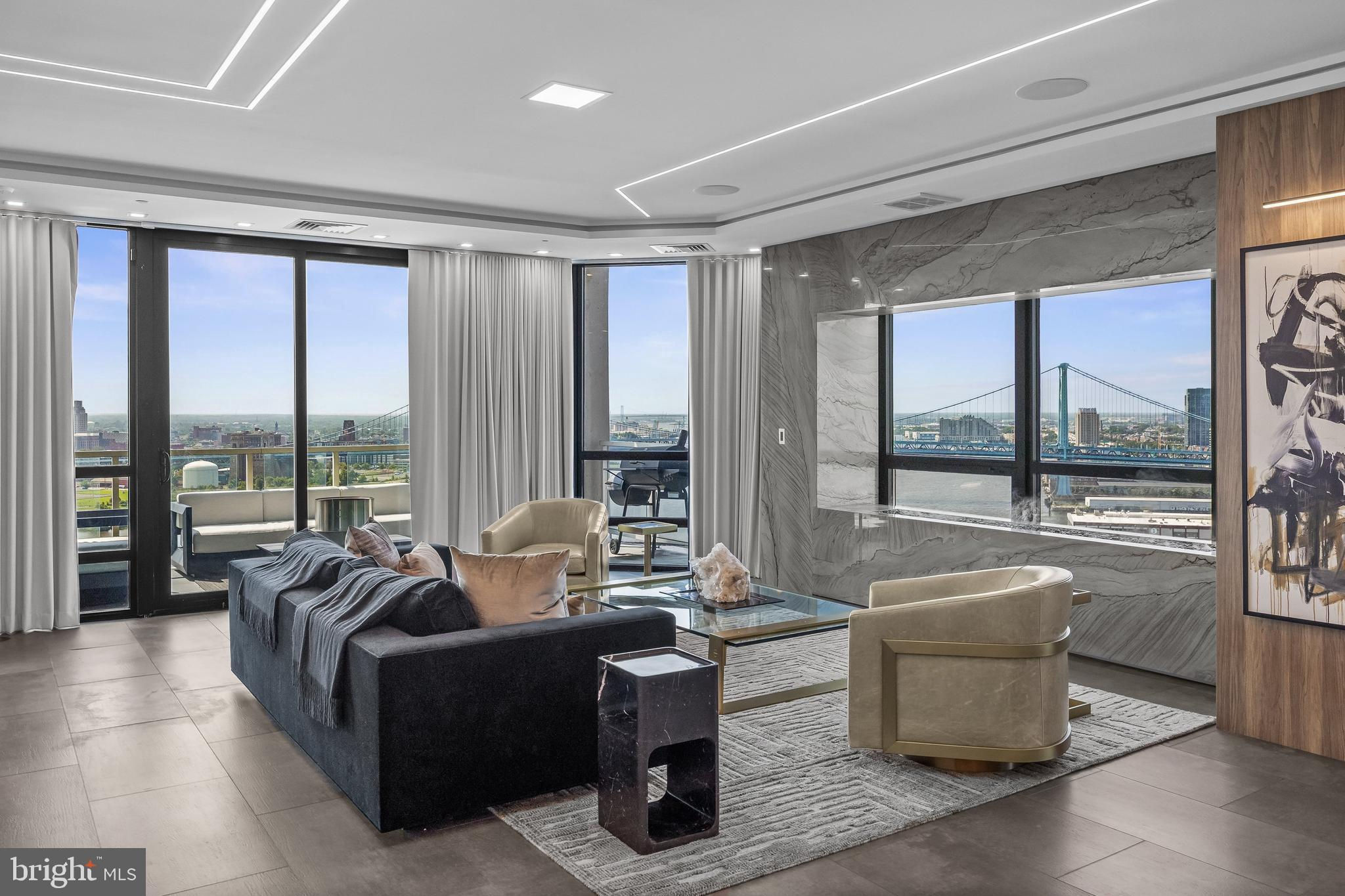 Exquisite and once-in-a-lifetime opportunity to own the largest penthouse home at Waterfront Square, Philadelphia's premier gated Waterfront Community. This extraordinary 5-bedroom, 7- bathroom residence has been completely reimagined-stripped to the studs and rebuilt with timeless elegance and craftmanship.Every inch of this home reflects meticulous attention to detail and uncompromising quality. Enter your private oasis directly from your elevator in a sun-drenched open-concept layout featuring stunning imported Brazilian tile throughout. With 360-degree views of Center City, the Delaware River, the Ben Franklin Bridge, and beyond, this sky-high sanctuary offers one of the most breathtaking vantage points in all of Philadelphia. The custom kitchen is a chef's dream with state-of-the-art appliances, sleek cabinetry, and expansive quartz countertops. Each bedroom is a private retreat with spa inspired en-suite baths, and the primary suite is a masterpiece of comfort and design Designer lighting, smart home technology, and high -end finishes are seamlessly integrated throughout. Furniture is included in the list price-just bring your personal items and begin living your dream. With over-the-top luxury and space rarely found in condo living, this "pie in the sky" penthouse redefines elevated city life. Waterfront Square offers 24/7 concierge and security, state-of-art fitness center, indoor pool, sauna, shuttle service and a riverfront walking path. Experience one of Philadelphia's newest and most vibrant neighborhoods-located in Northern Liberties yet minutes from Fishtown and Center City. Don't miss your chance to own a true Philadelphia landmark in the sky.
